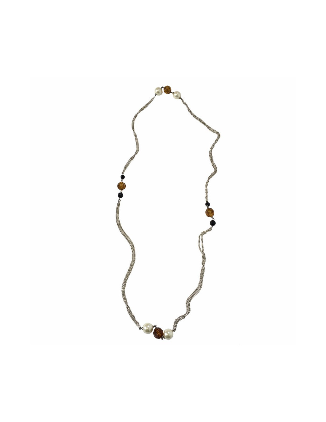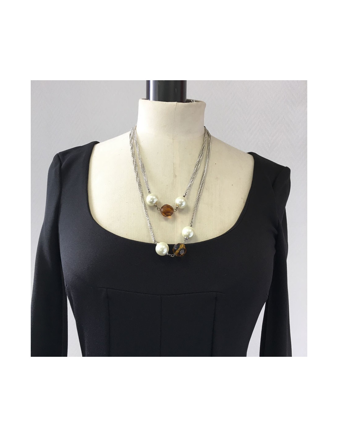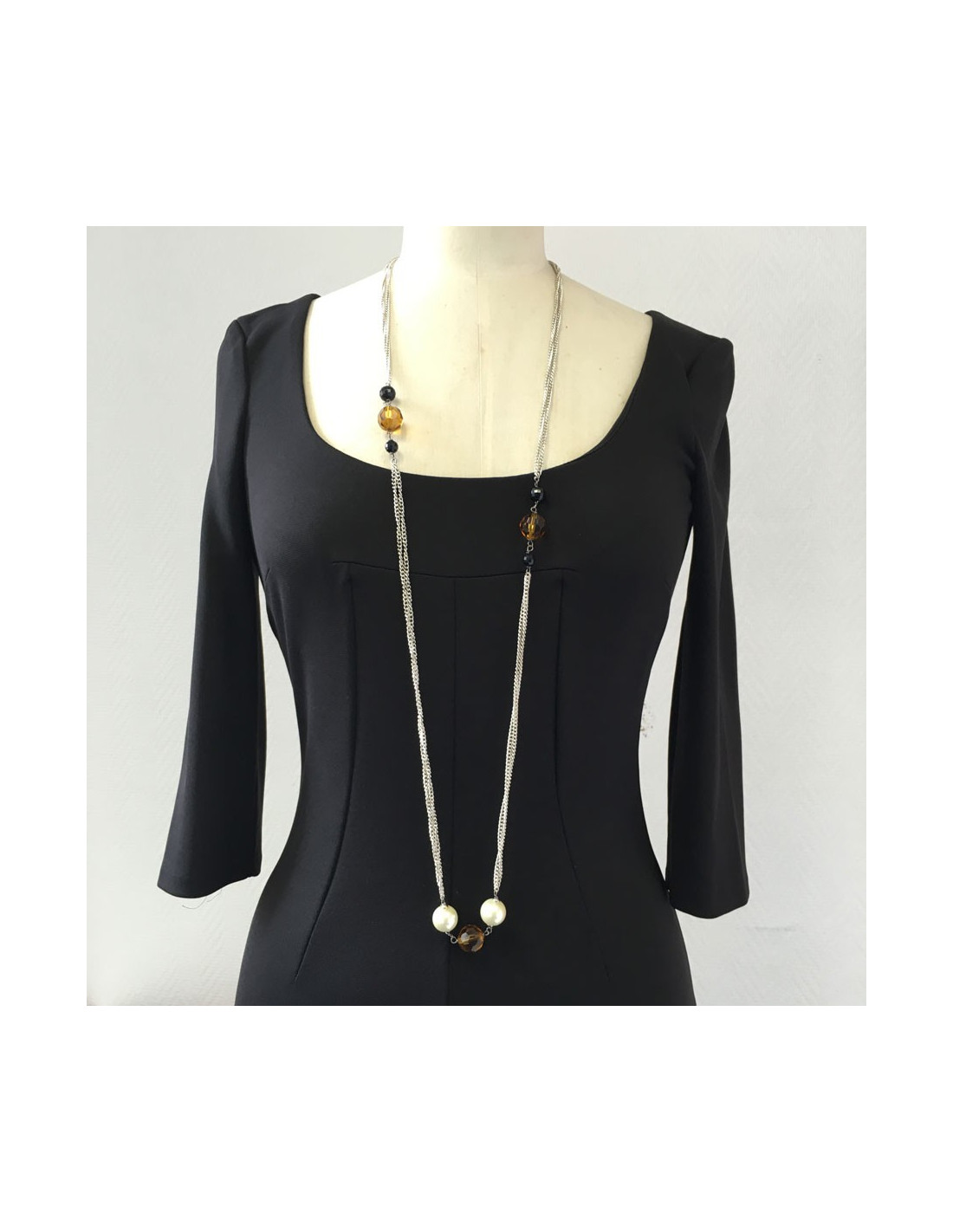 Details: Beautiful MARGUERITE DE VALOIS long necklace. Fine silver-plated double chain, 4 pearly beads, 4 faceted amber beads and 4 faceted black beads. This necklace can be worn as a single or double row.