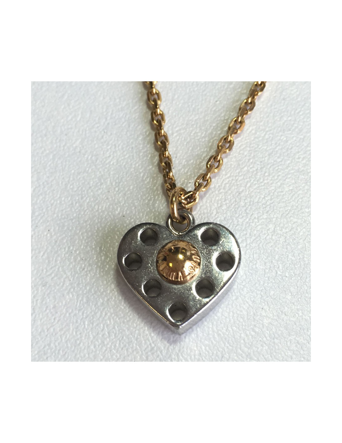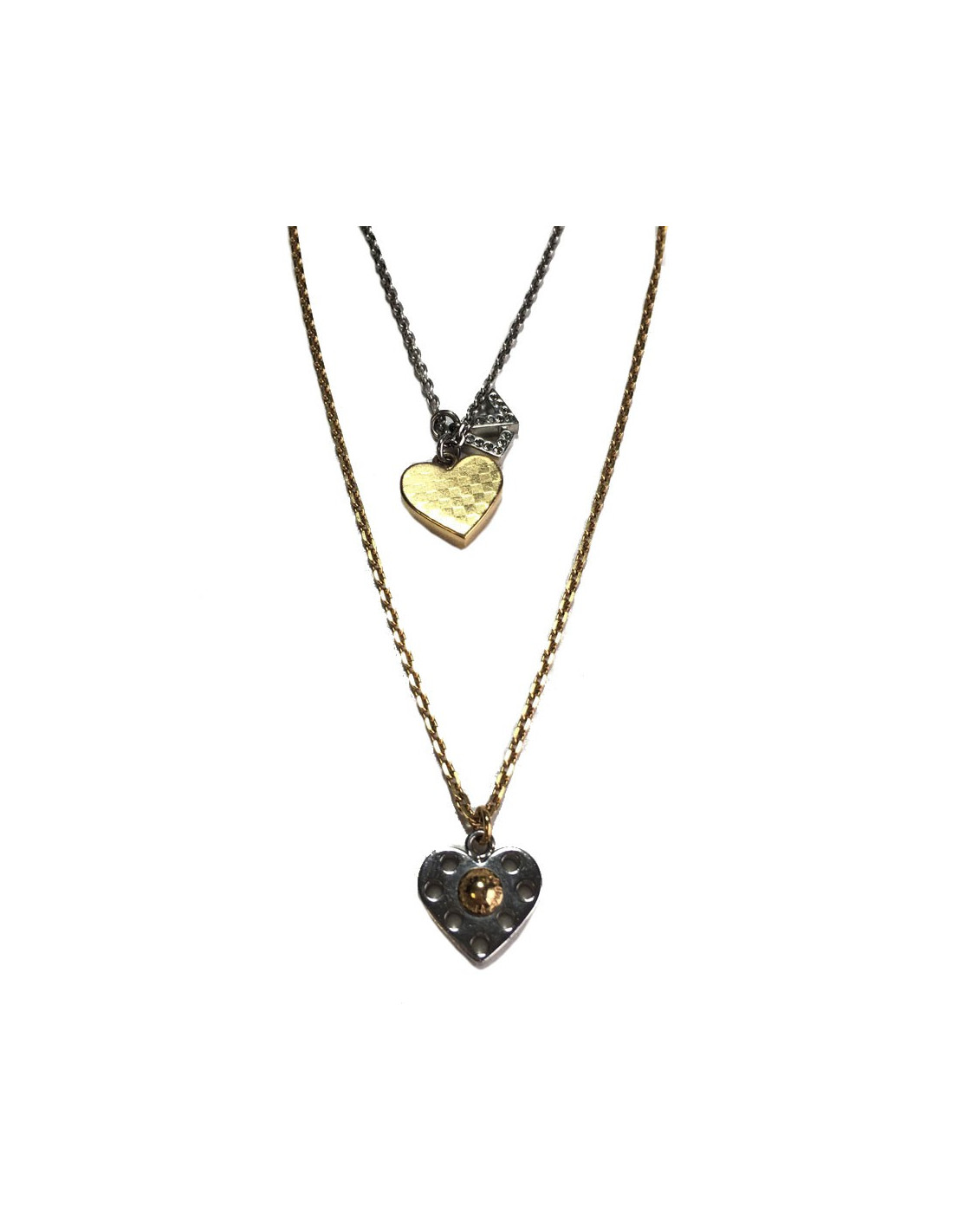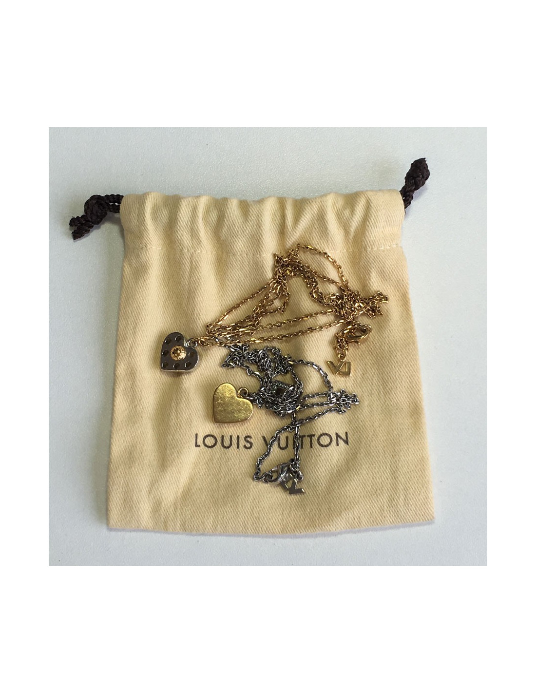 Necklace double LOUIS VUITTON. A gold metal, perforated, silver heart pendant necklace dangling LV initials to the clasp. A silver metal, with a checkered face heart pendant necklace, initials LV pending set rhinestones.