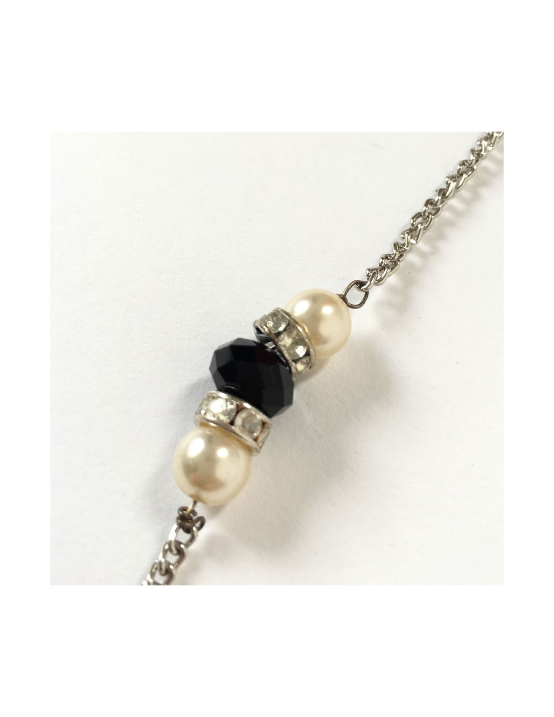 Details: Silver chain with pearly beads, faceted black and blue stones and rhinestones.