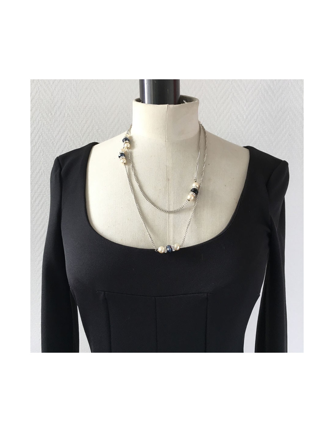 MARGUERITE de VALOIS silver chain, pearly beads, rhinestones and black stones long necklace