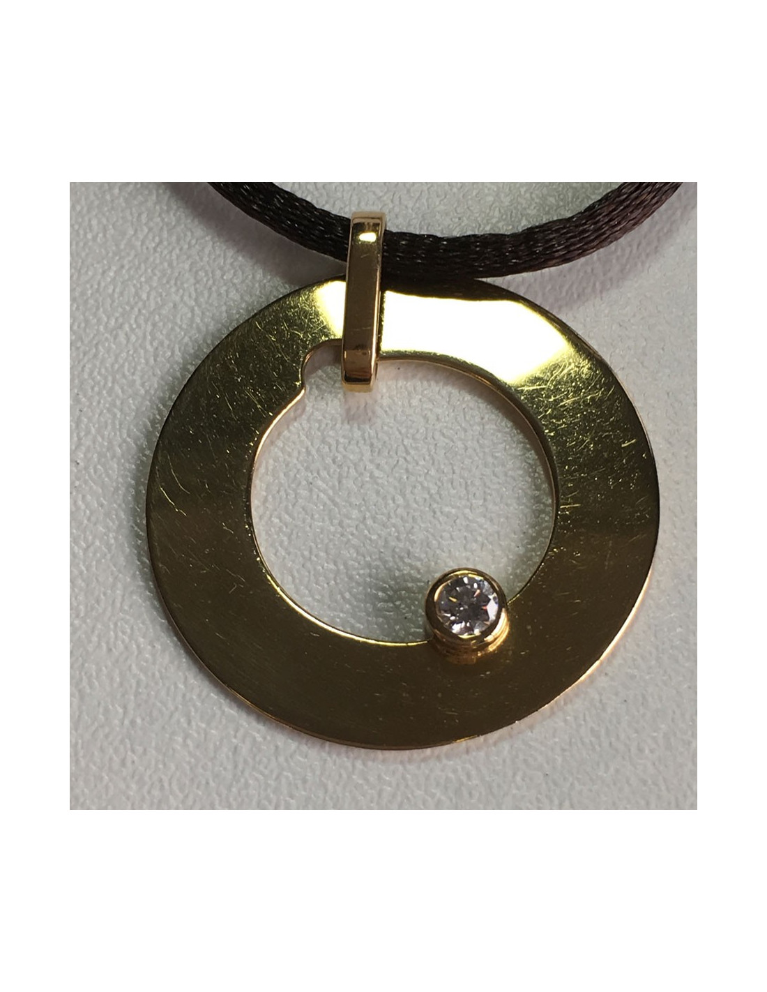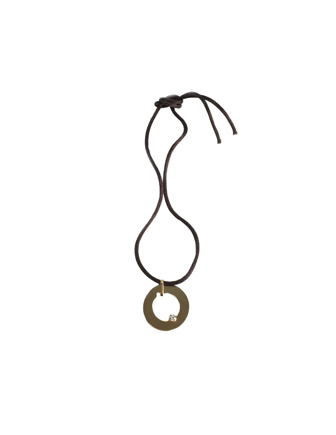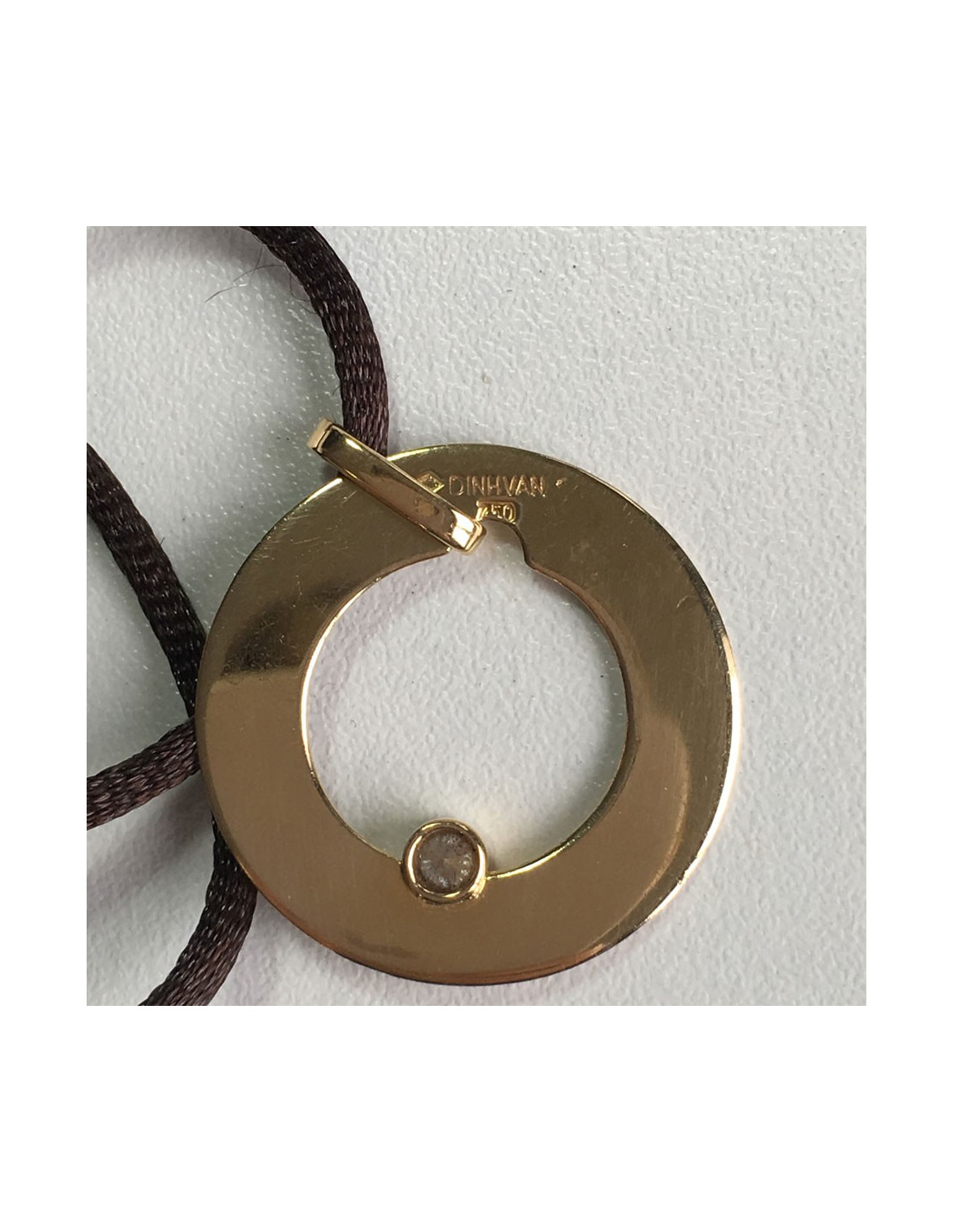 Pendant DINH VAN 'target' in yellow gold and diamond. Link in Brown silk.