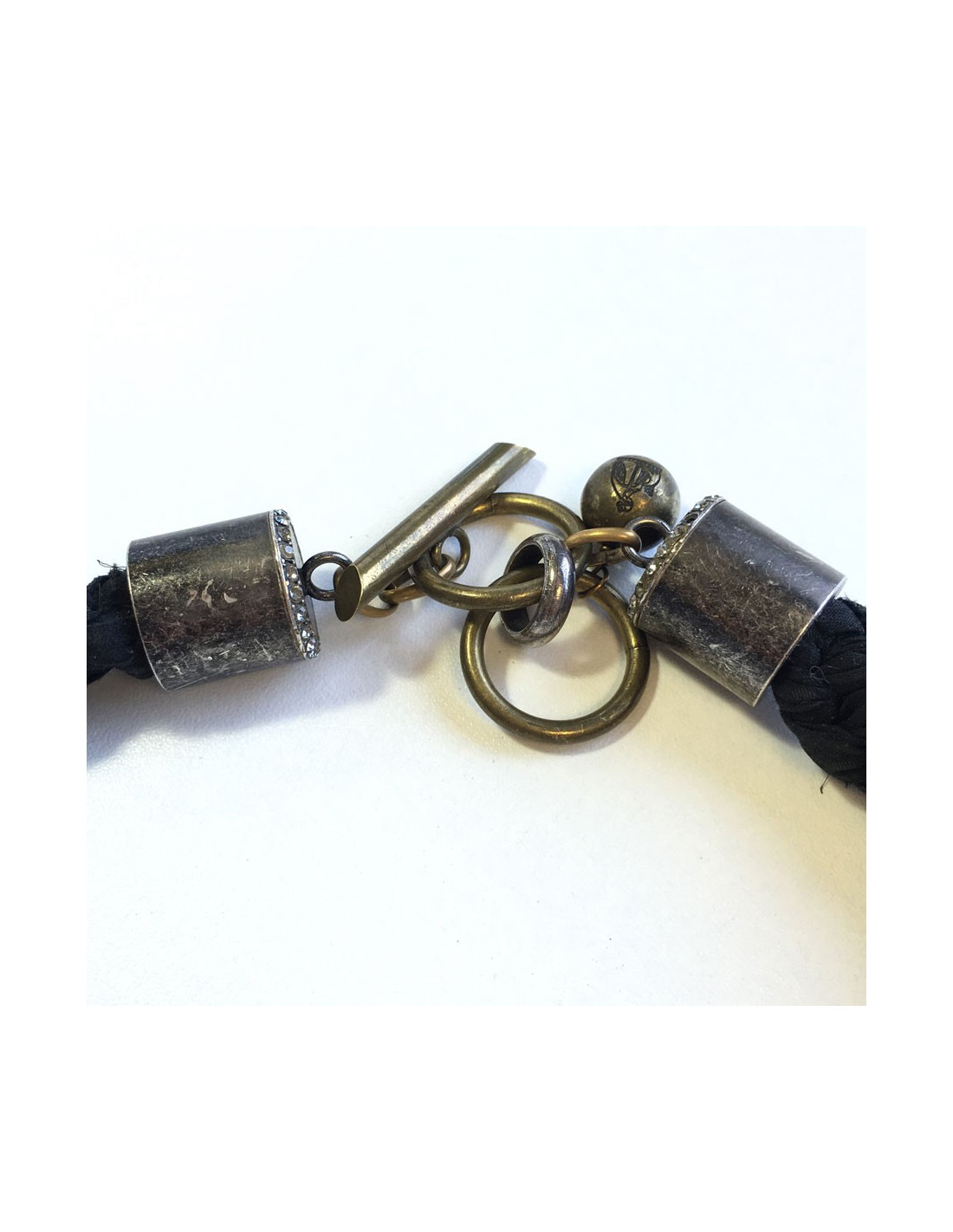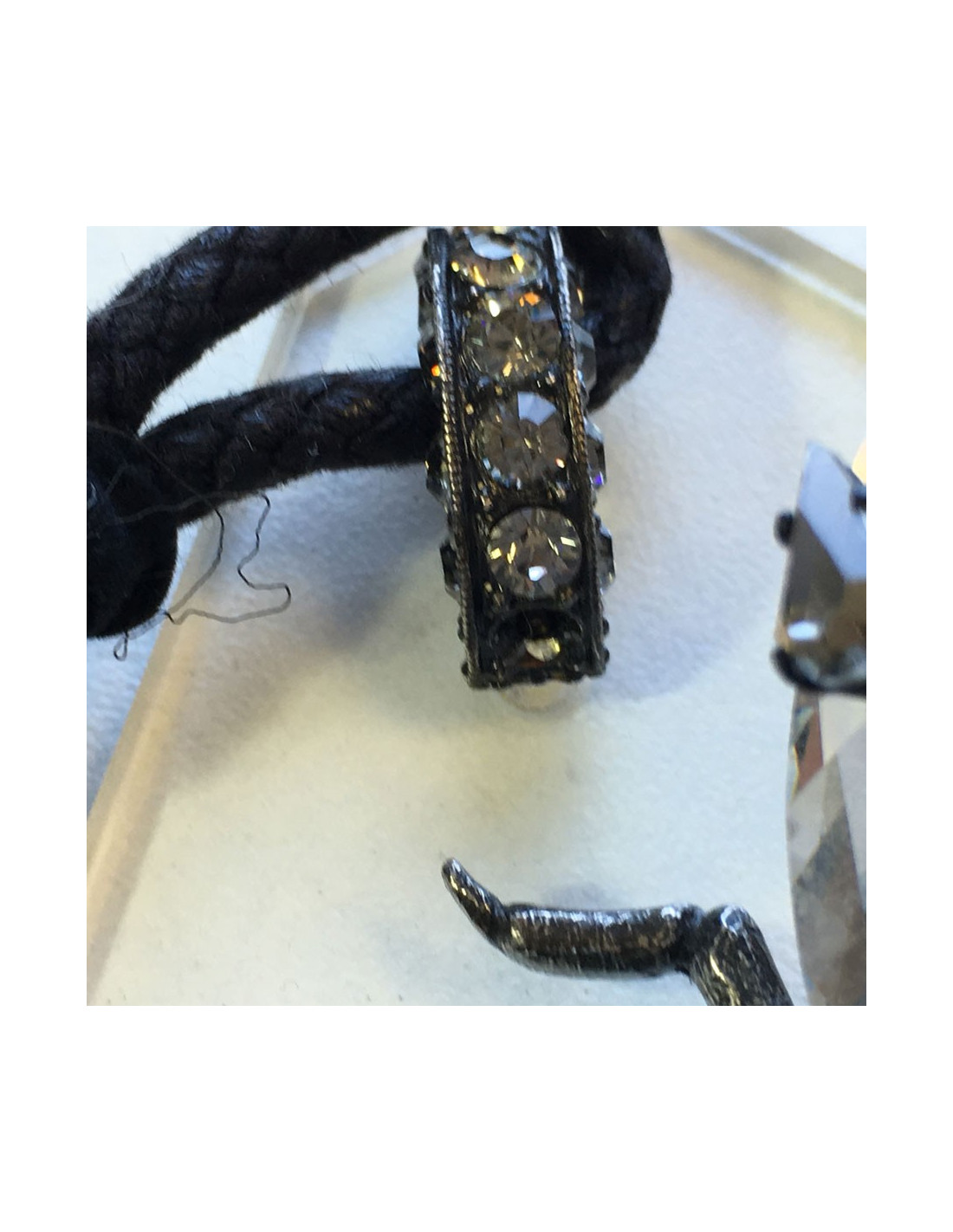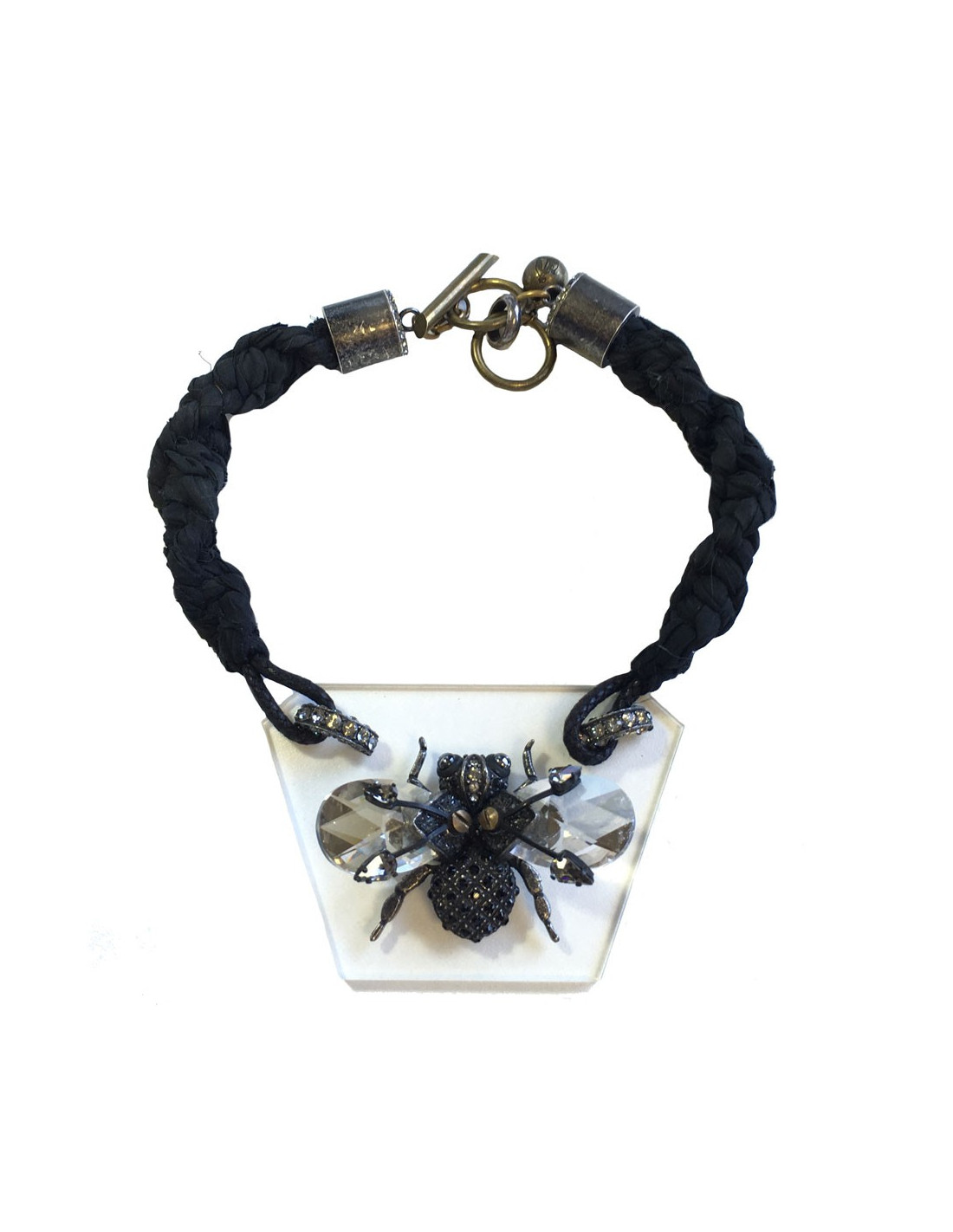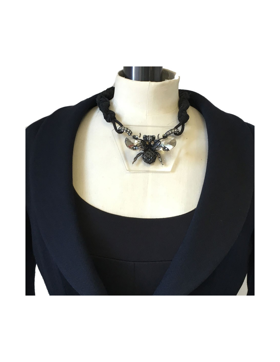 Beau collier LANVIN "insecte" en cristaux de swarovski et strass. Chaîne en tissu noir, fermoir en T. Insecte vissé sur une plaque en plexi transparent. En très bon état. Pastille de la marque au dos.