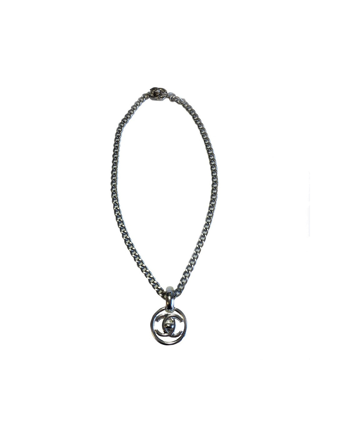 CHANEL necklace, chain and pendant in silver metal. Lozenge of the brand that is present on the back of the CC.