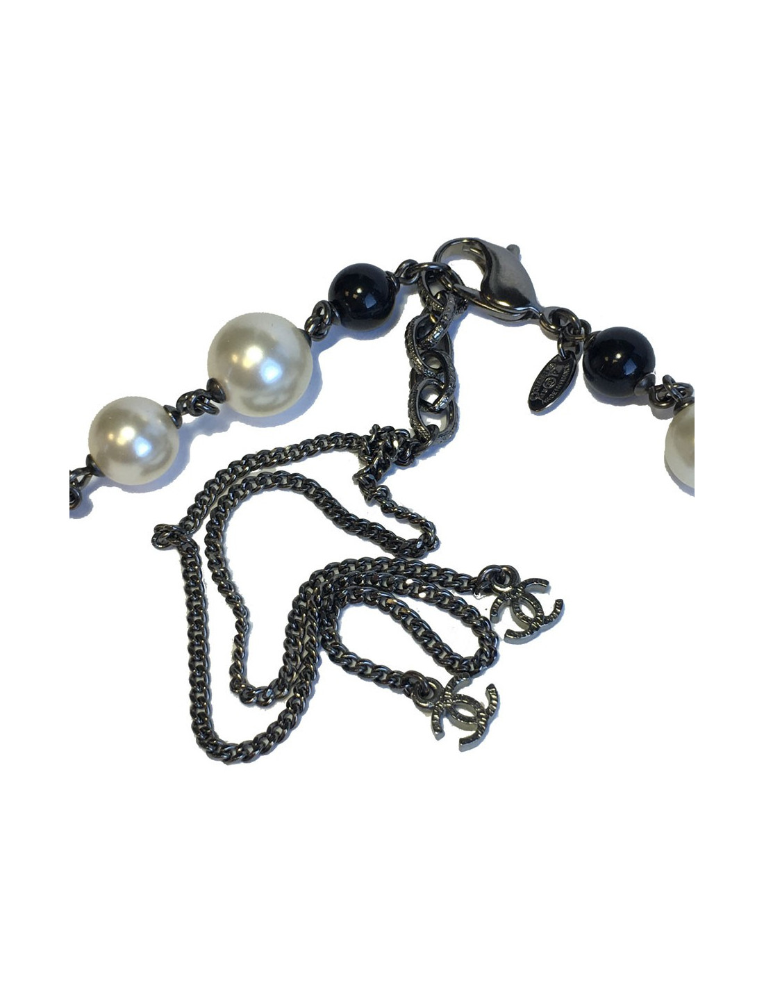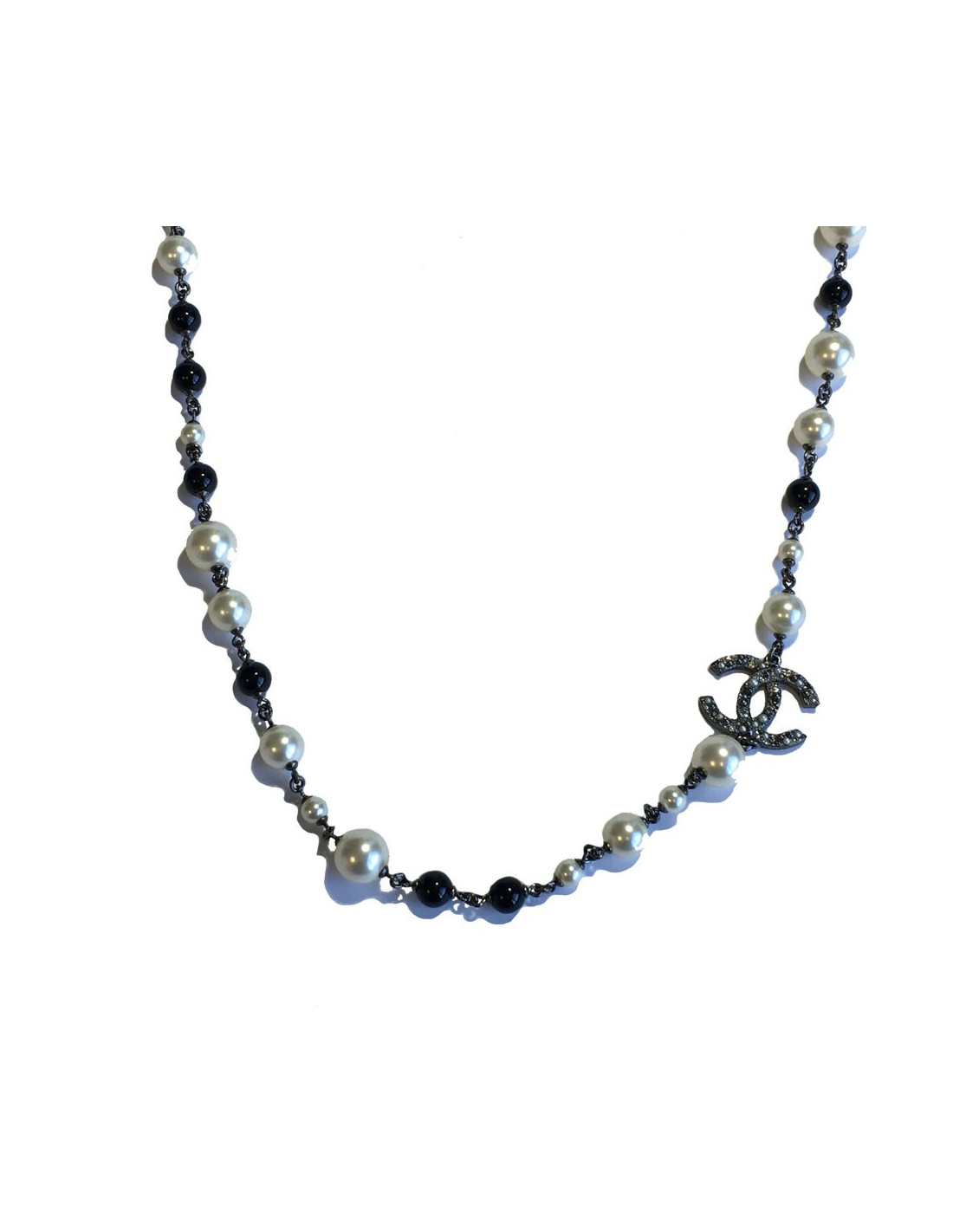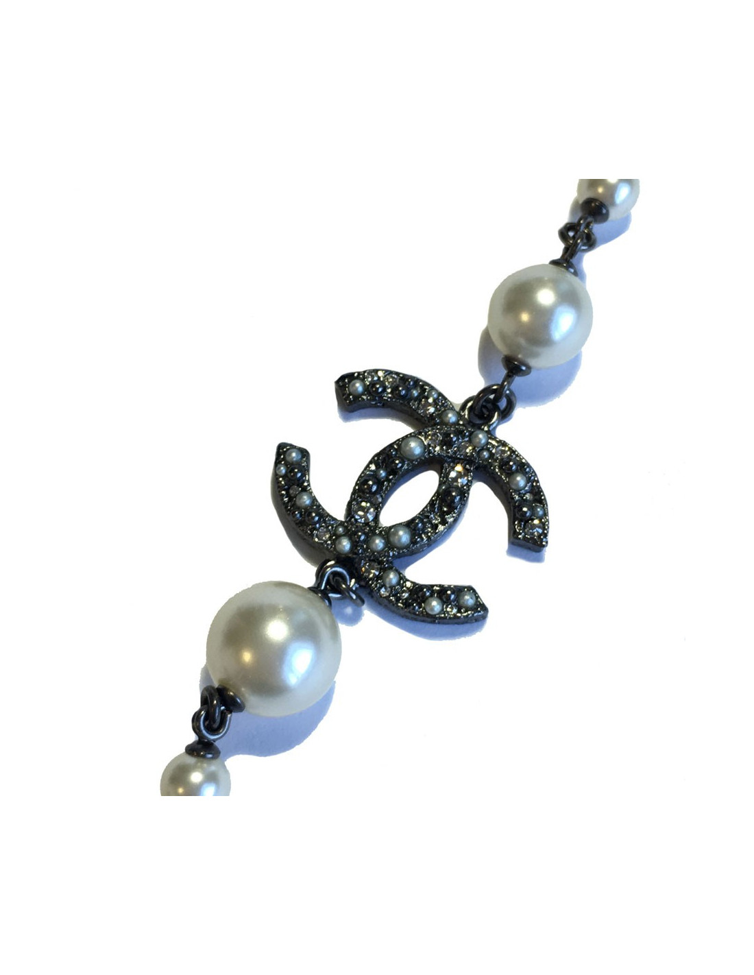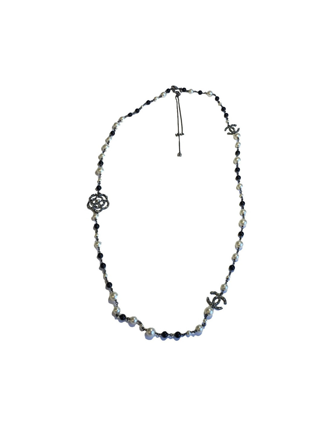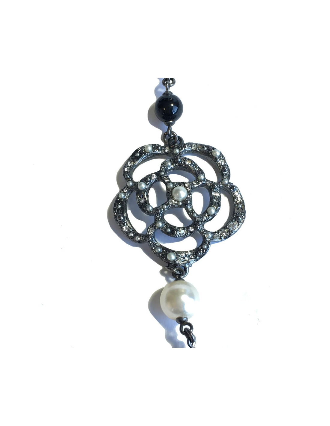 Superbe sautoir CHANEL camélias, CC sertis de strass et petites perles nacrées, perles nacrées et noires.