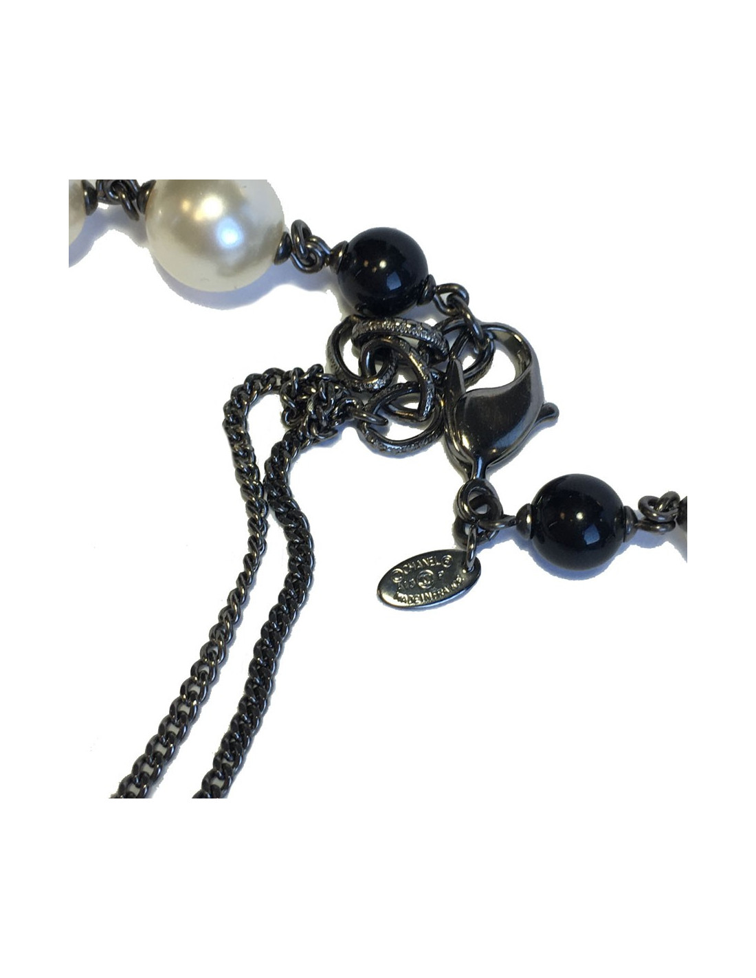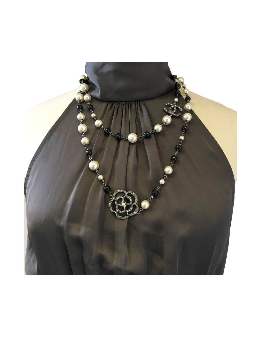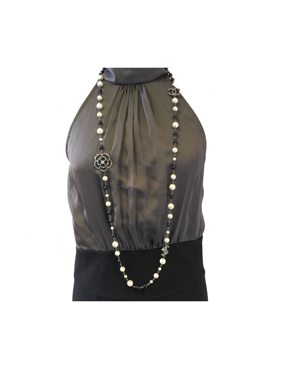 Sautoir CHANEL camélias, perles nacrées et noires