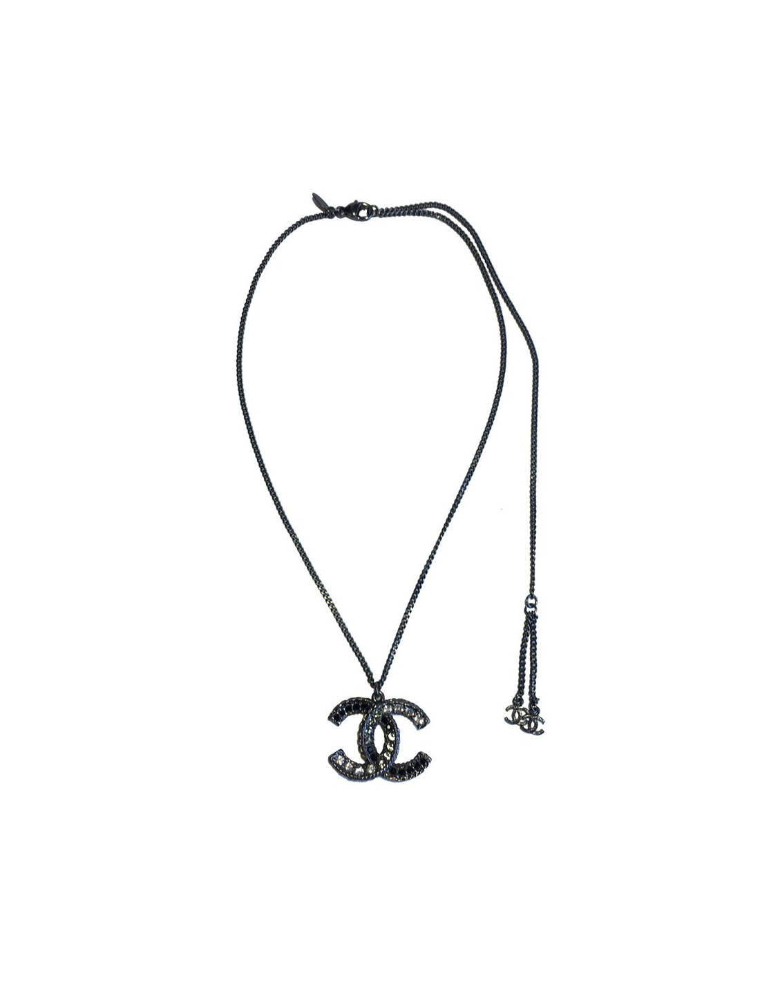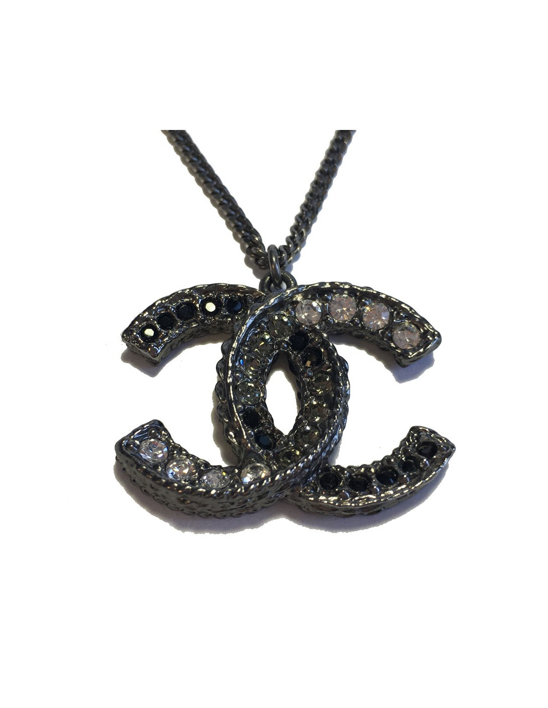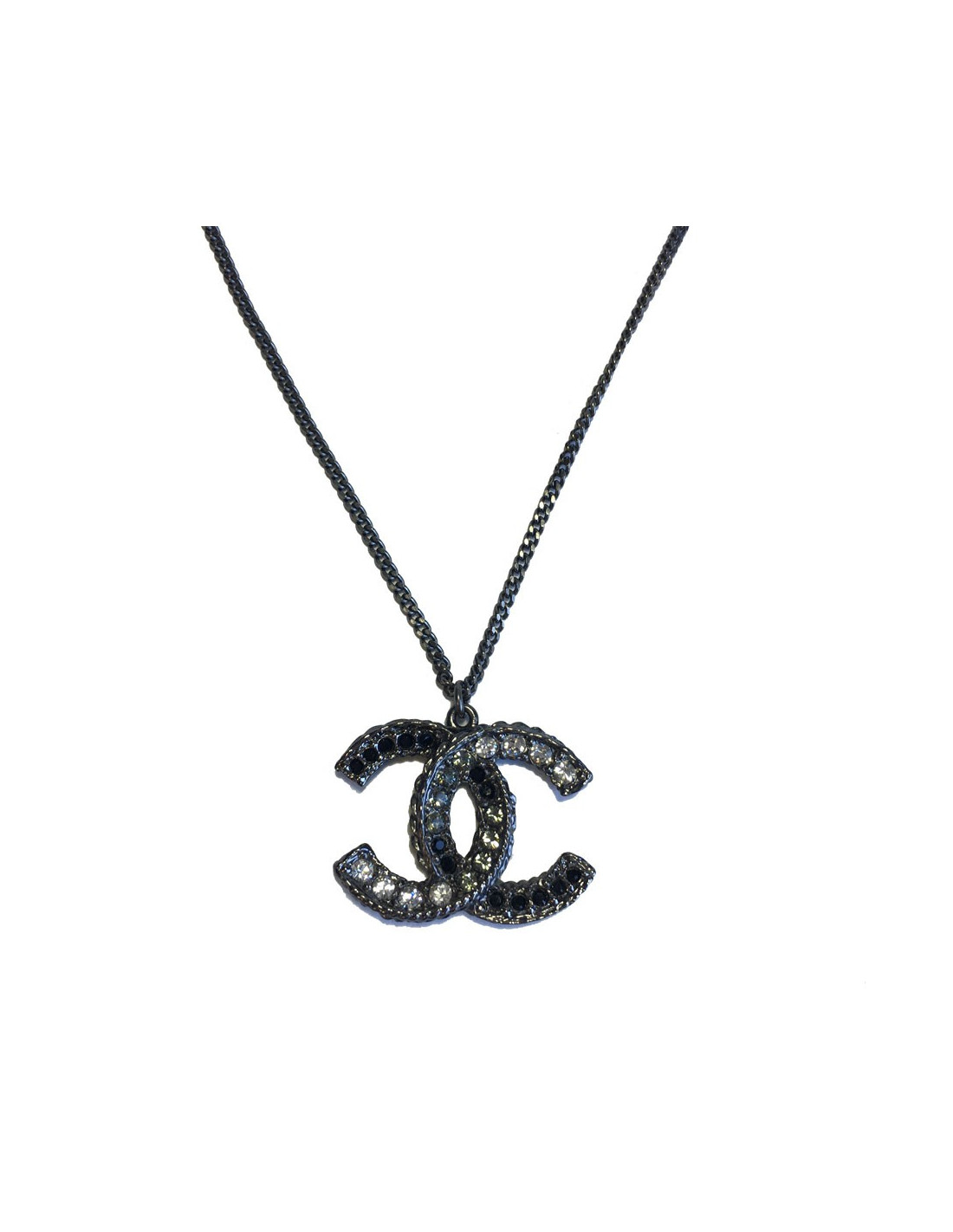 Collier CHANEL CC en ruthénium et strass blancs et noirs. Le CC a un côté en strass et l'autre en résine noire. Pastille de la marque accrochée au fermoir.