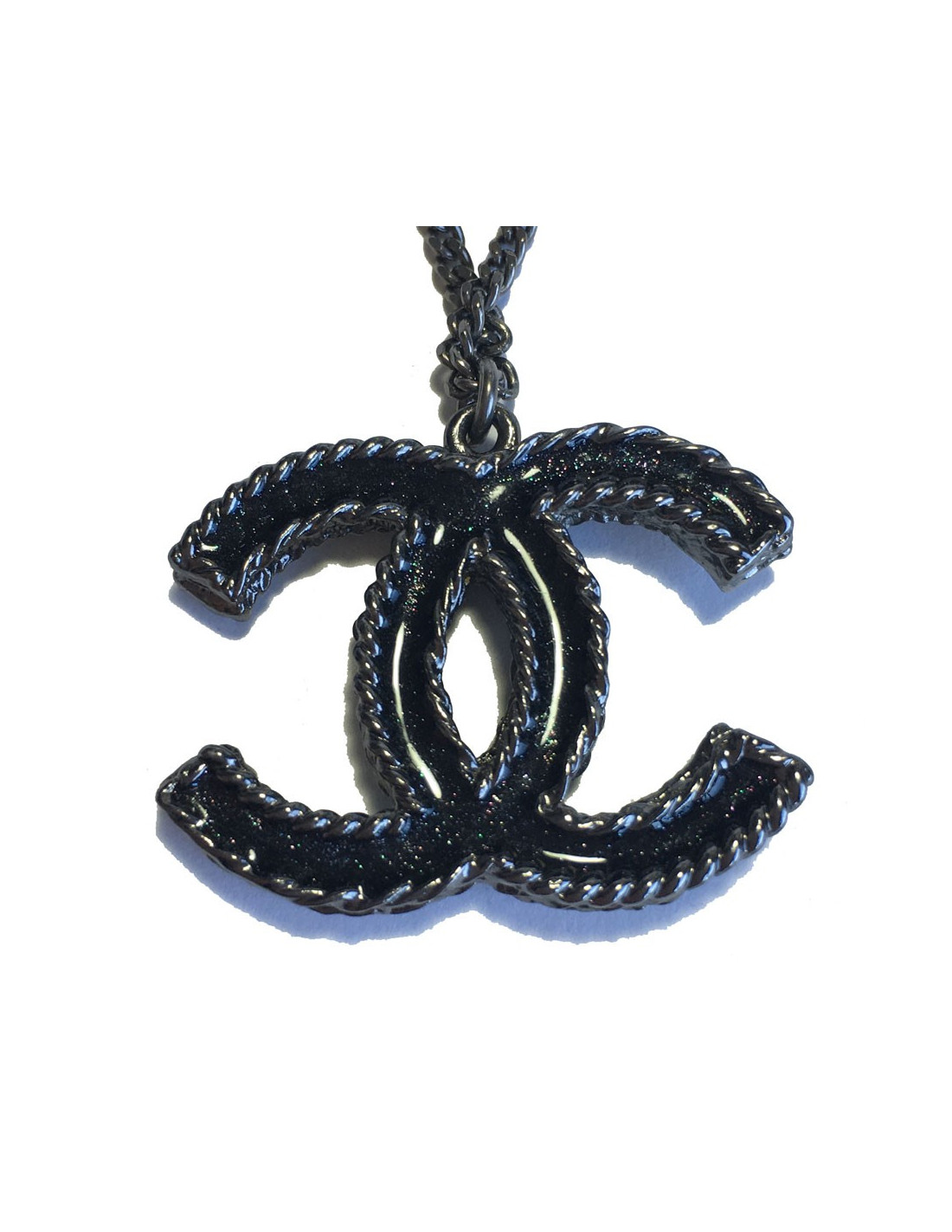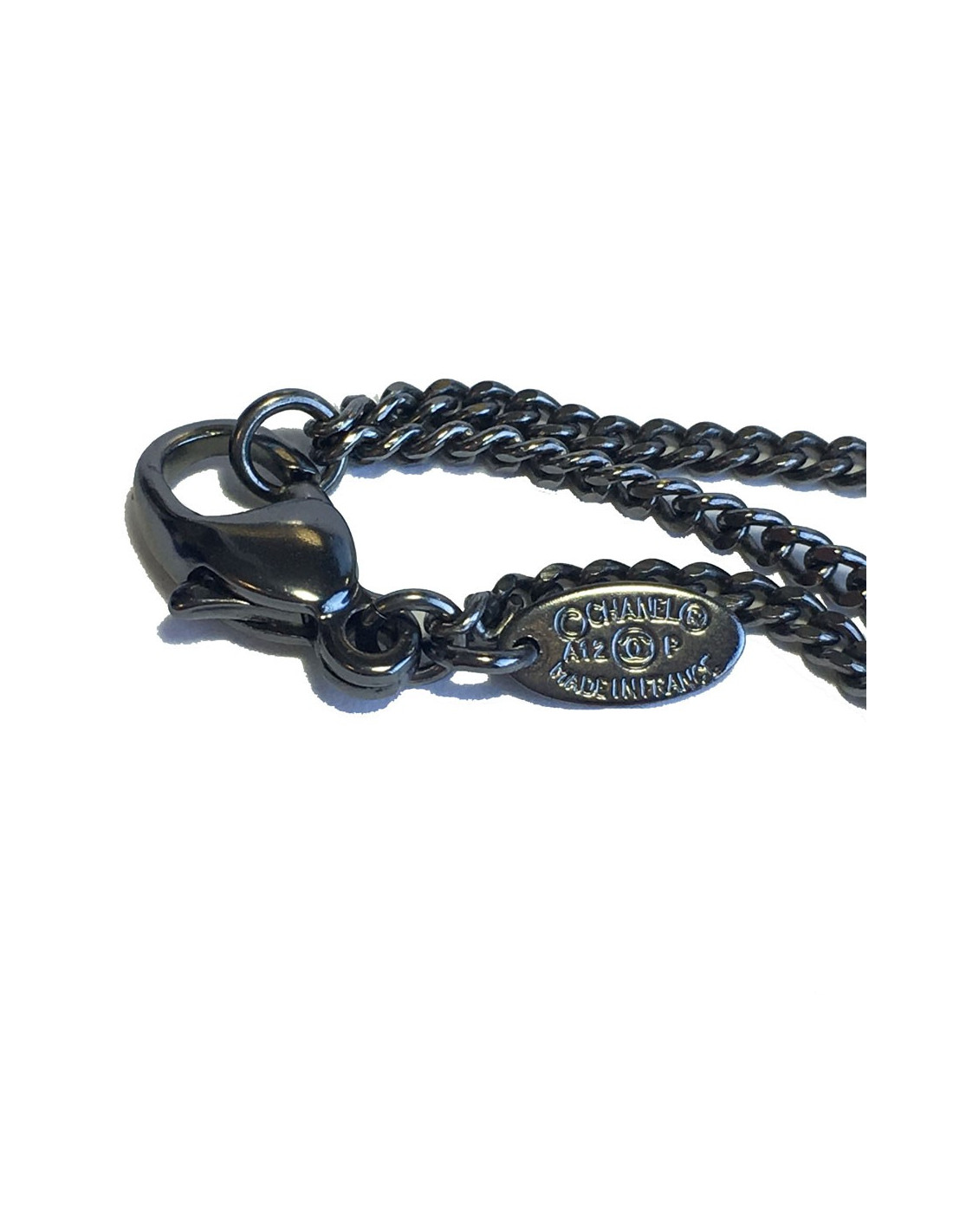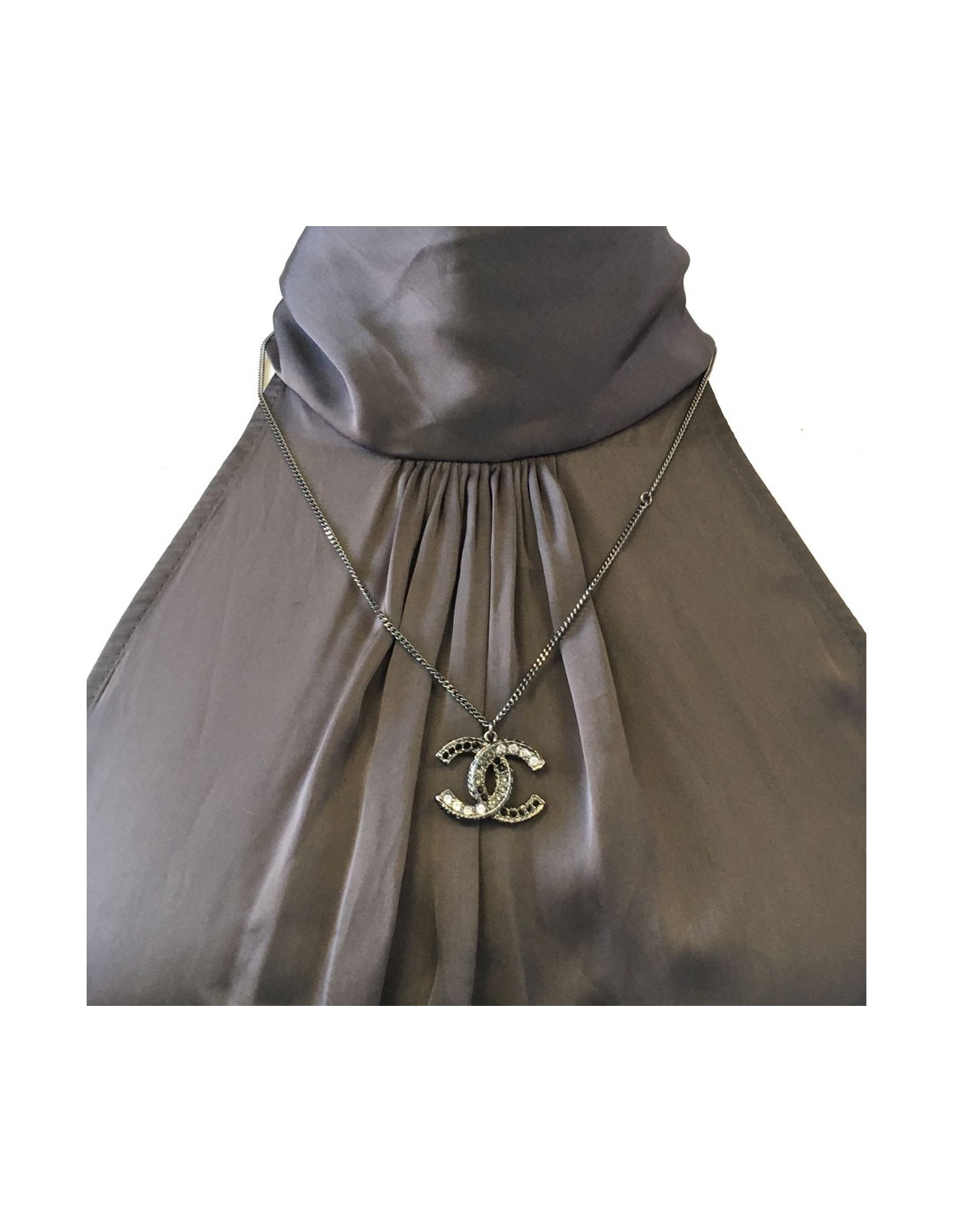 Collier CHANEL CC en ruthénium et strass blancs et noirs. Le CC a un côté en strass et l'autre en résine noire. Pastille de la marque accrochée au fermoir.