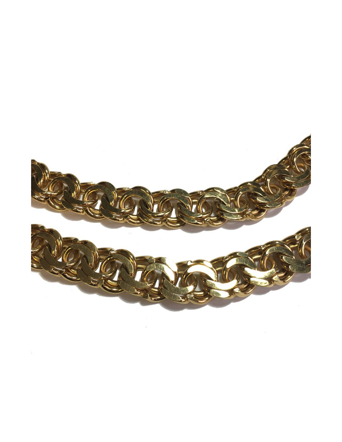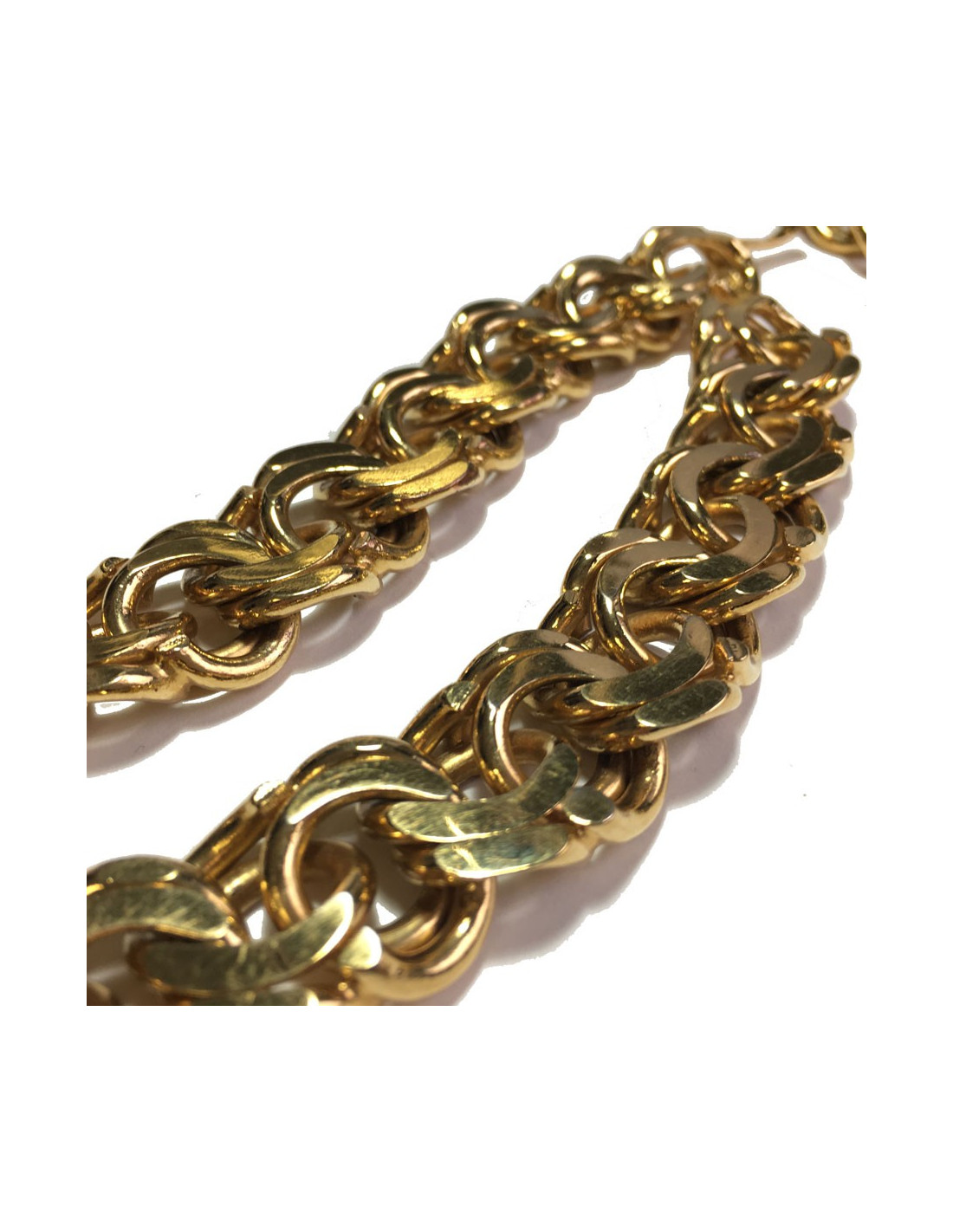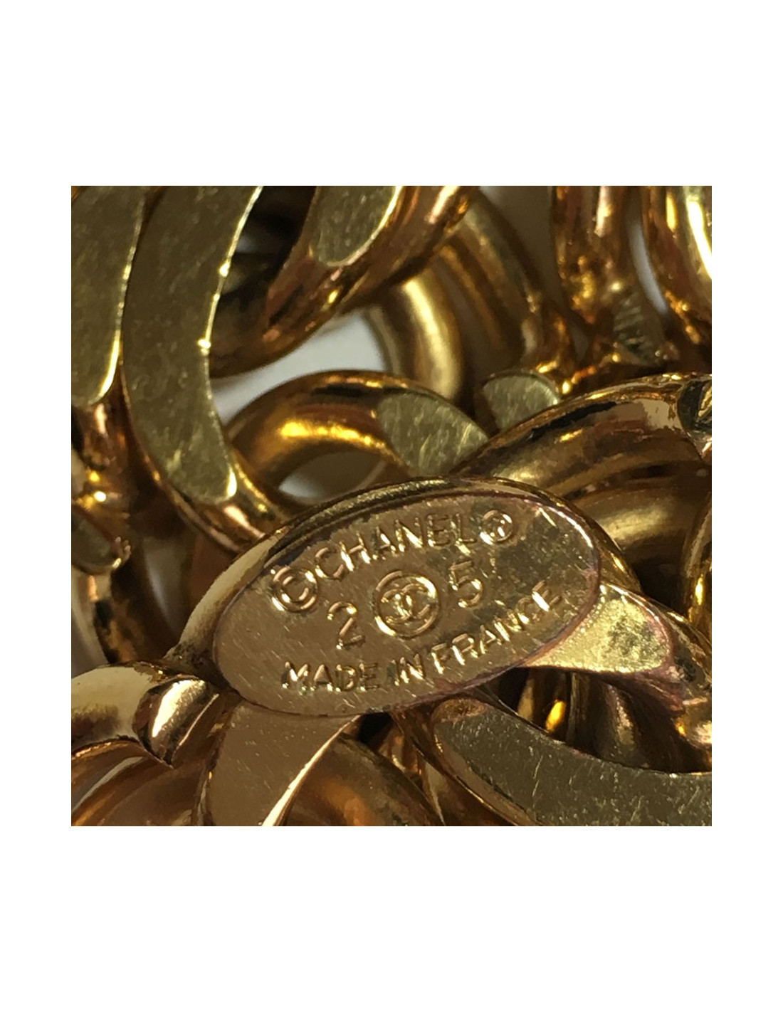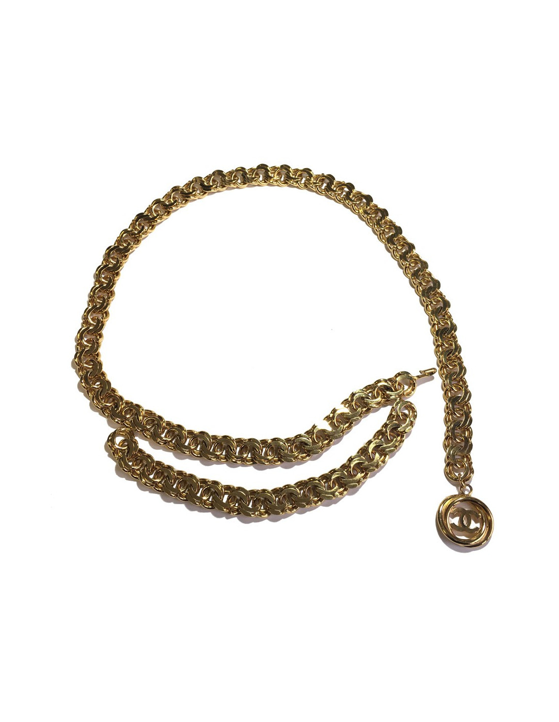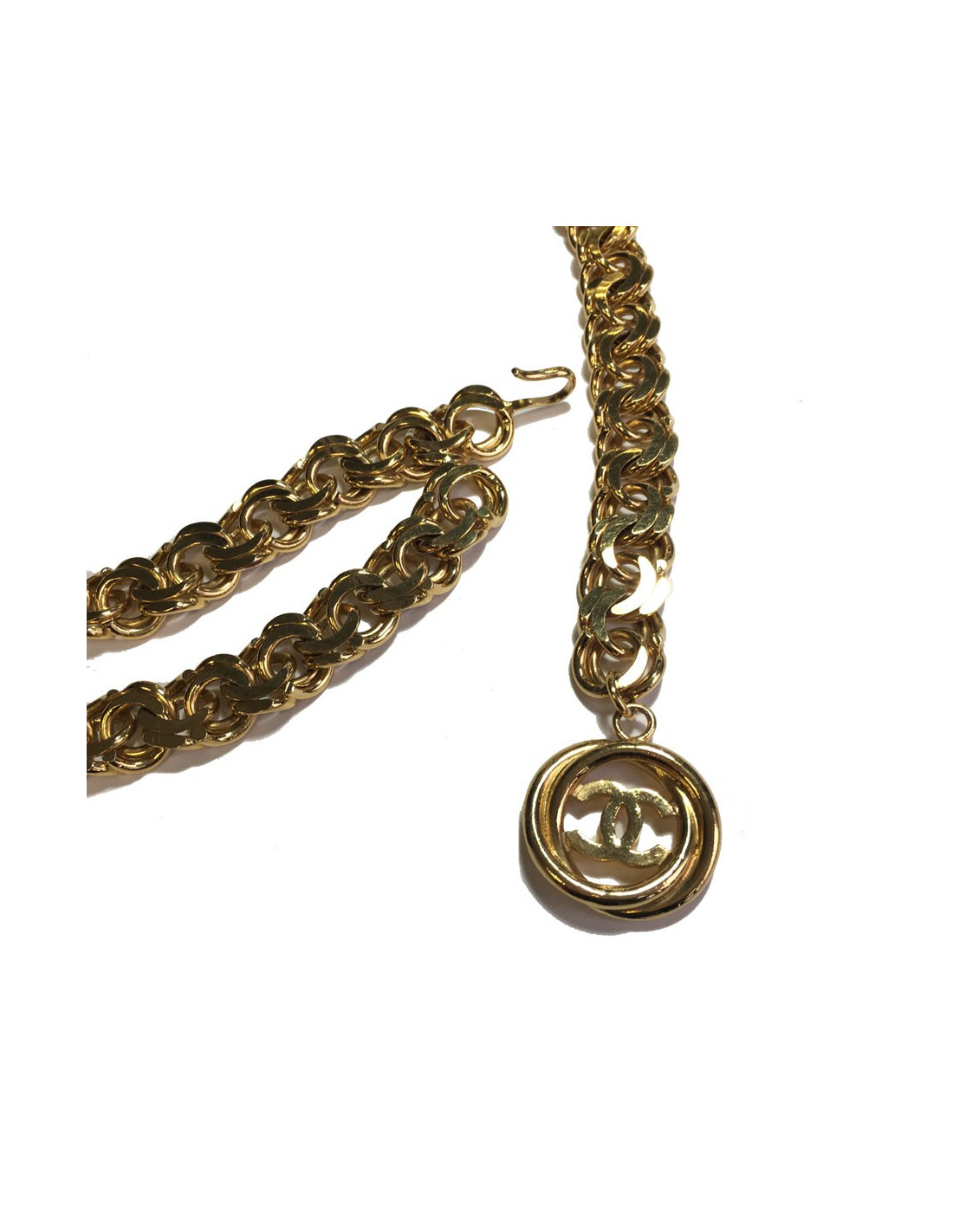 Très belle ceinture CHANEL chaîne à grosse maille en métal doré. Une extrémité se termine par un CC dans un rond. Fermoir crochet.