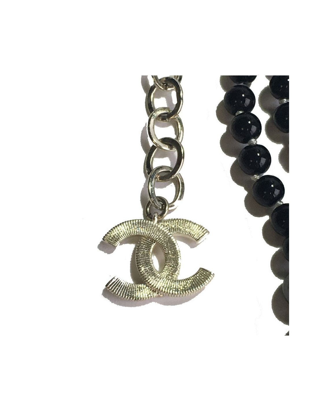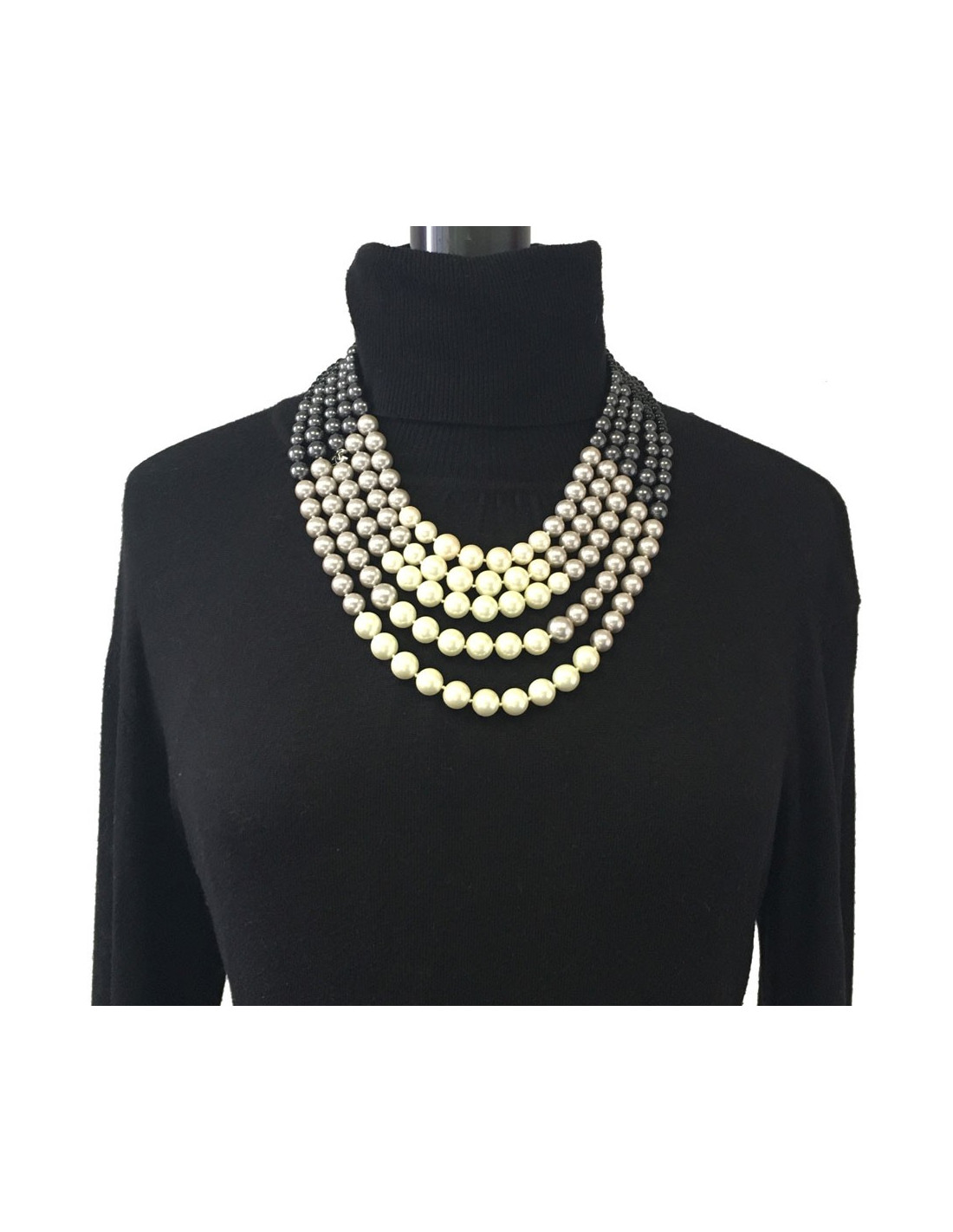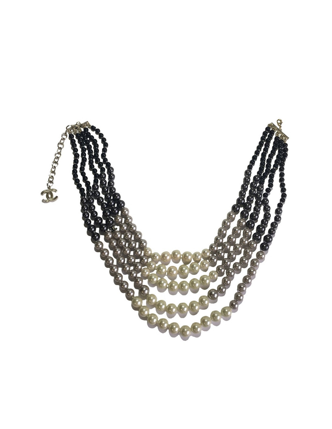 Sumptuous Chanel necklace 5 rows of beads of 4 colors: beige, gray, anthracite and black. A beautiful golden metal gilded gold finishes this necklace. Hologram of the brand on the clasp. Never worn