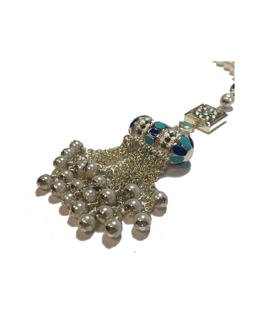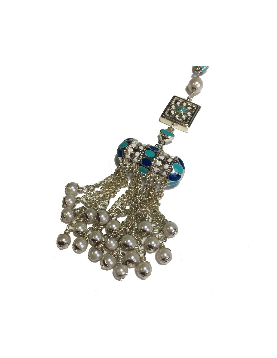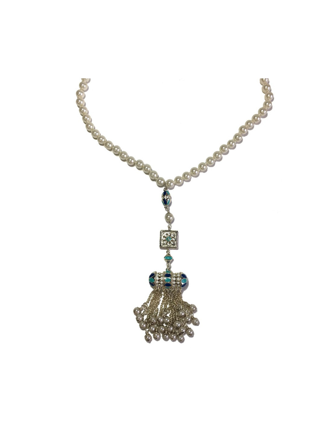 Magnifique collier collection des Métiers d'Art "Paris-Dubaï" en perles nacrées, pendentif en métal argenté, résine de couleur blanche, bleu clair et bleu foncé, petites chaînes avec perles nacrées.