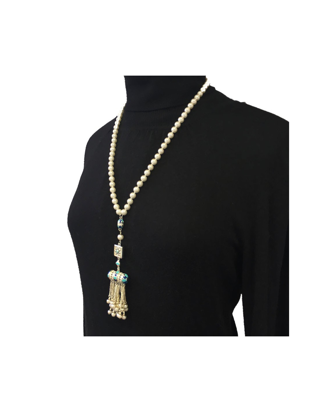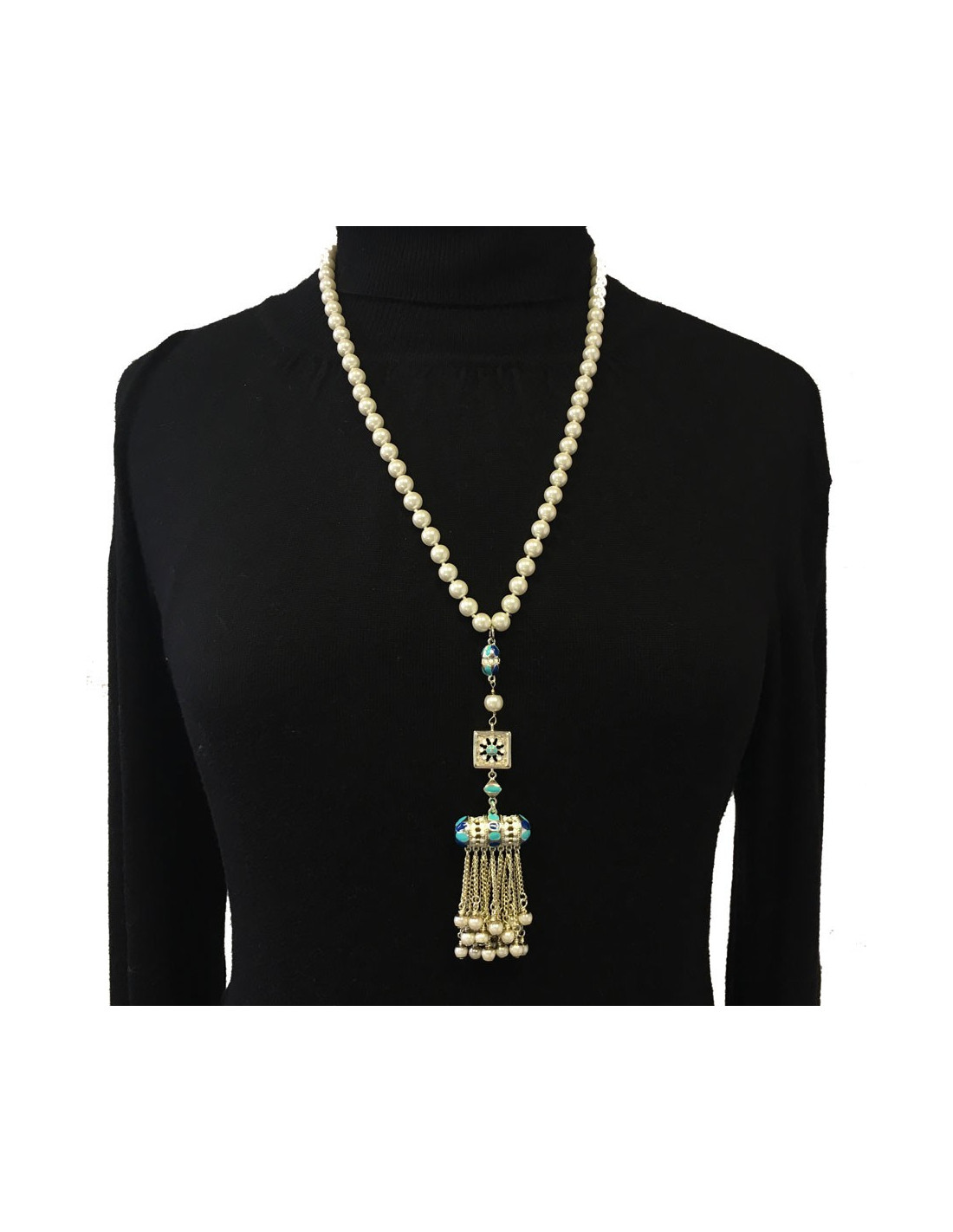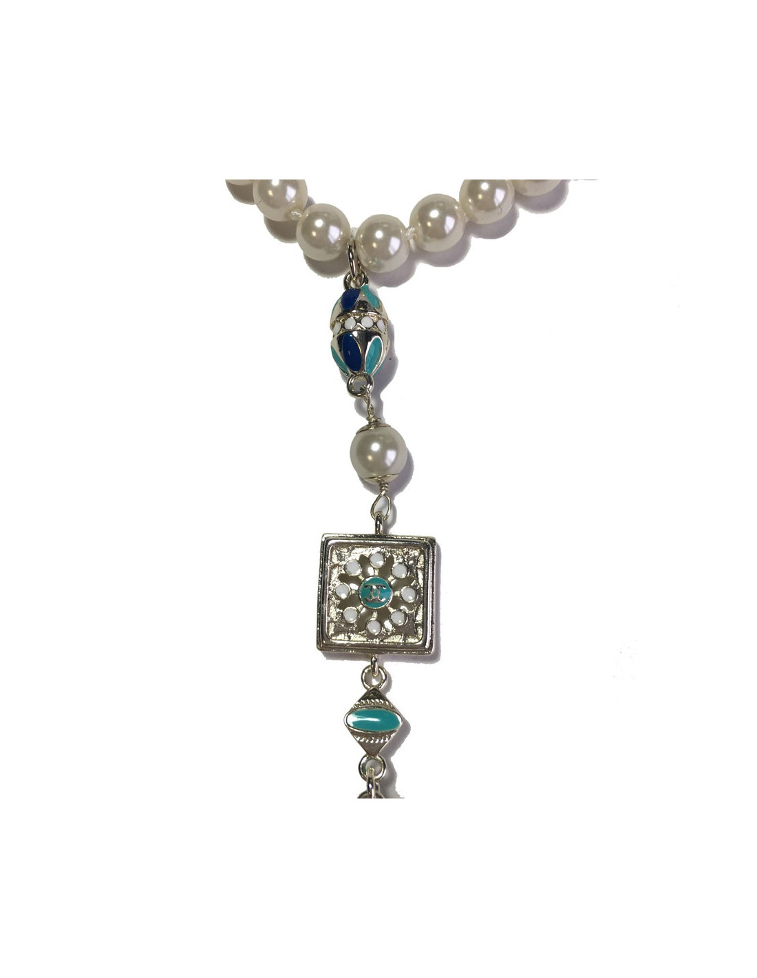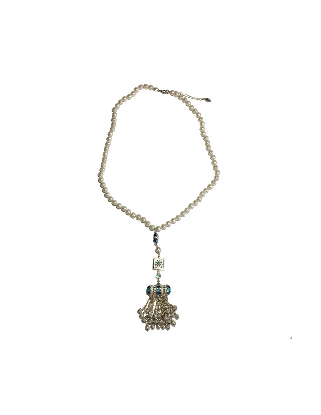 Magnifique collier collection des Métiers d'Art "Paris-Dubaï" en perles nacrées, pendentif en métal argenté, résine de couleur blanche, bleu clair et bleu foncé, petites chaînes avec perles nacrées.