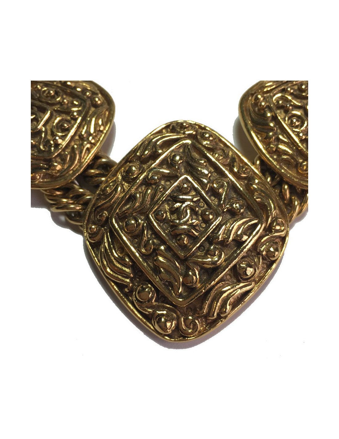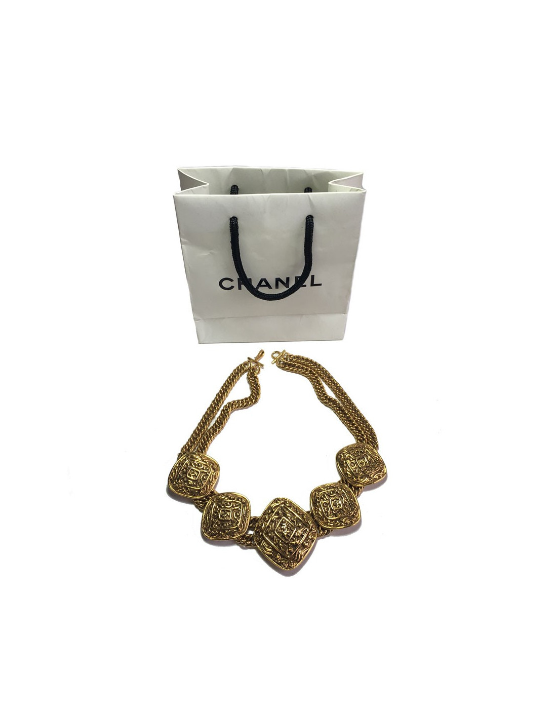 Collier Chanel couture en métal doré. Double chaîne en maille et fermoir crochet. 5 médailles, forme losange, structurées avec un CC au centre.
