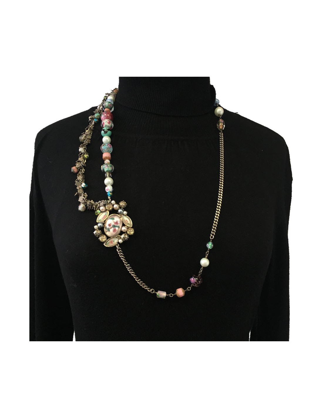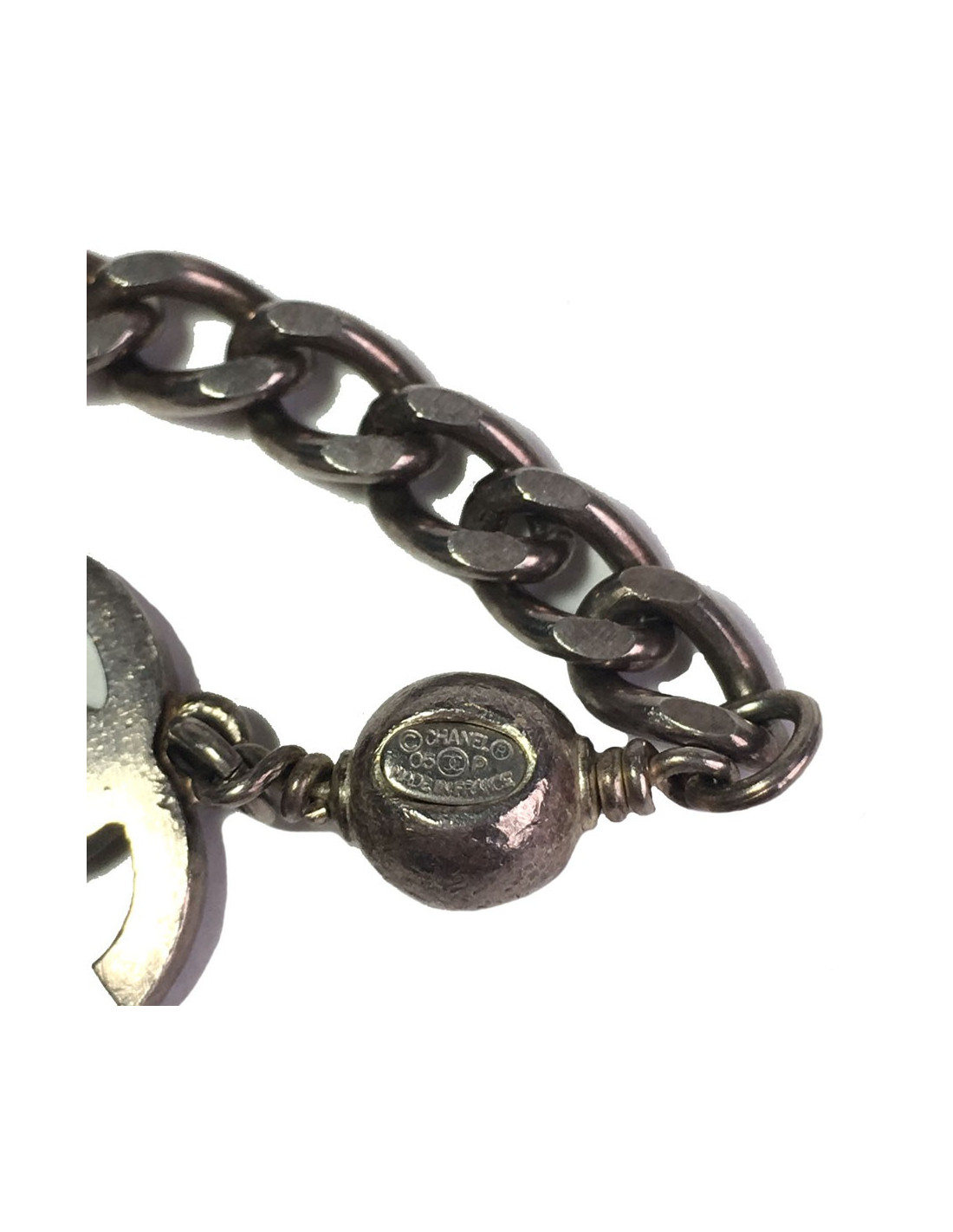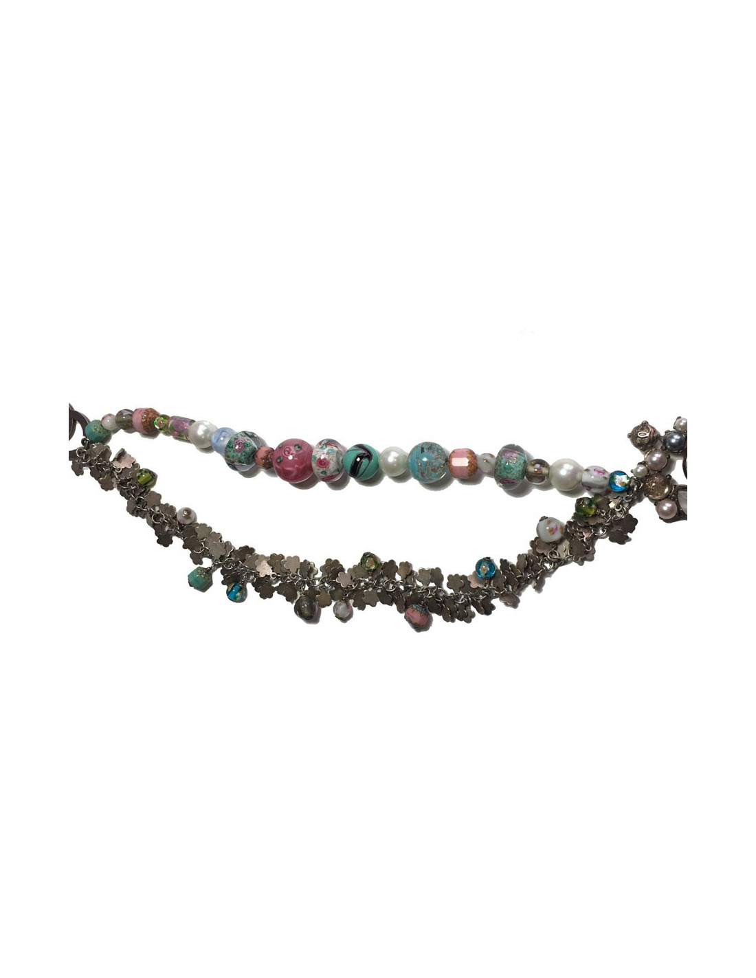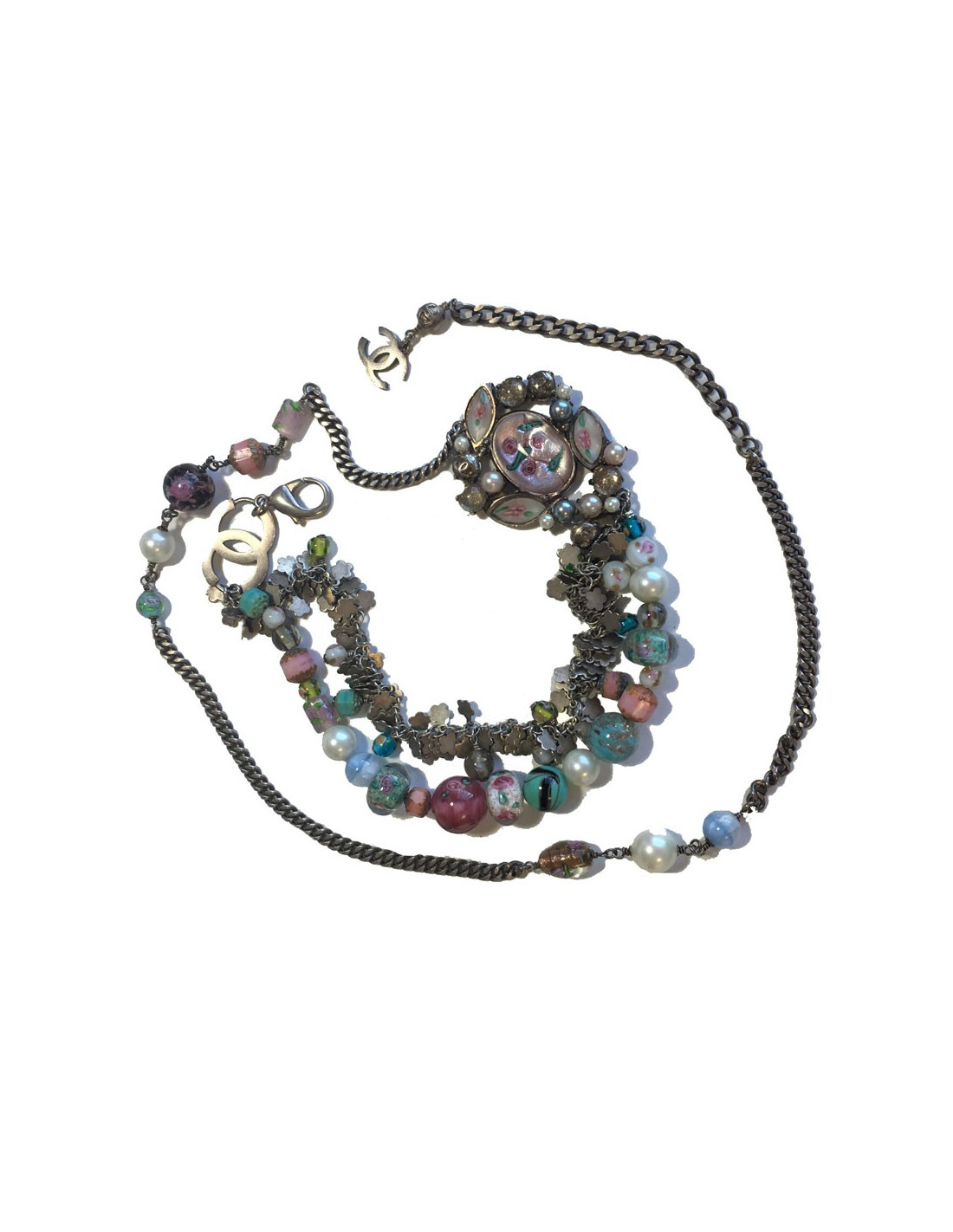 CHANEL T80 belt-necklace in silver chain, transparent molten glass beads, pearls and CC