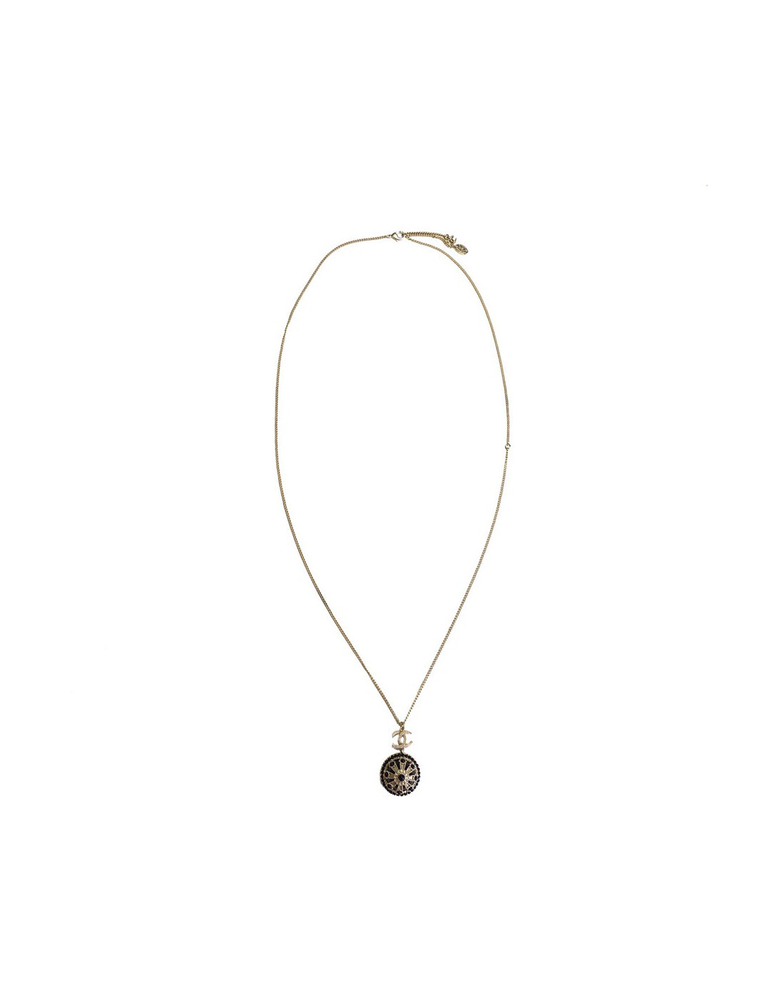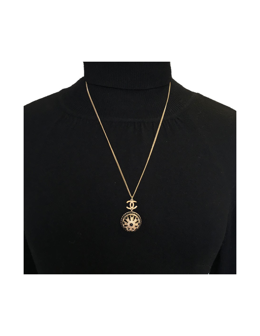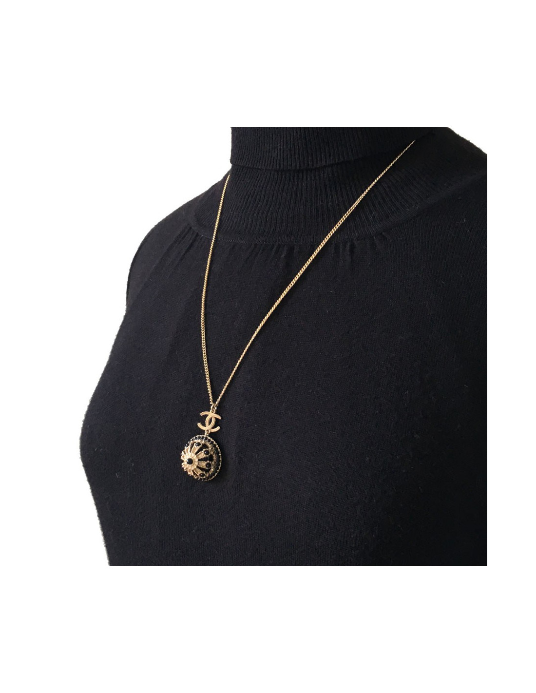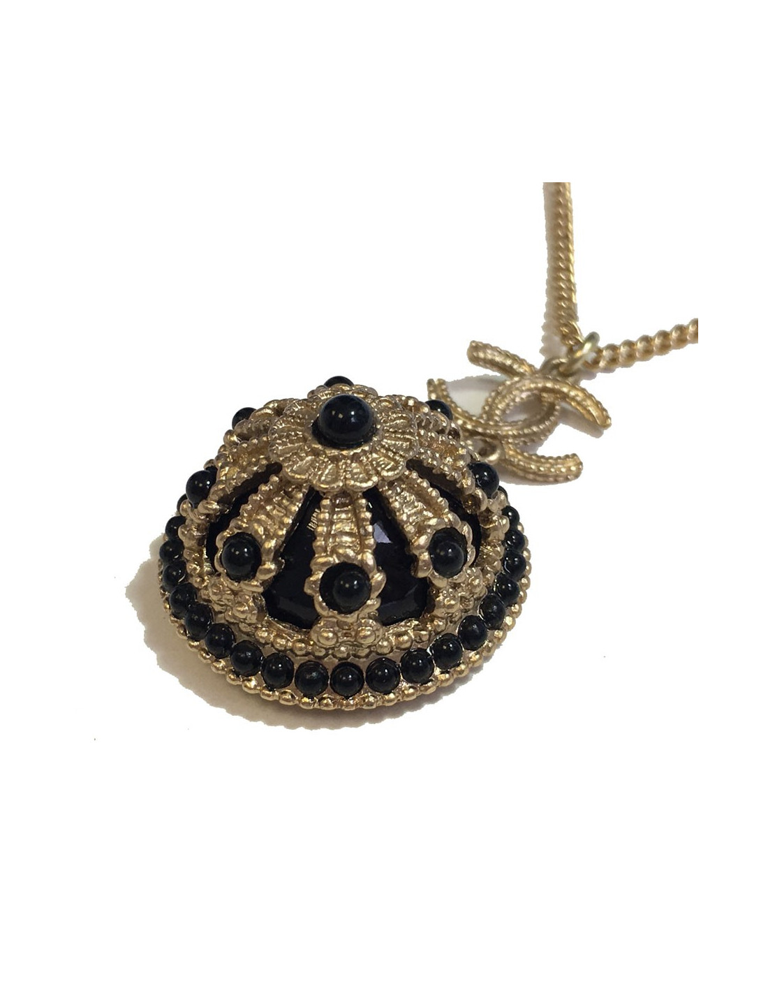 Très beau collier Chanel, chaîne en métal doré, CC et pendentif rond noir et métal doré serti de petites perles noires.