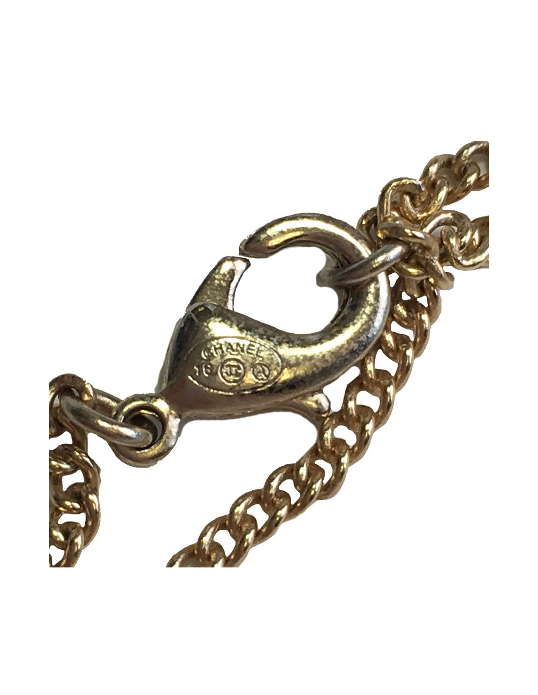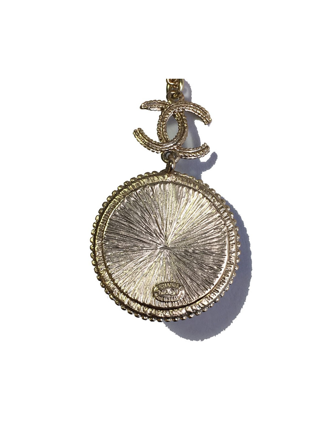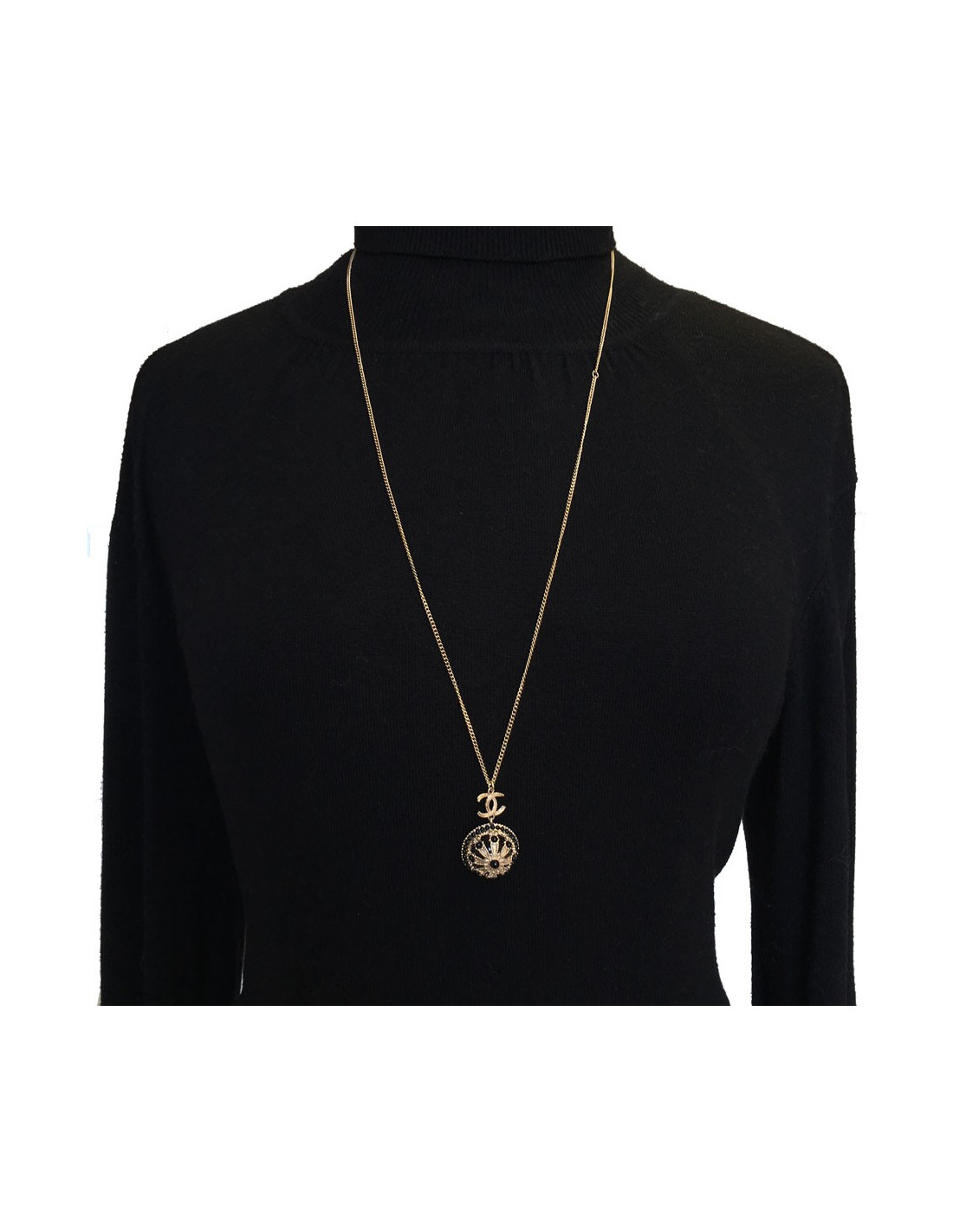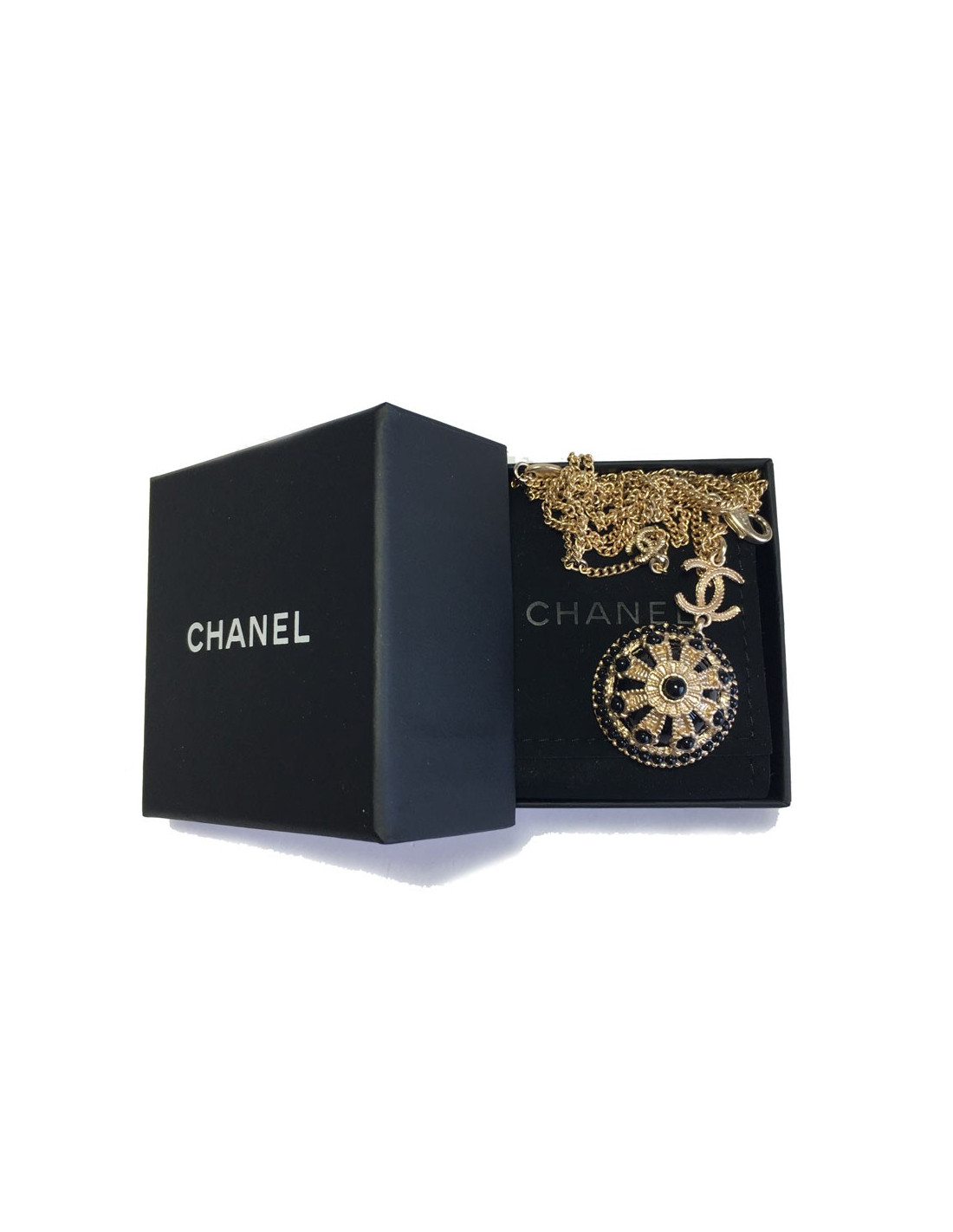 Très beau collier Chanel, chaîne en métal doré, CC et pendentif rond noir et métal doré serti de petites perles noires.