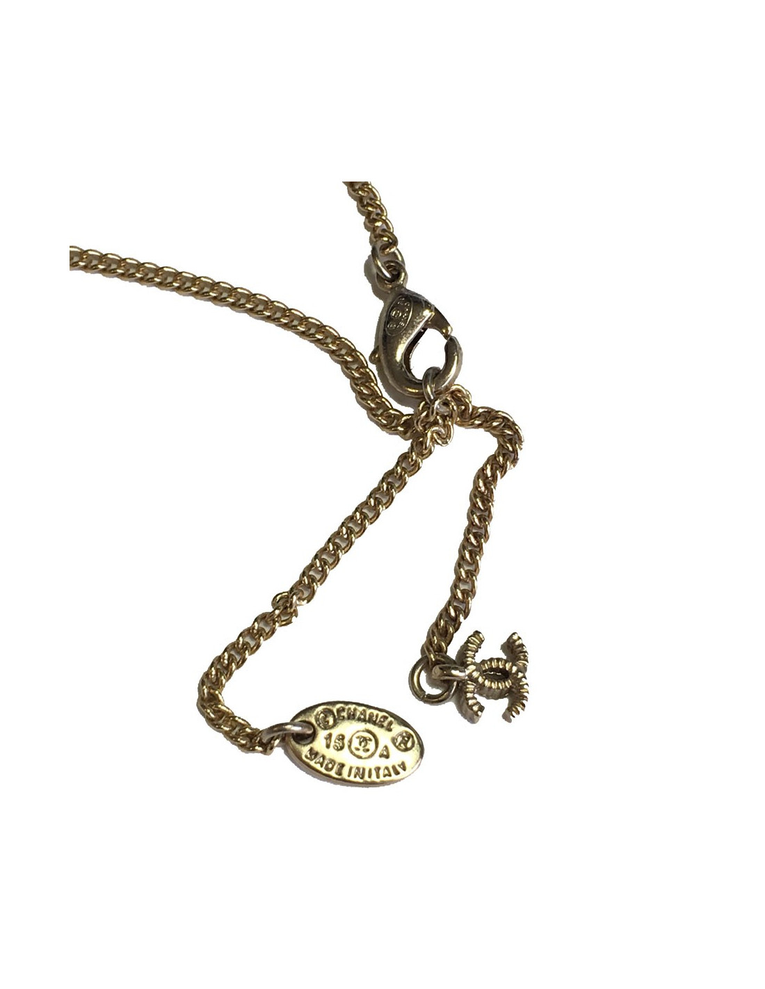 Collier CHANEL en métal doré, pendentif serti de petites perles noires