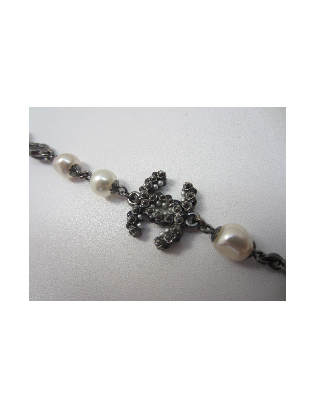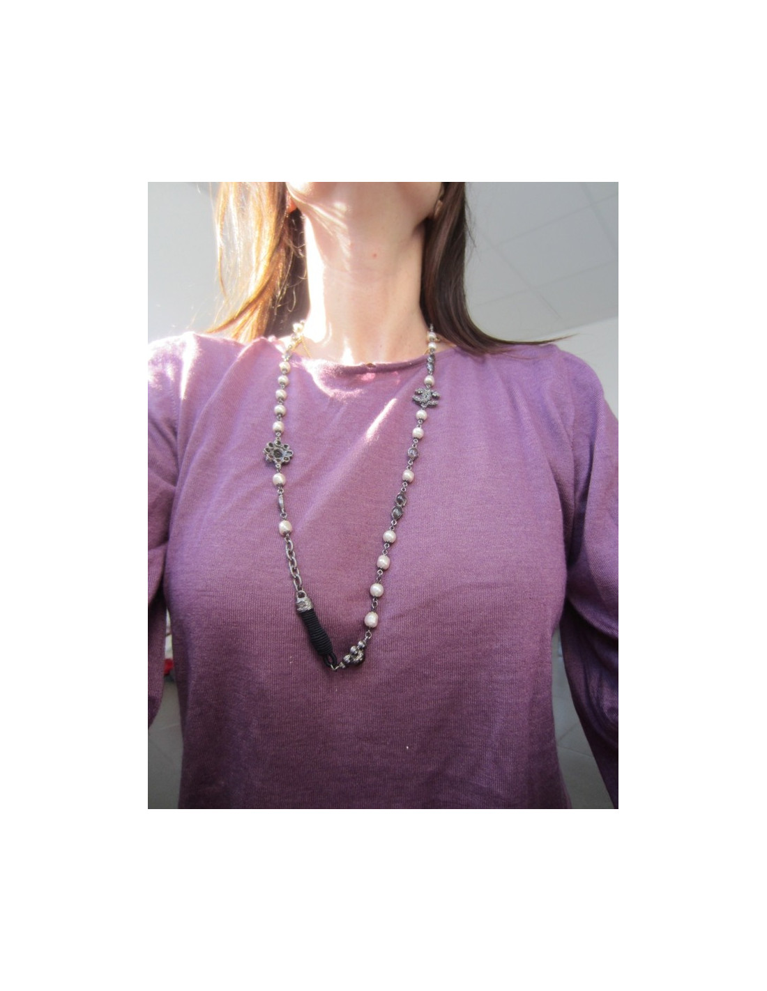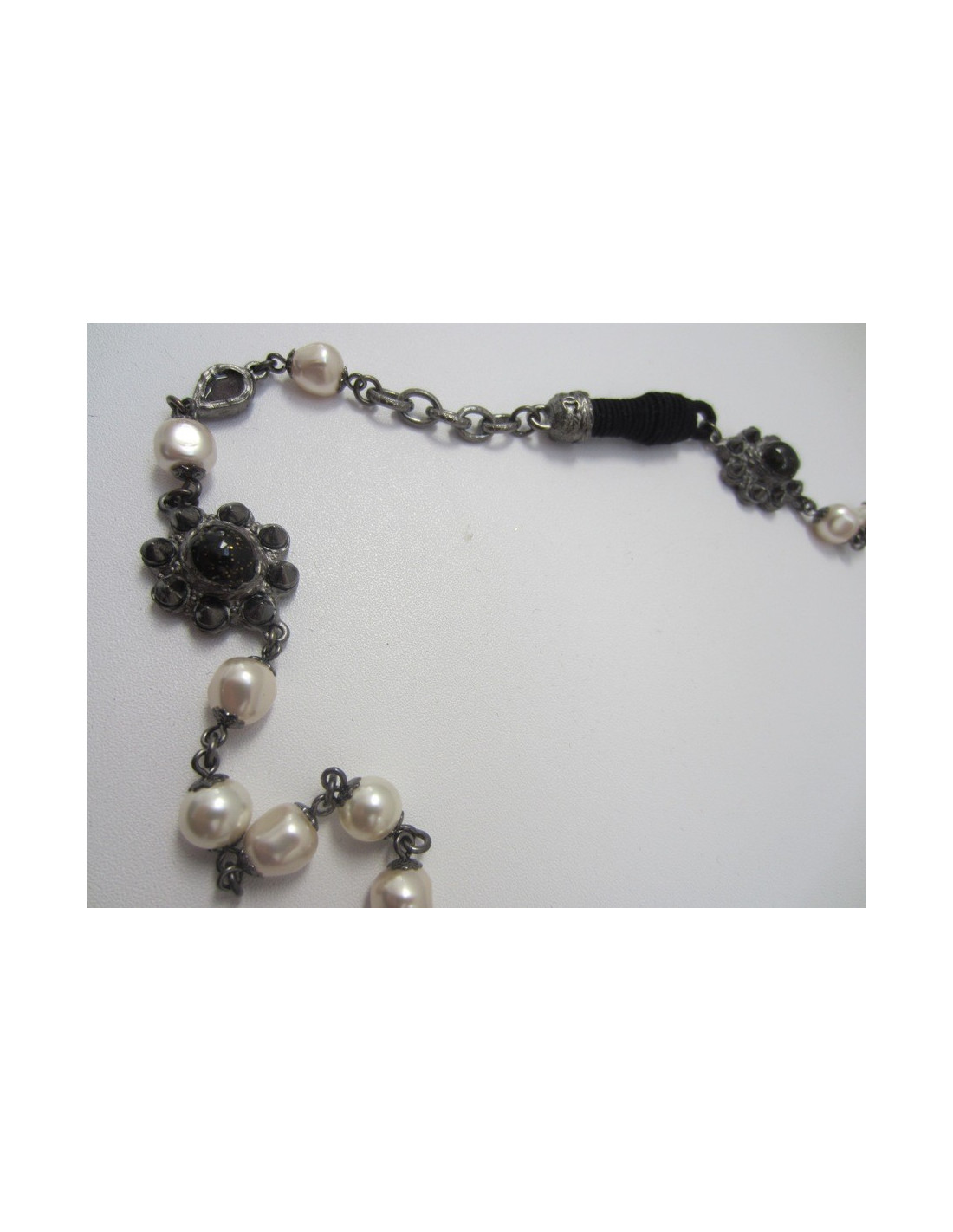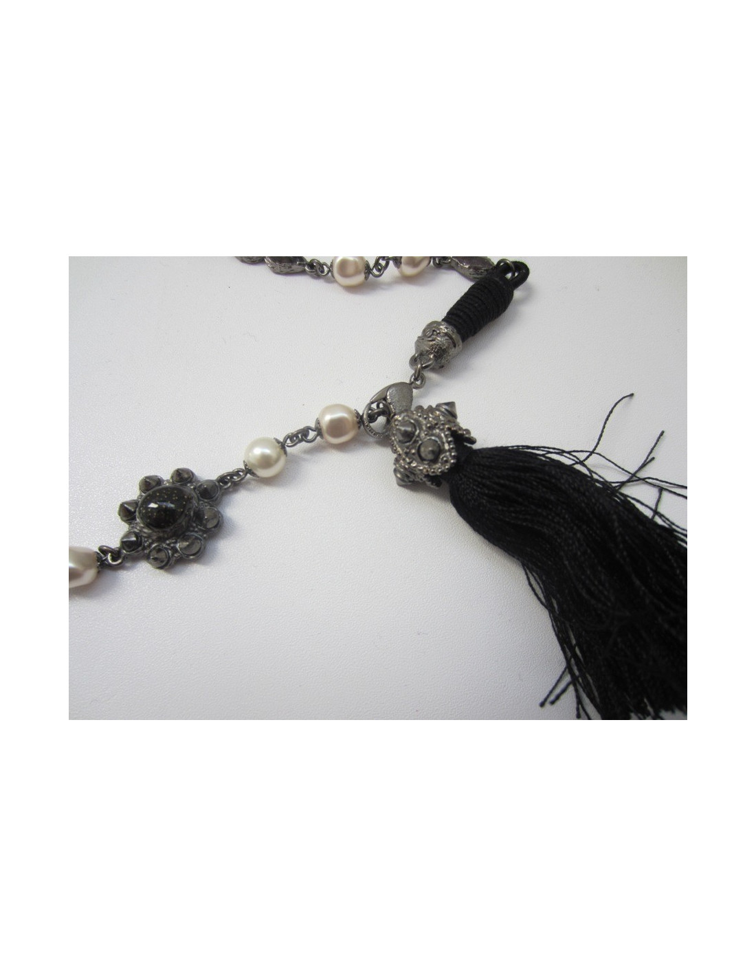Sublime long necklace, Chanel, Collection Paris-Byzance, pearly beads, CC glittery black glass paste, glittery glass paste elements black, drops translucent grey glass paste, mounted on matte black agent, black Pompom with tassels in black tissue and attached in tissues.