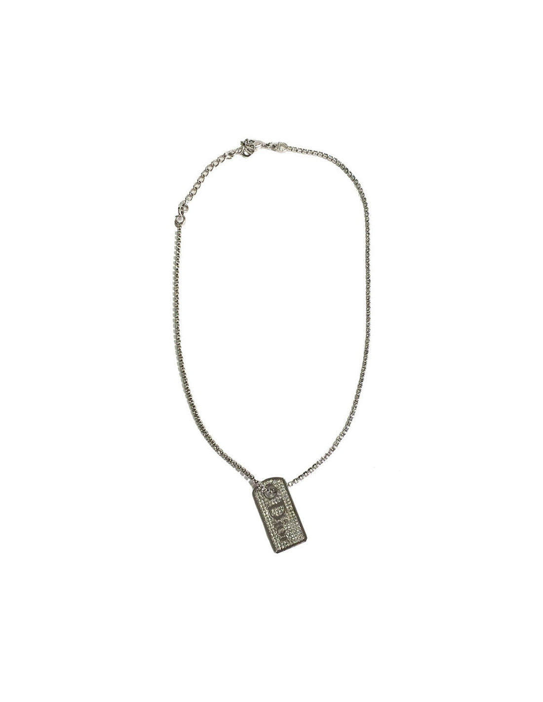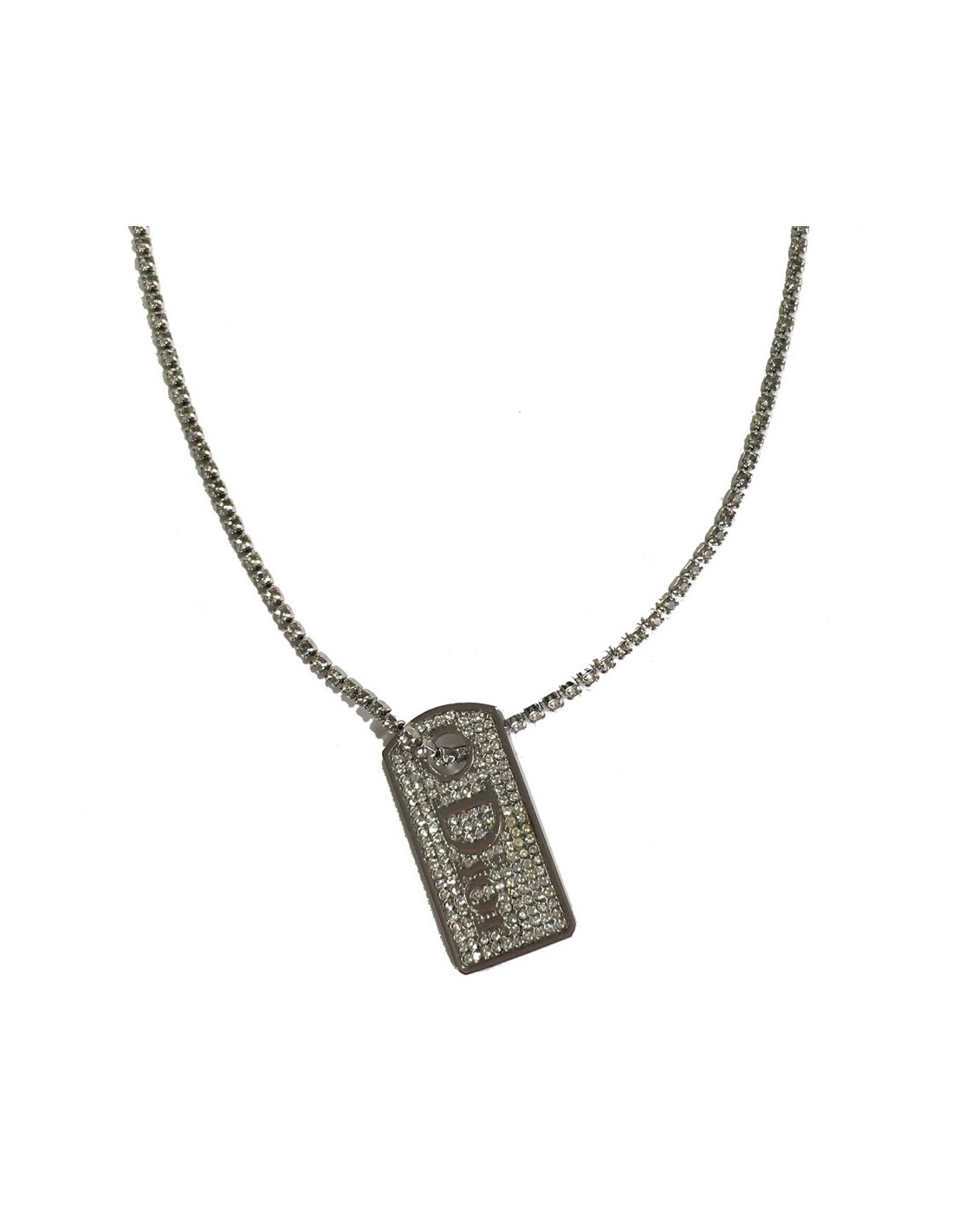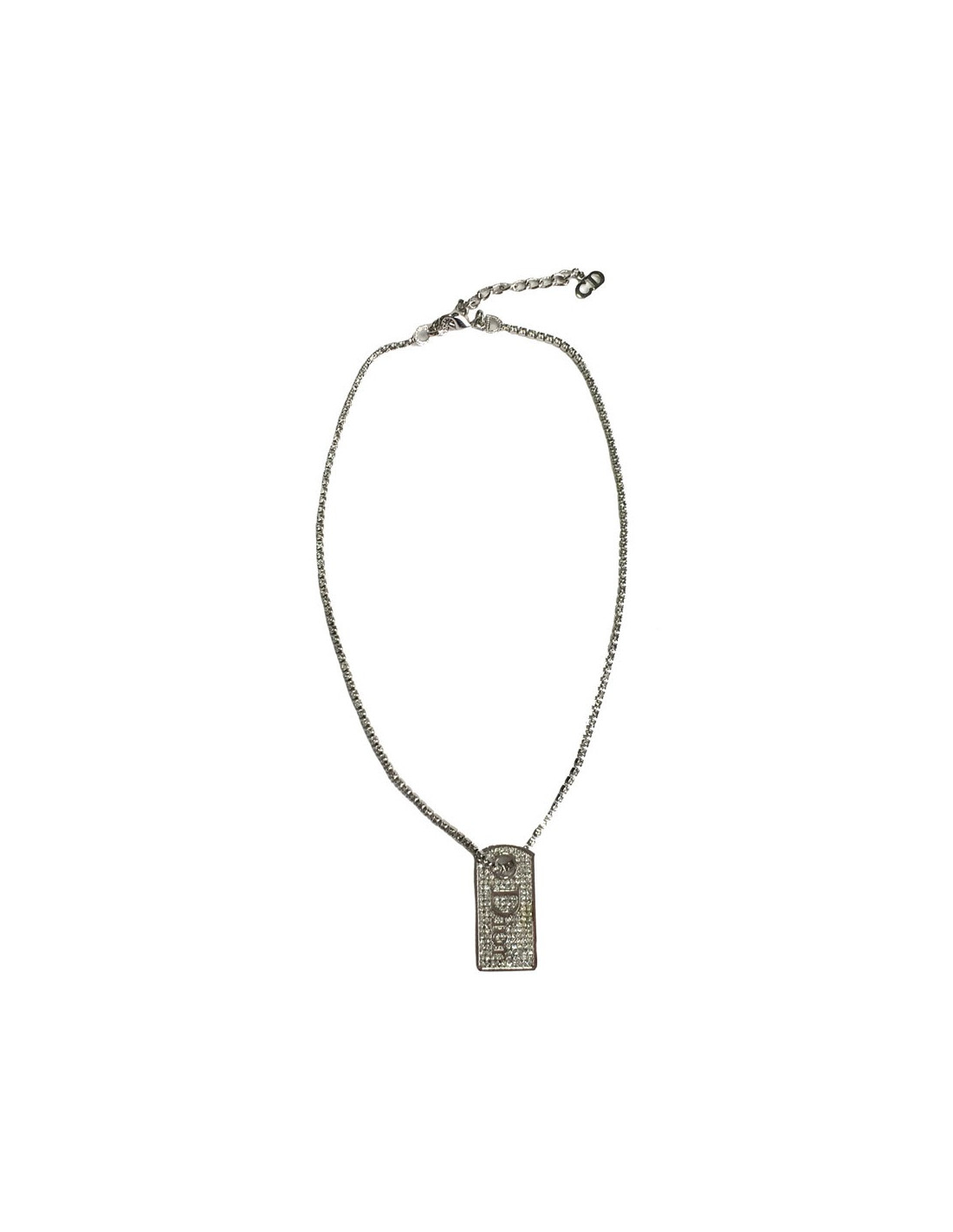 Collier Dior, chaîne en métal argenté serti sur toute sa longueur de strass, pendentif rectangulaire serti de strass avec en son centre l'inscription DIOR.
