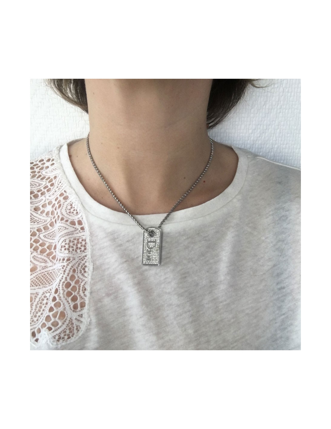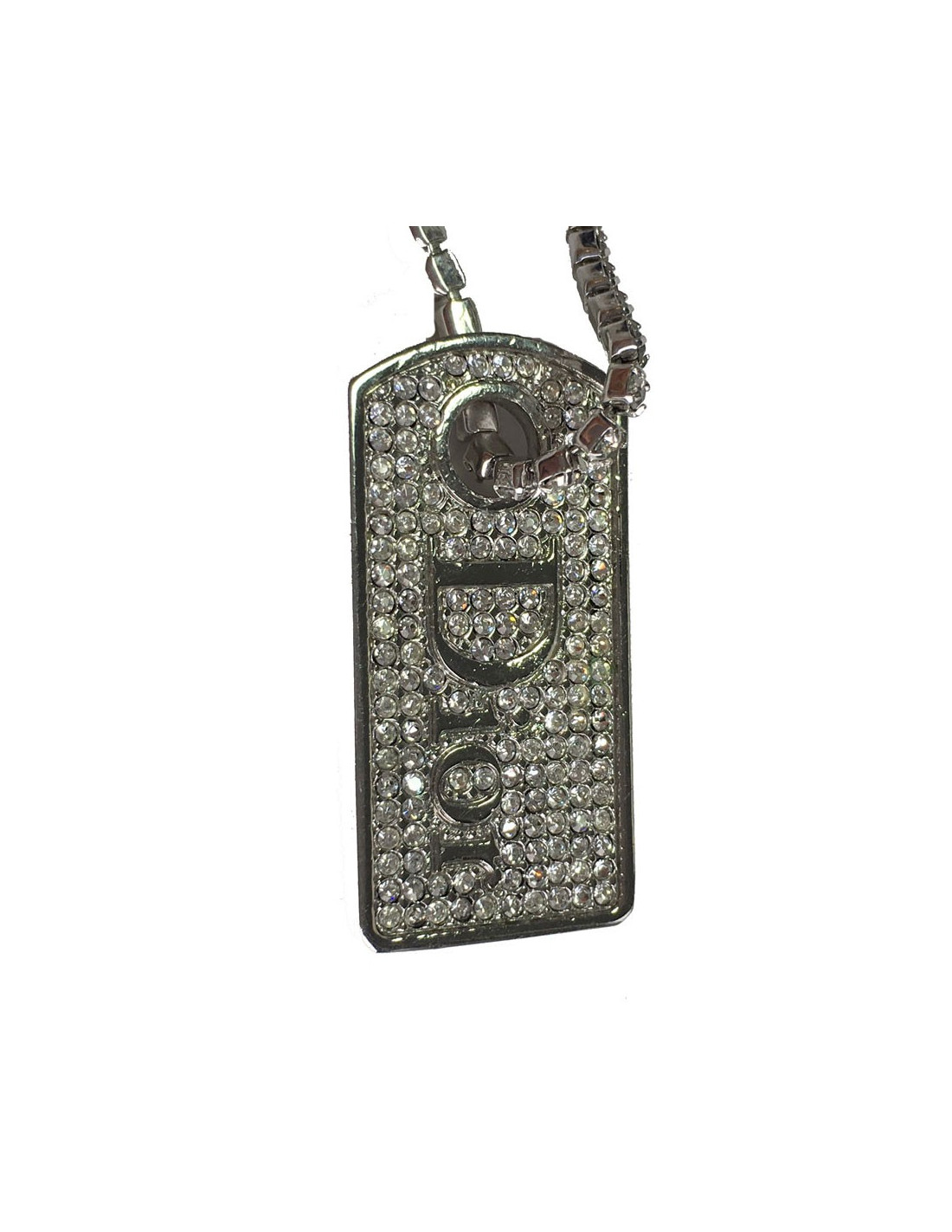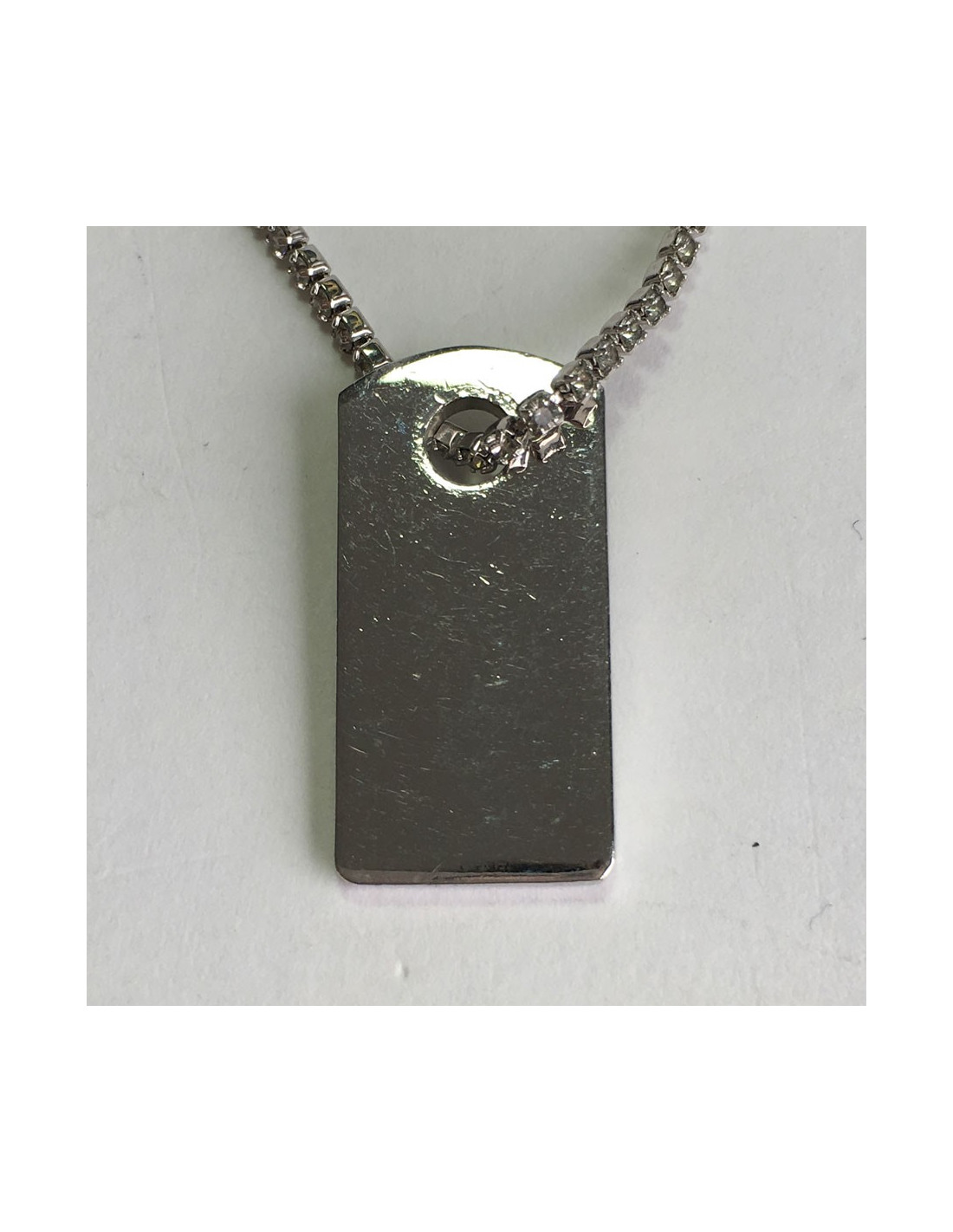 Collier Dior, chaîne en métal argenté serti sur toute sa longueur de strass, pendentif rectangulaire serti de strass avec en son centre l'inscription DIOR.