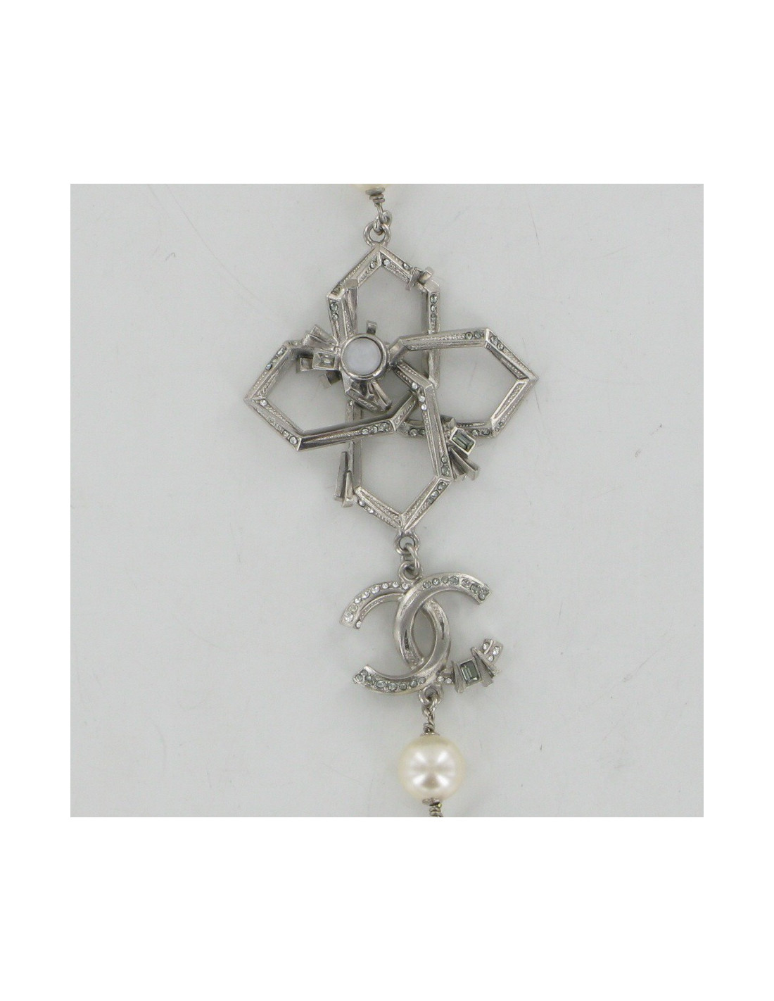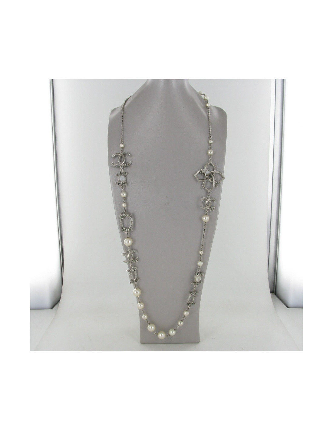 Last items in stock NECKLACES CHANEL ruthenium chain and pearly beads belt-necklace CHANEL 22057 1,200.00 € CHANEL belt in large matte ruthenium chain and pearls Made in FranceCondition: very goodMaterial: metal, pearly beadsColors: silver, mother-of-pearlHardware: mat ruthenium silver finish metalYear: Fall 2006Measurements: total length: 93cm, worn at its longest: 86.5cm, width: 1.5cmDetails: Chanel necklace-belt, large matte ruthenium metal chain, 3 pearly... Add to cart
