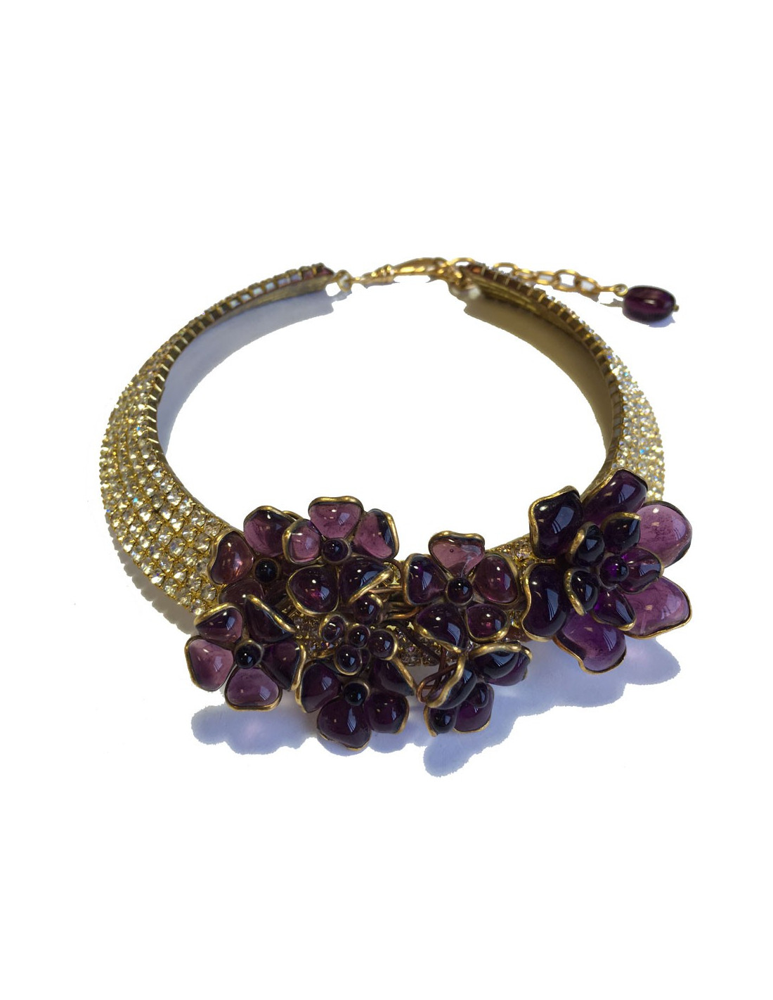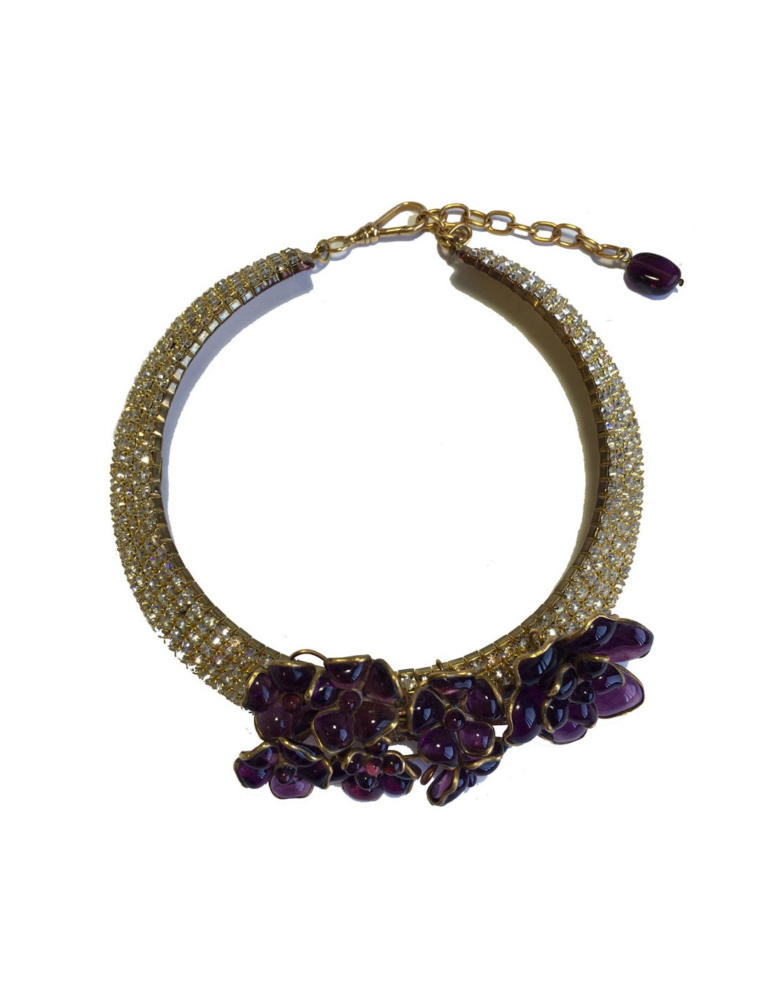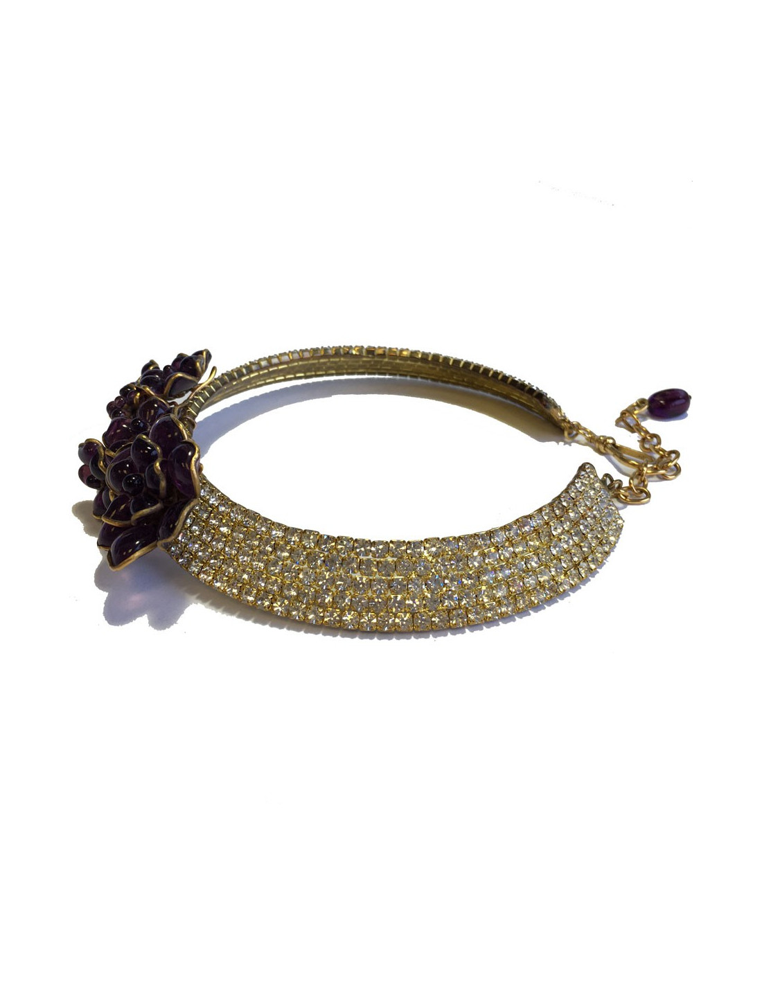 Superbe pièce. Collier ras de cou MARGUERITE de VALOIS, en métal doré à l'or fin, serti de strass et fleurettes en pâte de verre de couleur améthyste.