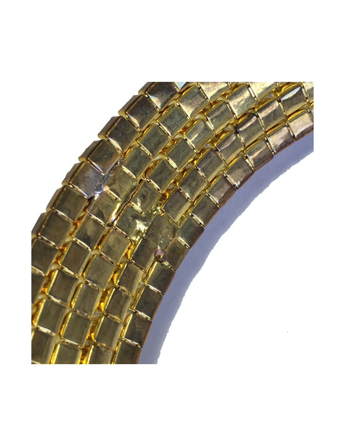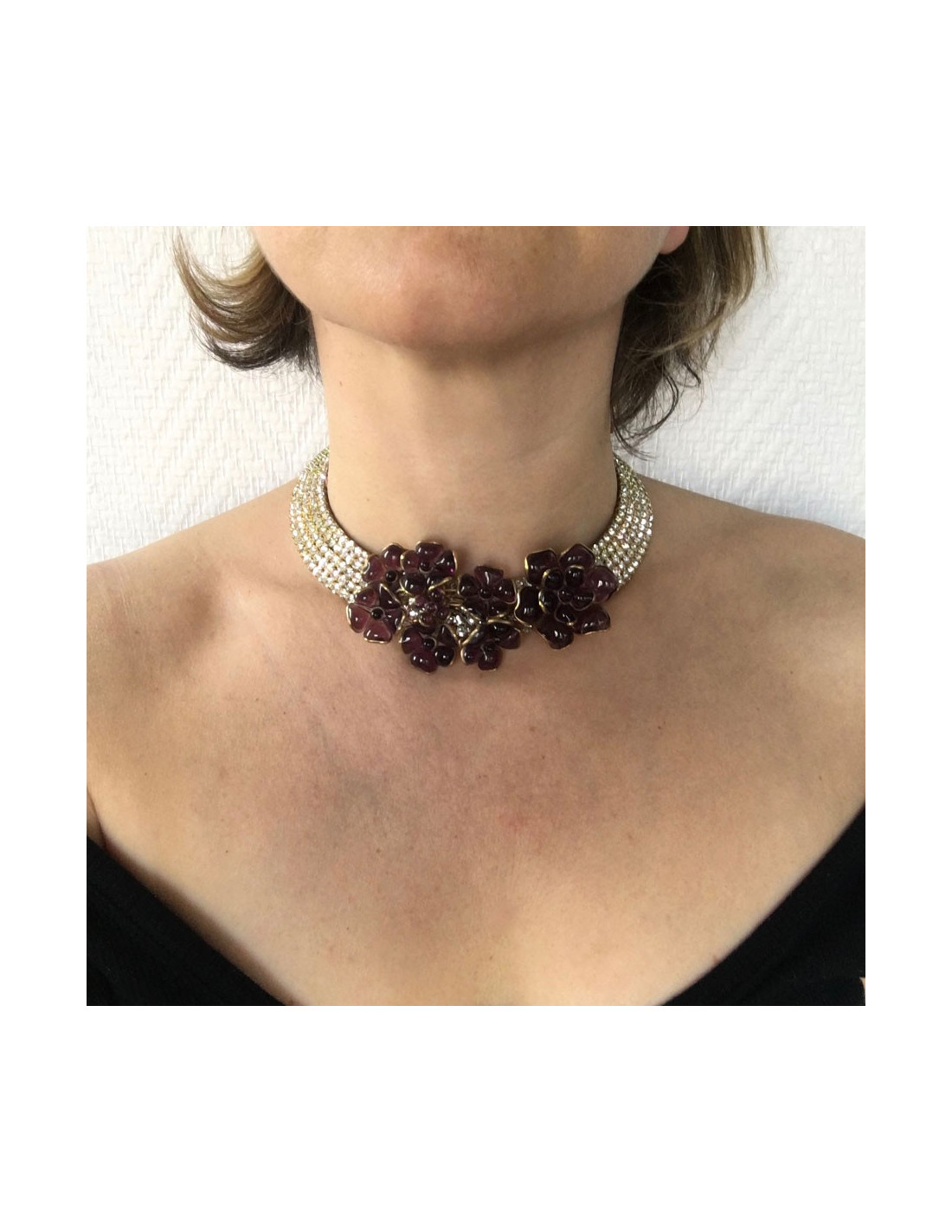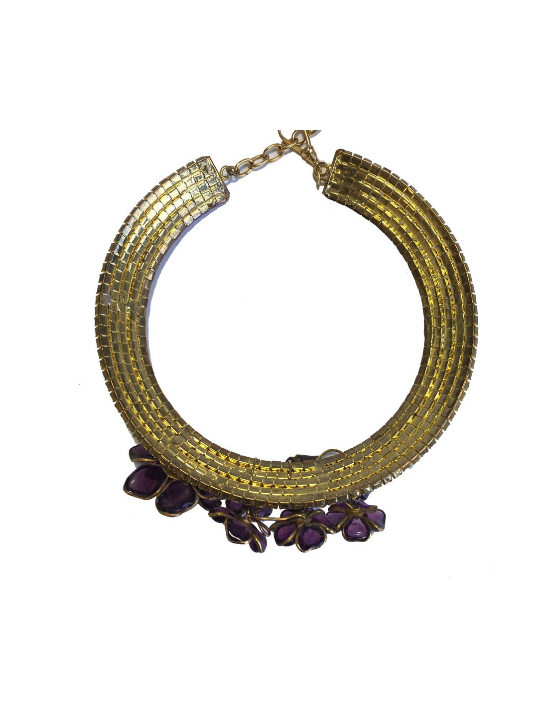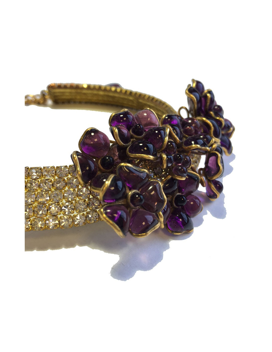 Superbe pièce. Collier ras de cou MARGUERITE de VALOIS, en métal doré à l'or fin, serti de strass et fleurettes en pâte de verre de couleur améthyste.