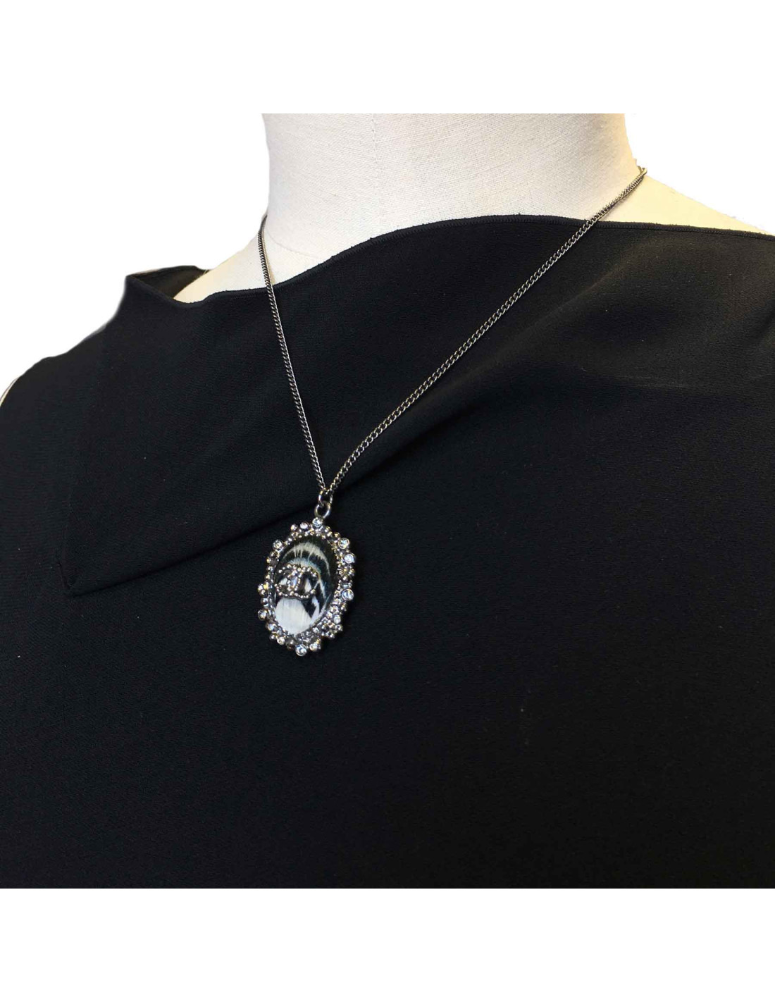 Very beautiful Chanel chain necklace in silver plated metal, silver plated pendant and feather, a center CC set with rhinestones on all its turn. The back of the pendant is in black glitter resin.