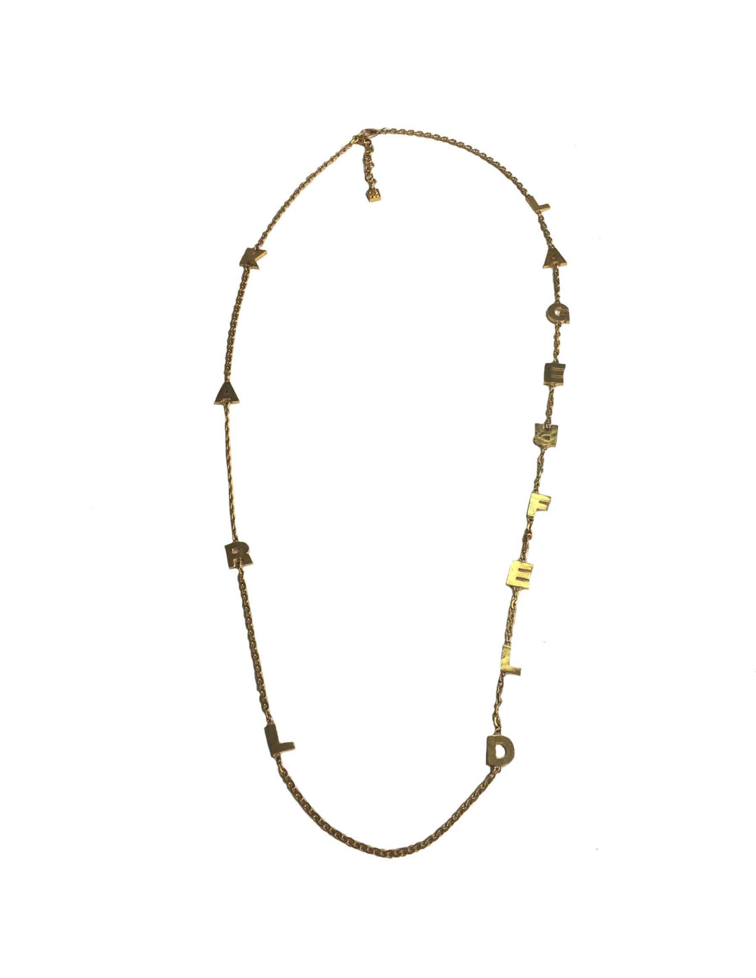 Last items in stock NECKLACES CHRISTIAN DIOR charms belt-necklace DIOR 36876 1,150.00 € CHRISTIAN DIOR vintage belt-necklace Condition : very goodMade in FranceMaterials : metal, rhinestonesColor : goldMeasurements : total length: 80 cm, width : 2.5 cmStamp : yesDetails : Can be worn as a necklace or belt, adjustable with a toggle clasp. No rhinestones are missing on these charms. Add to cart