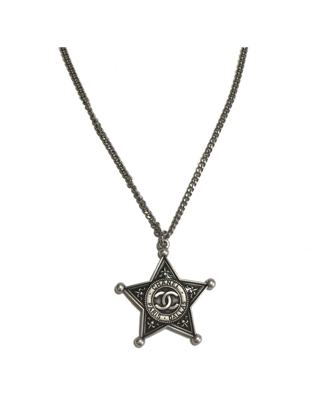 Collier CHANEL pendentif collection Paris Dallas en métal argenté