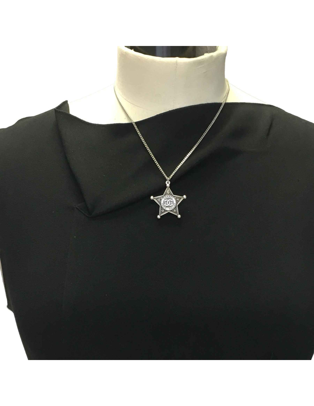 Collier Chanel collection des Métiers d'Art "Paris Dallas" en métal argenté. Pendentif étoile de shérif.