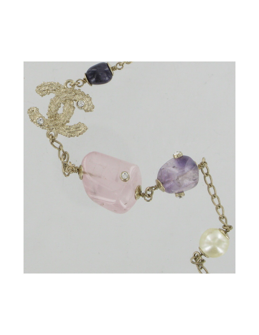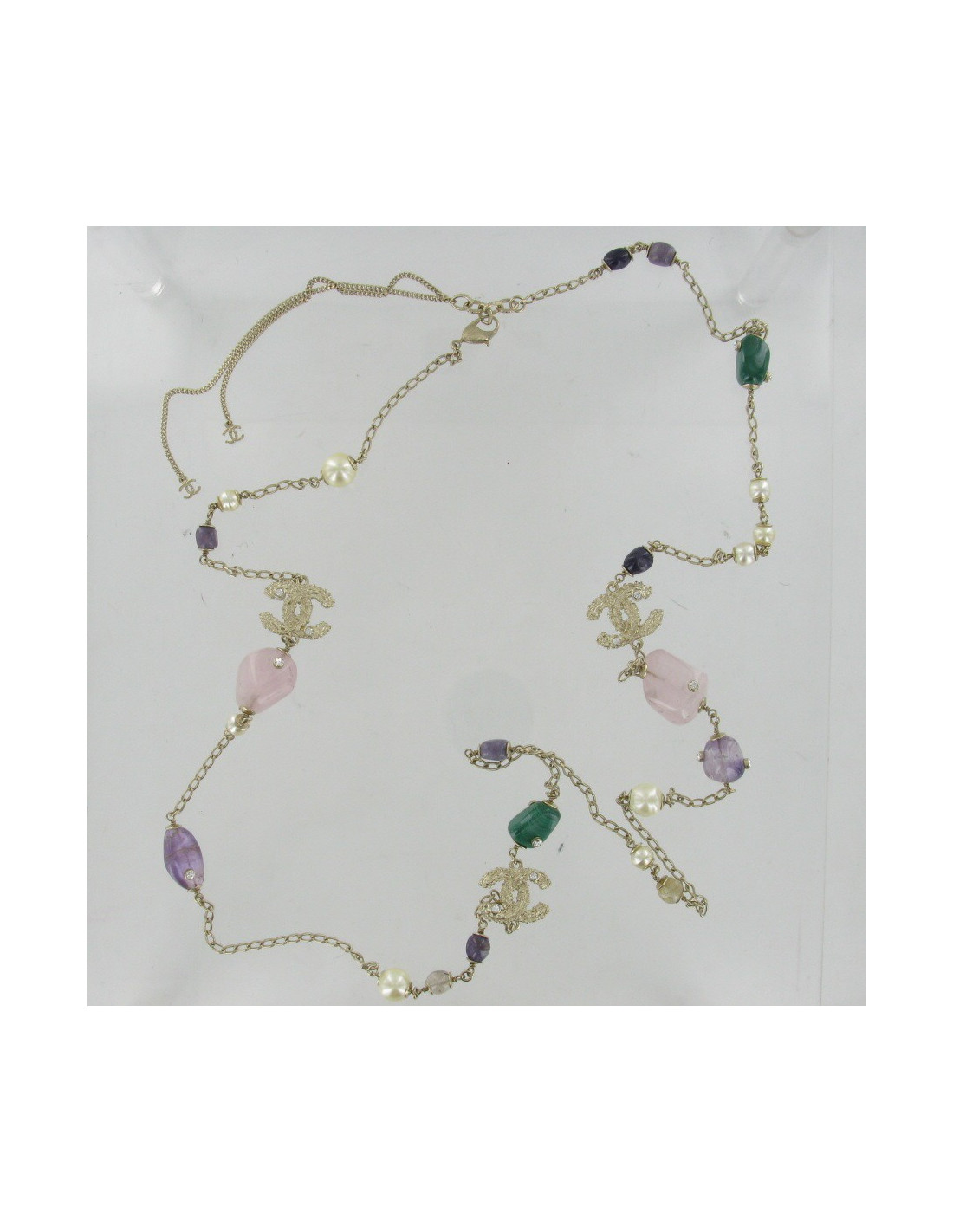 Sublime necklace Chanel composed of multicolored stones, a golden metal chain end composed this gorgeous necklace or rose quartz, the malachite, amethysts and Pearly pearls mingle. Each of these beautiful stone is set with a rhinestone. This necklace can be worn in singles where duplicate round.
