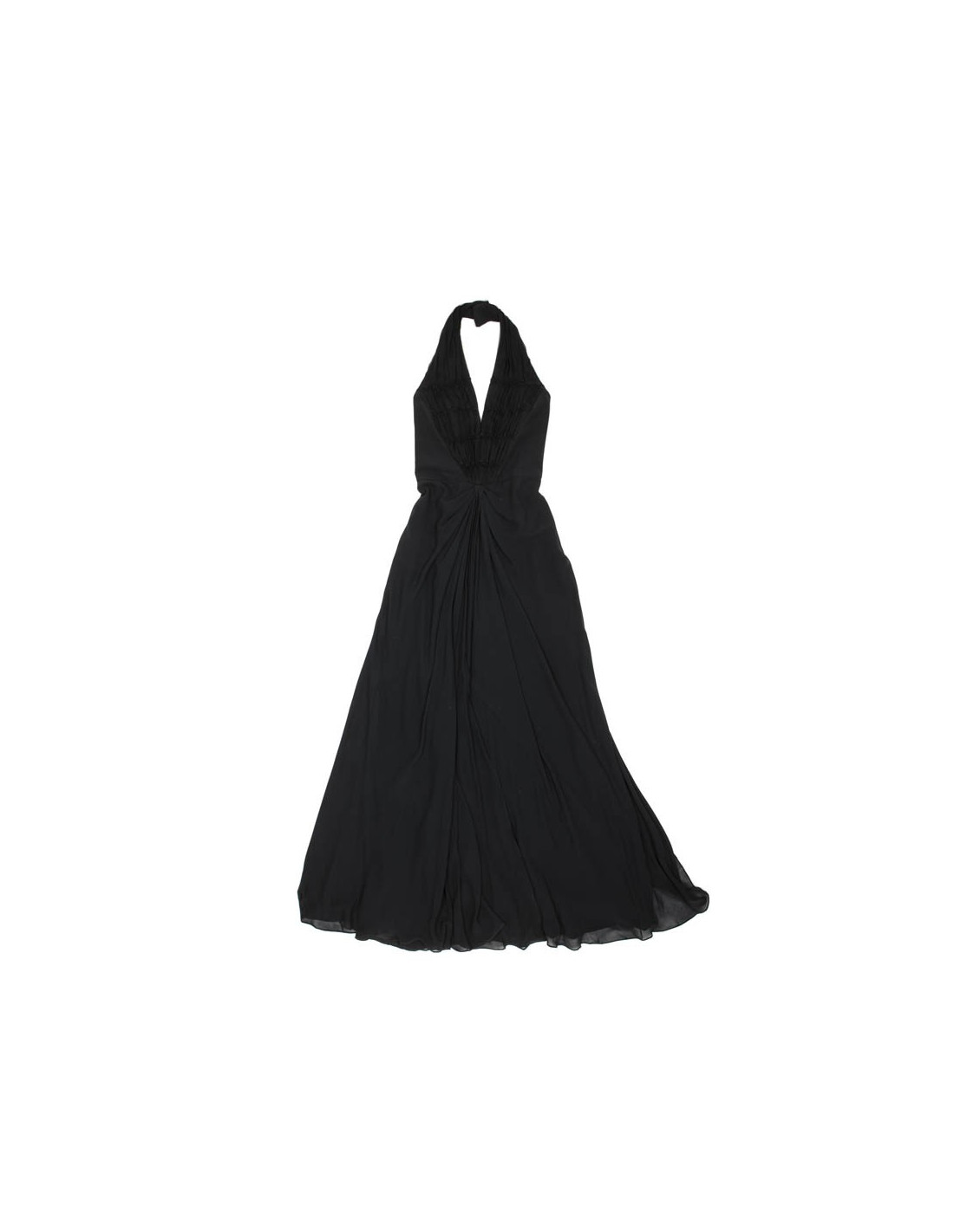 Christian Dior by John Galliano long dress in black silk. Sleeveless and backless, attached in the neck by invisible hooks. It closes with a series of small buttons on the left side of the dress. There are smokes on the chest and wide opening on the bottom.