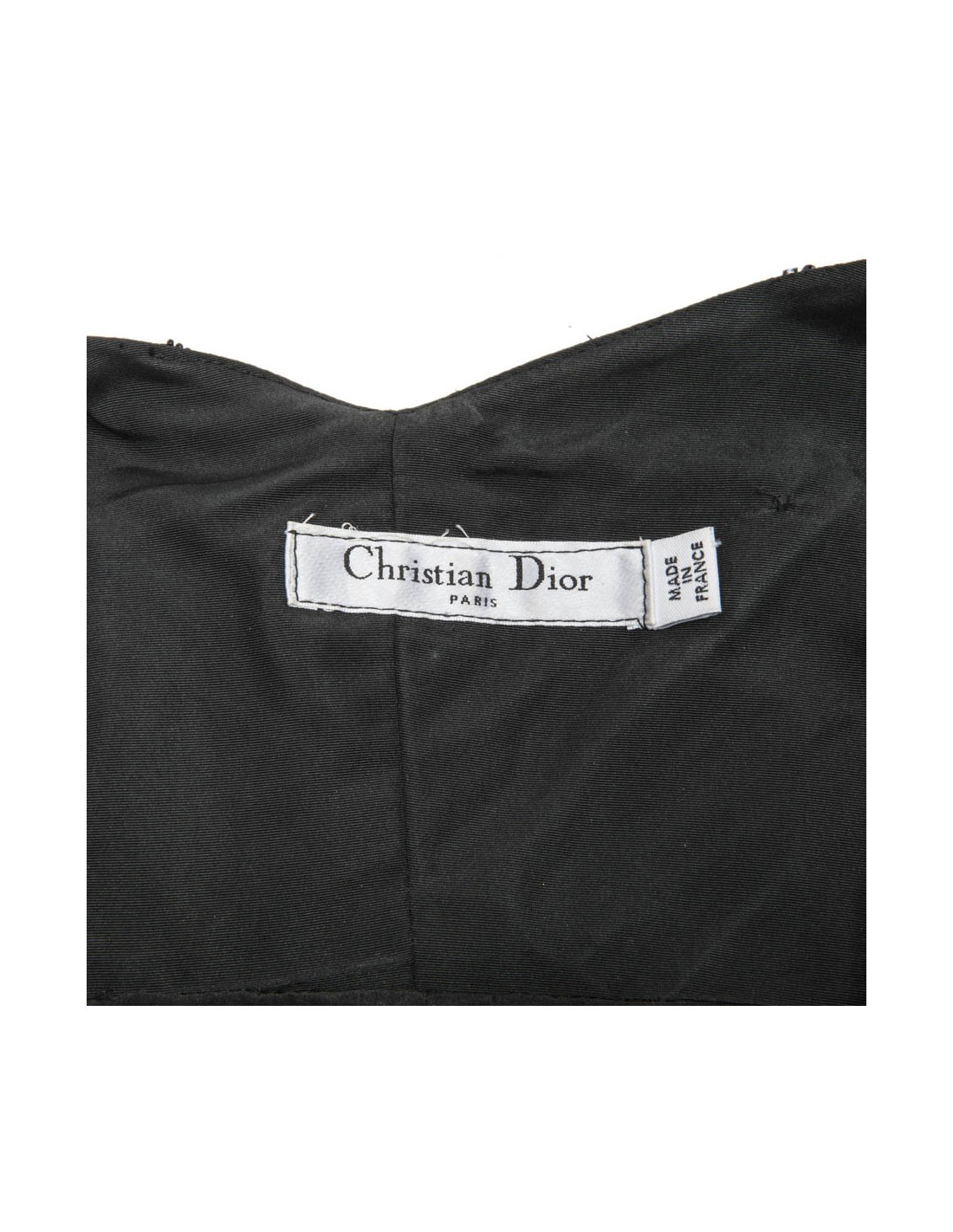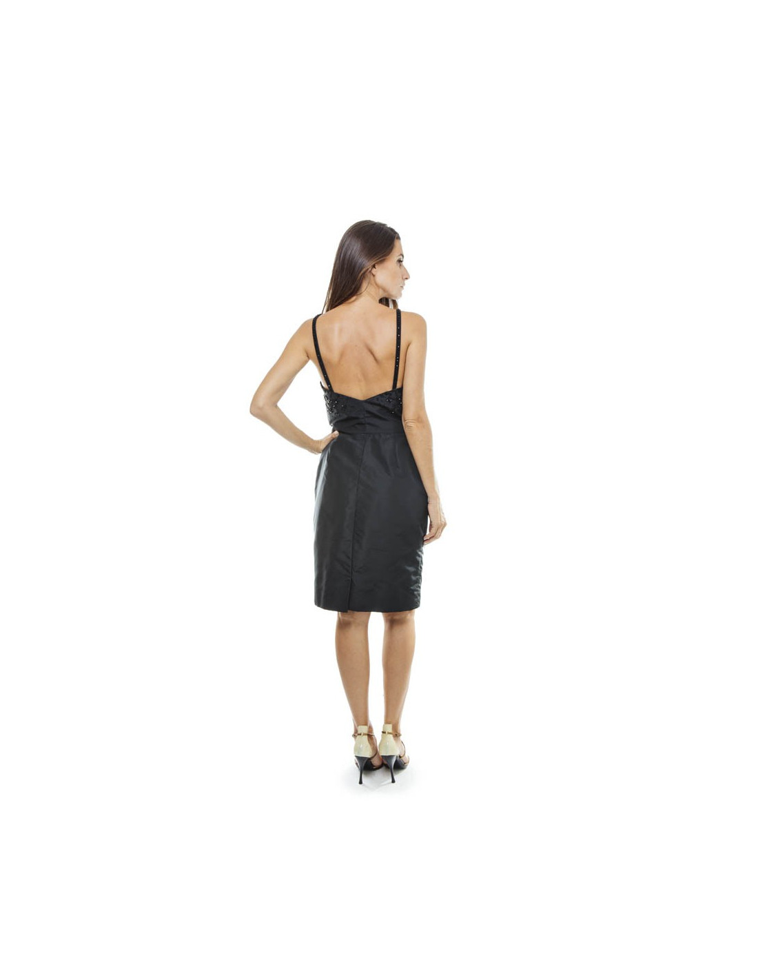 Sheath cut, bust and straps are embroidered with black pearls. Silk lining, zipped on the left side, 36 cm long.