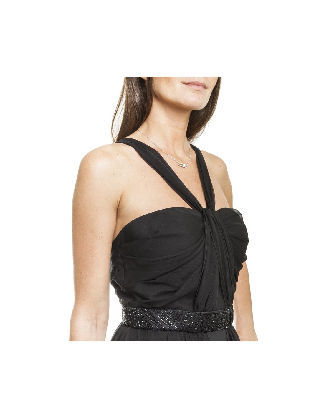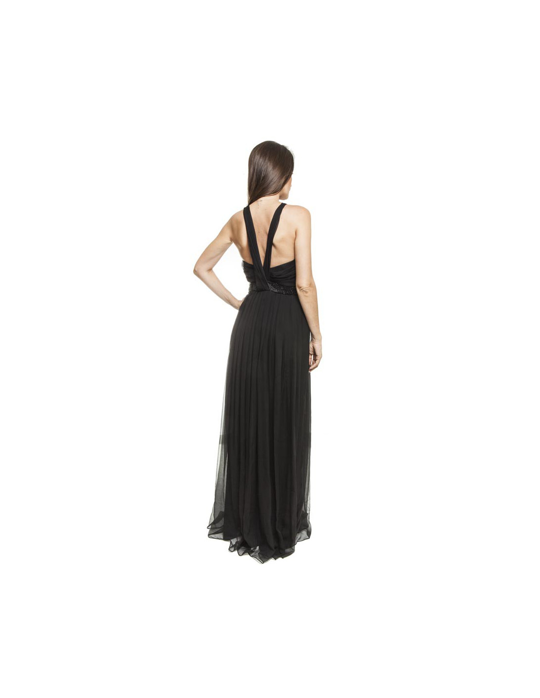 Details: CHRISTIAN DIOR evening dress, John Galliano era, in black silk size 38 FR. Made in France. Draped and crossed on the neckline, high black beaded belt, many small buttons all along the left side of the dress. Black silk lining.