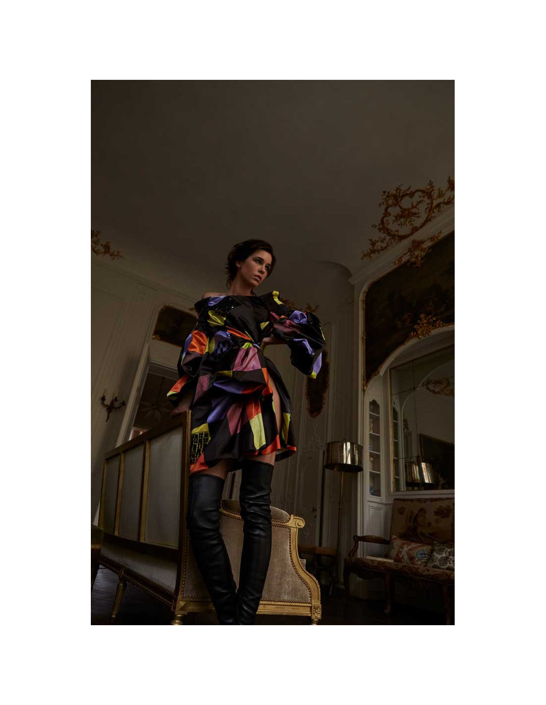 Spectacular Christian Lacroix couture dress with multicolored printed patterns with lace patches and black sequins. It is made of cotton and silk. The dress is reinforced by a bustier. The lining is in silk and cotton. The sleeves are 3/4 very wide. It opens on the side.