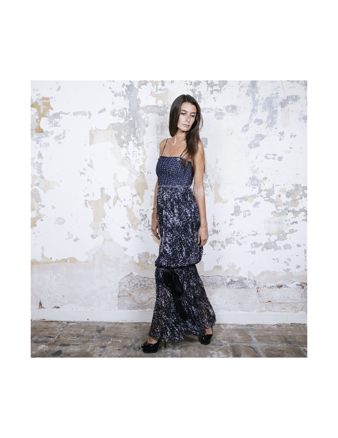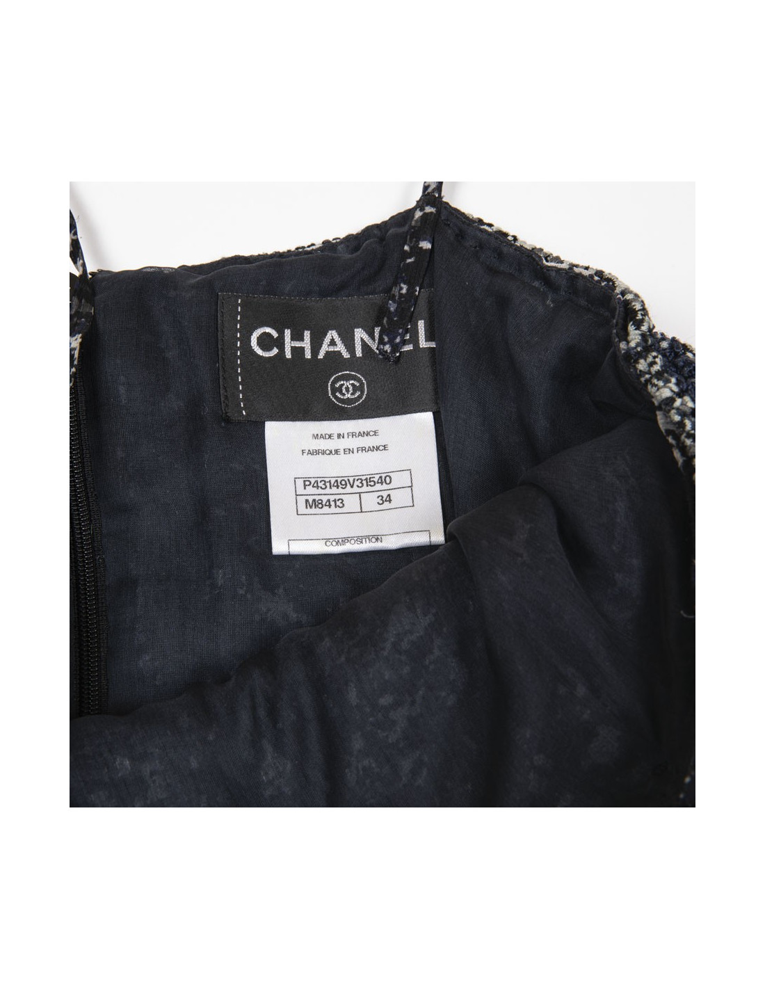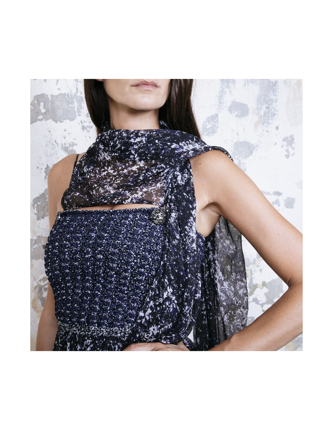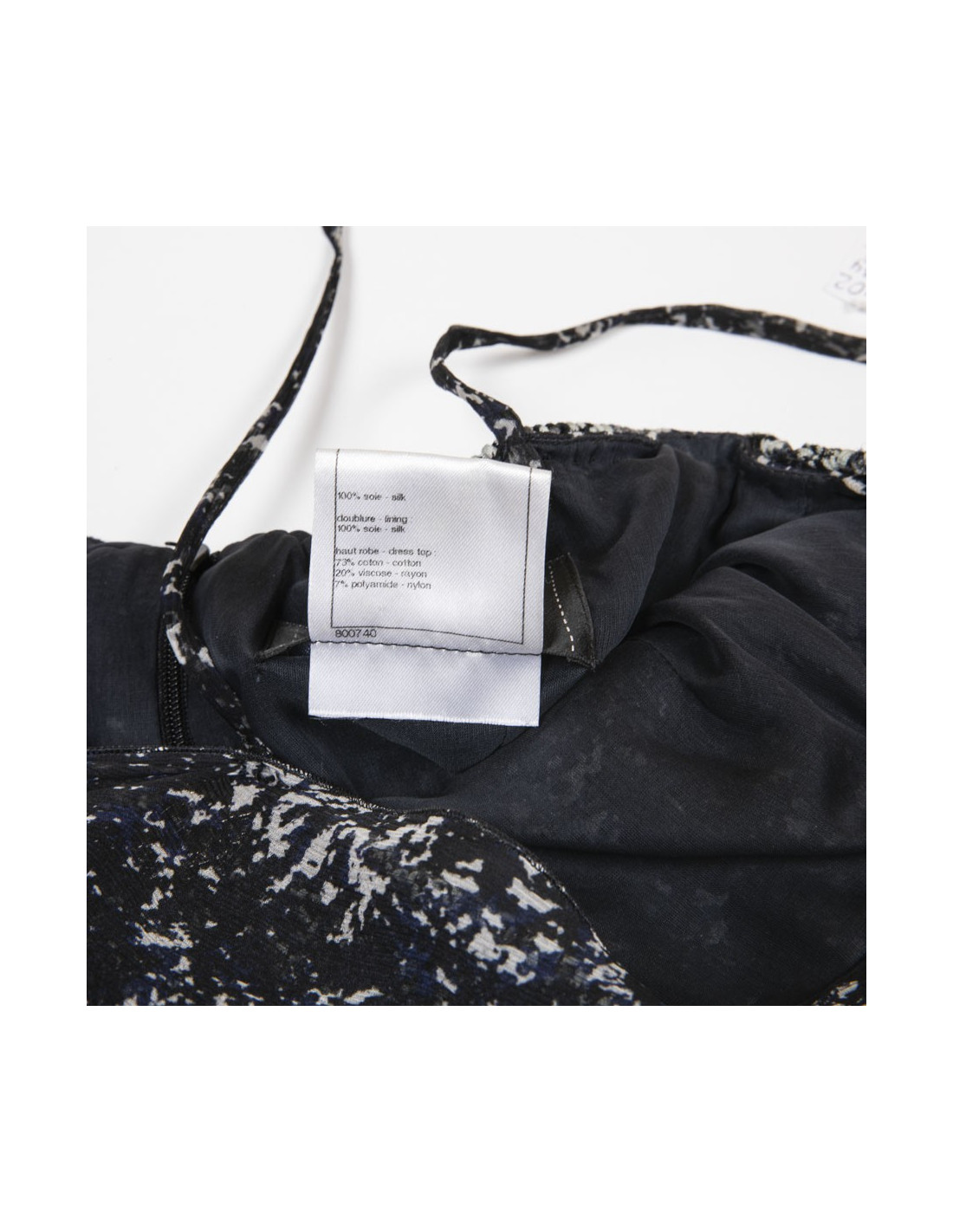 Chanel evening dress in blue and white printed silk, with thin straps. Braided cotton bustier. CC signatures in ruthenium metal and stones on the bustier. Removable silk stole (to tie on the neck). Zipper on the back and staple. Silk lining. Bottom of the dress tightened with a knot. Size 34 FR