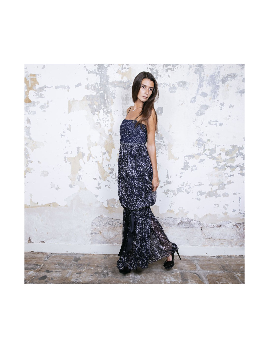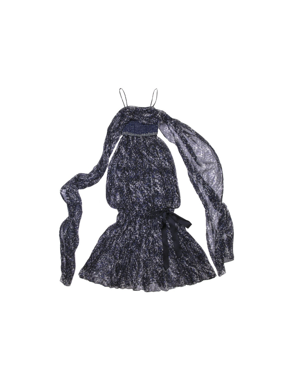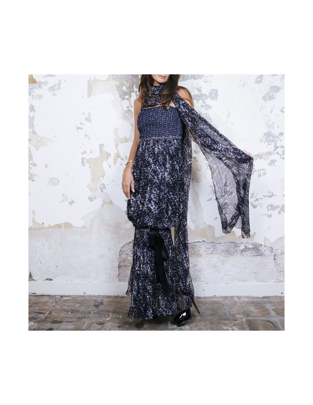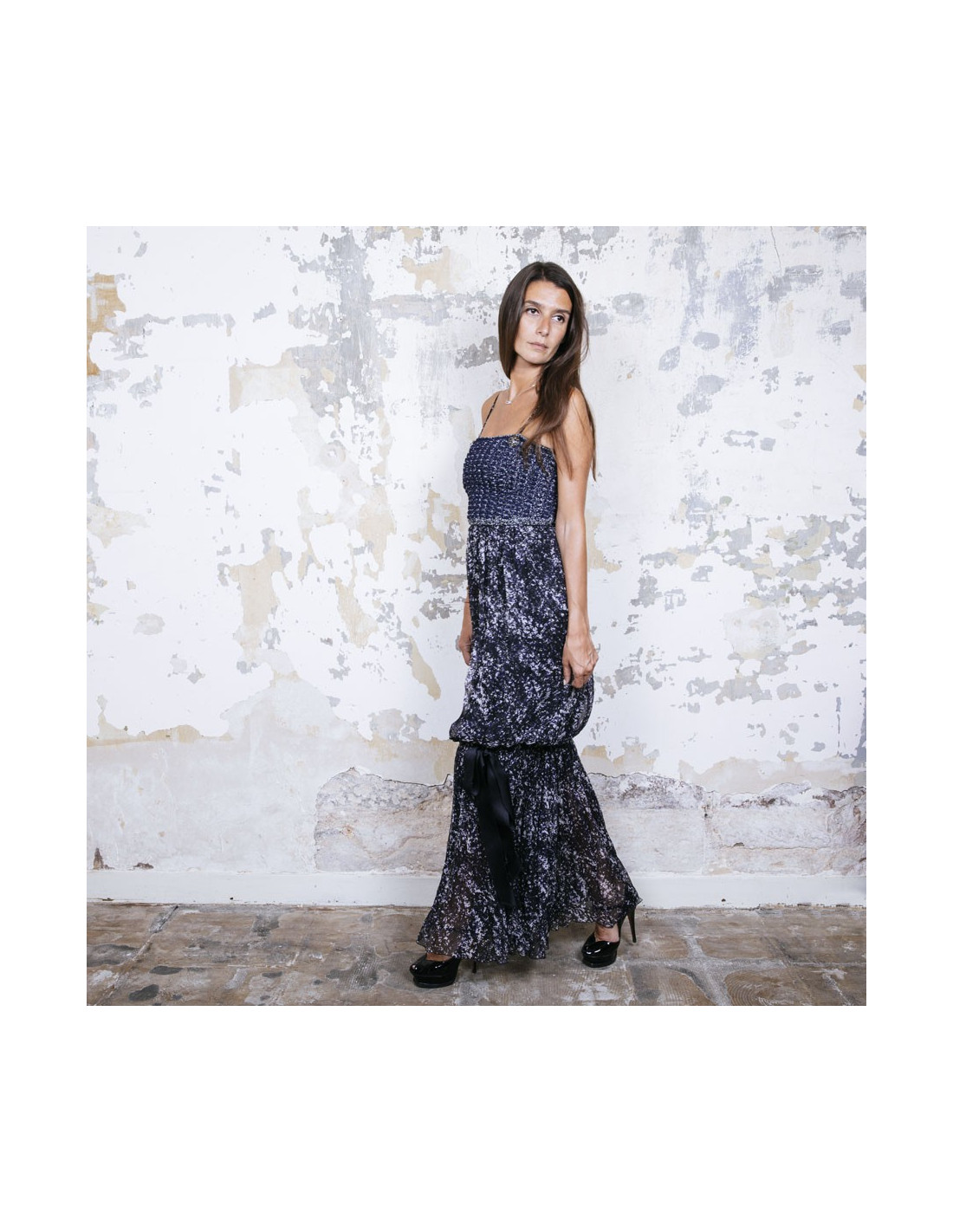 Chanel evening dress in blue and white printed silk, with thin straps. Braided cotton bustier. CC signatures in ruthenium metal and stones on the bustier. Removable silk stole (to tie on the neck). Zipper on the back and staple. Silk lining. Bottom of the dress tightened with a knot. Size 34 FR