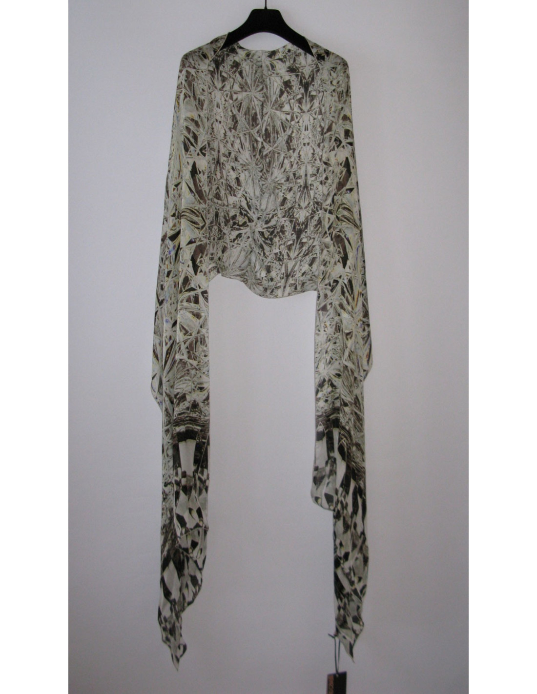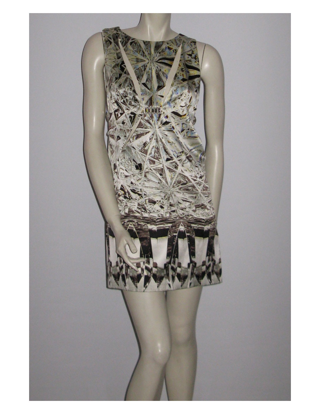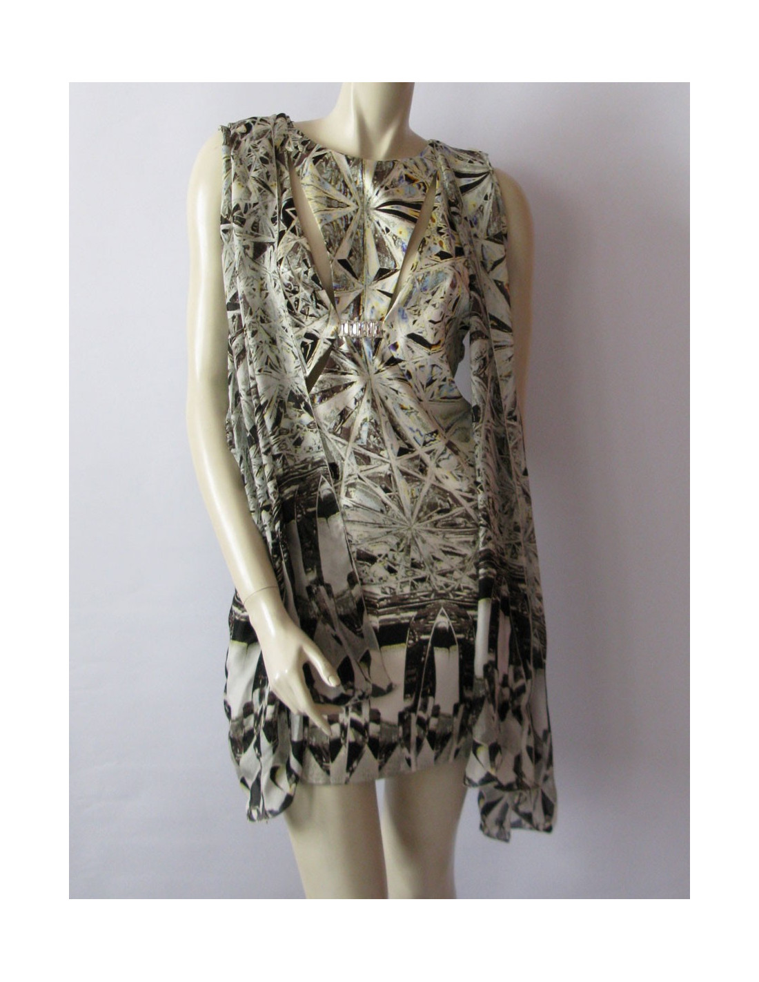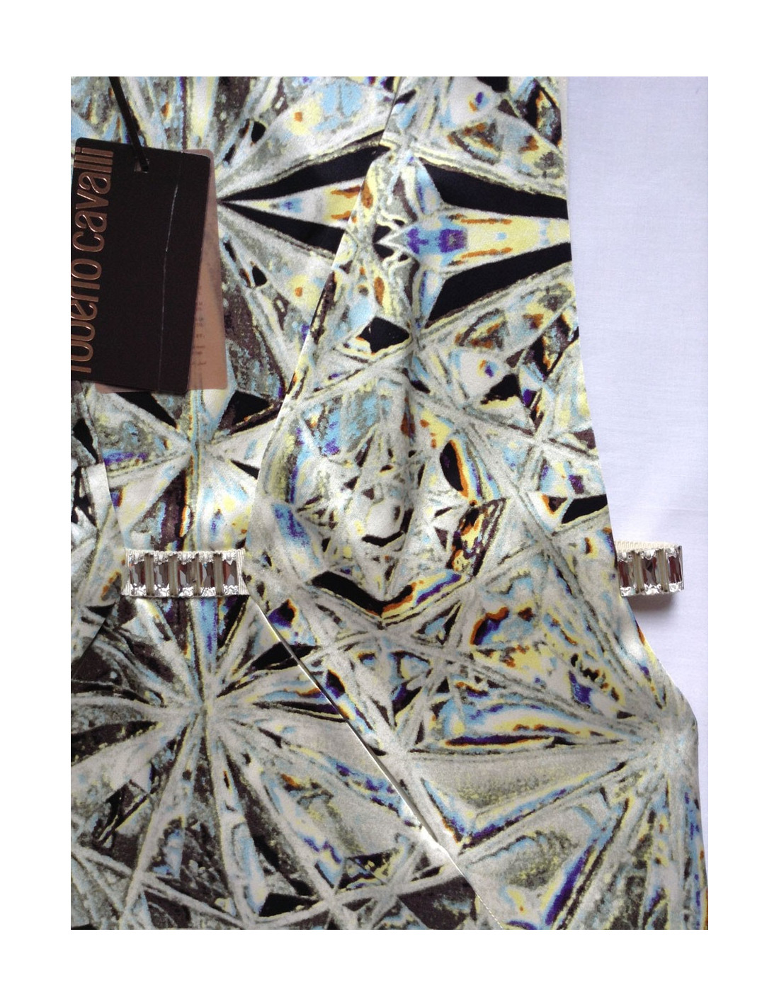 Dress and stole ROBERTO CAVALLI printed greenhouse "diamond shine" turquoise, Amethyst, agate, opal, jasper and aquamarine. Application of rhinestones to the Center, on the back and on each side, rhinestones are bending attachment. Dress fitted top and flared at the bottom. Round-neck, sleeveless. Closure with 3 buttons on pressure in the right shoulder. Note the originality of this coin by its many details such as "cracks" in the centre and back. The stole is enhanced with a silver wire. Size 40it 100% silk. Dress: Length: 82 cm, Chest width: 34 cm Waist: 82 cm, Hip: 46 cm Build: 36 cm, Bottom of the dress: 50 cm Stole: Width: 65 cm, Length: 273 cm
