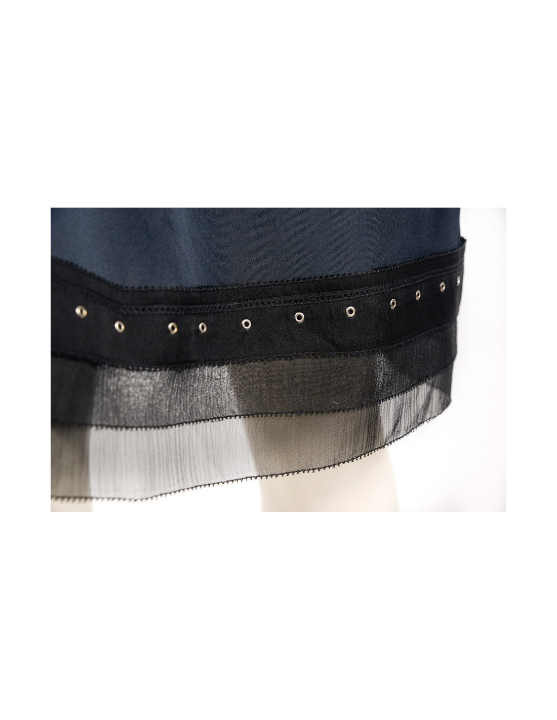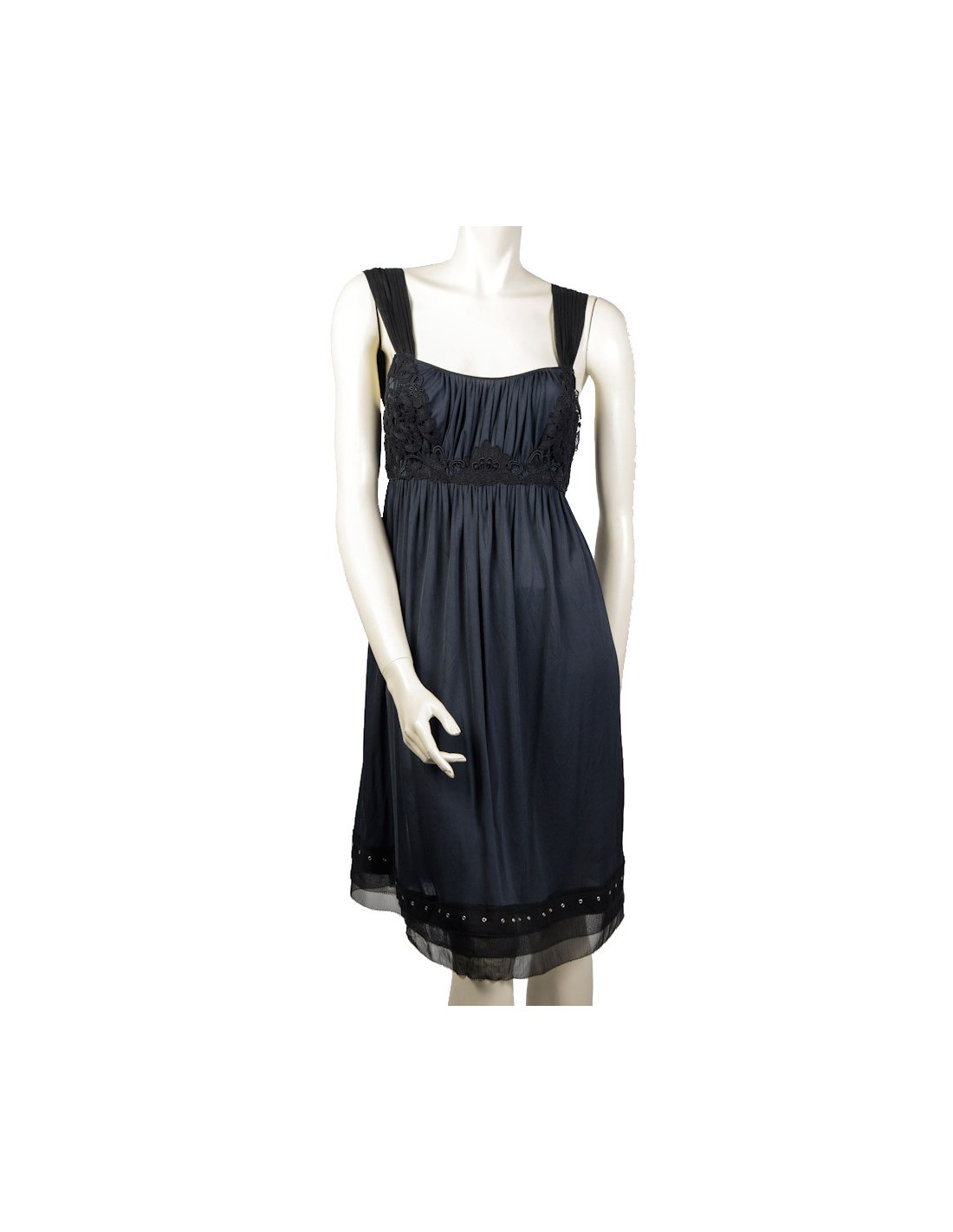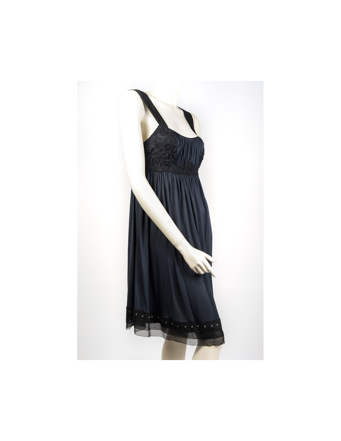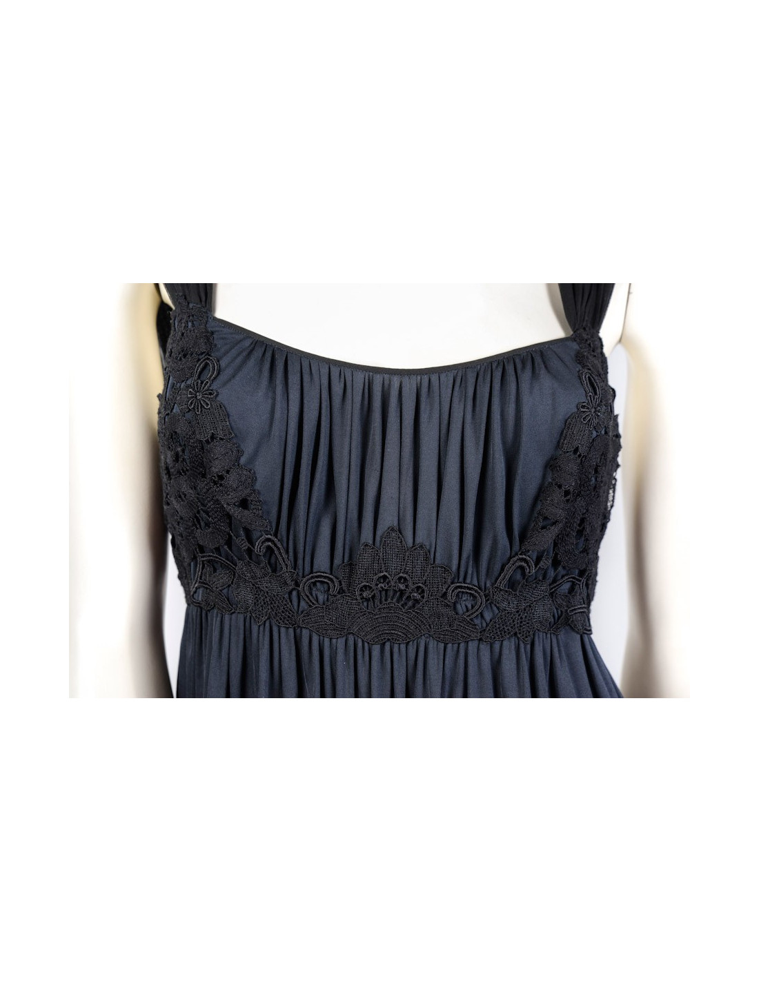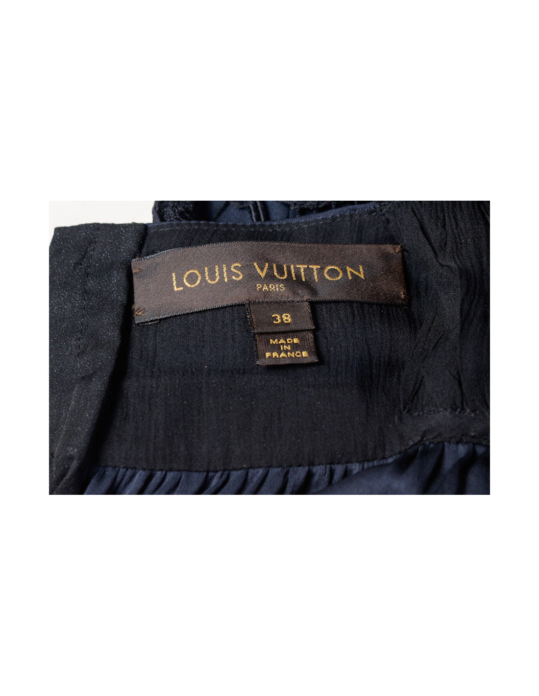 Louis Vuitton T38 in black viscose fluid, the top is black lace and large pleated strapless black silk dress. Closed at the back by 6 buttons covered with silk and snaps. At the bottom of the dress, three rows of black silk with a studded gold.
