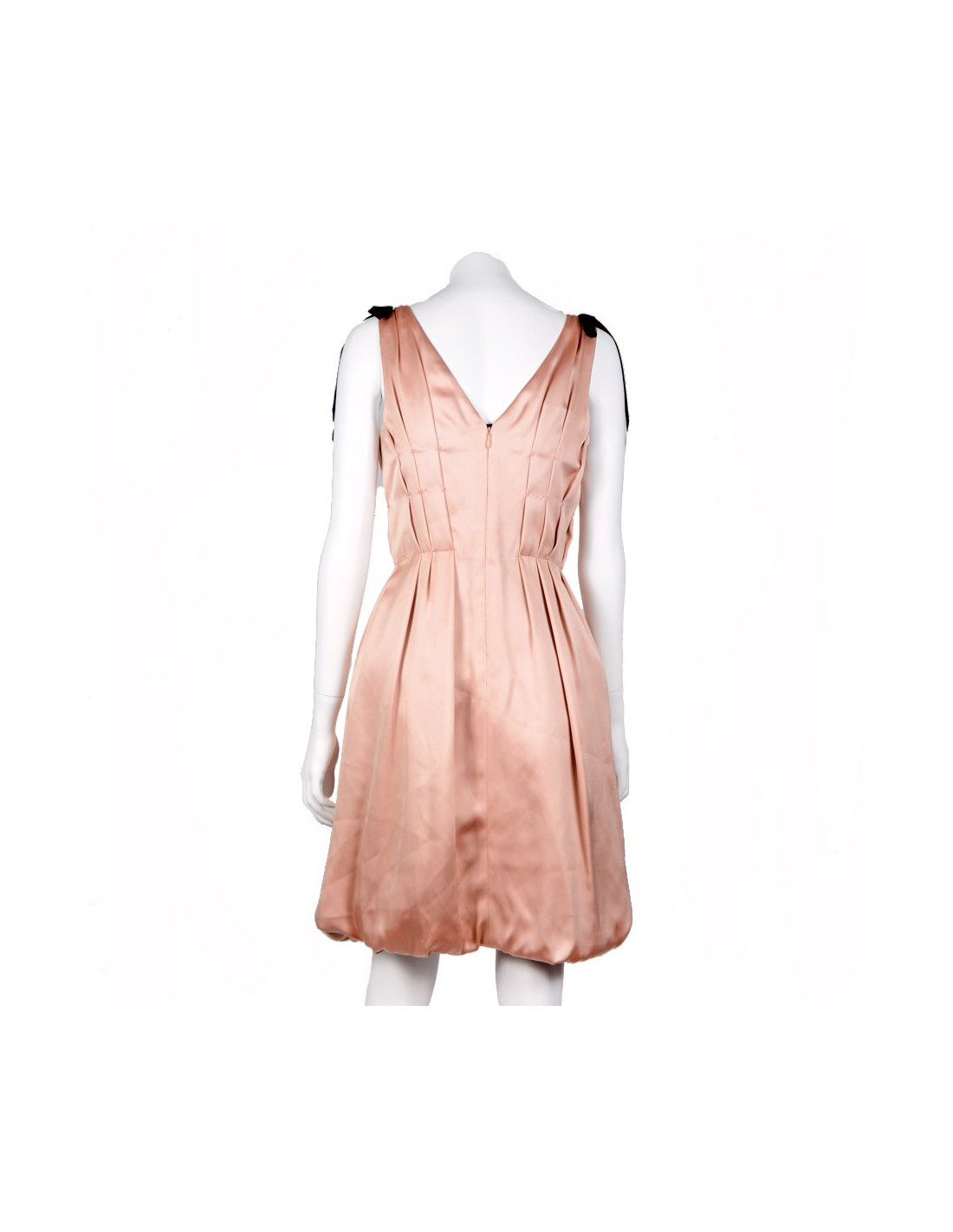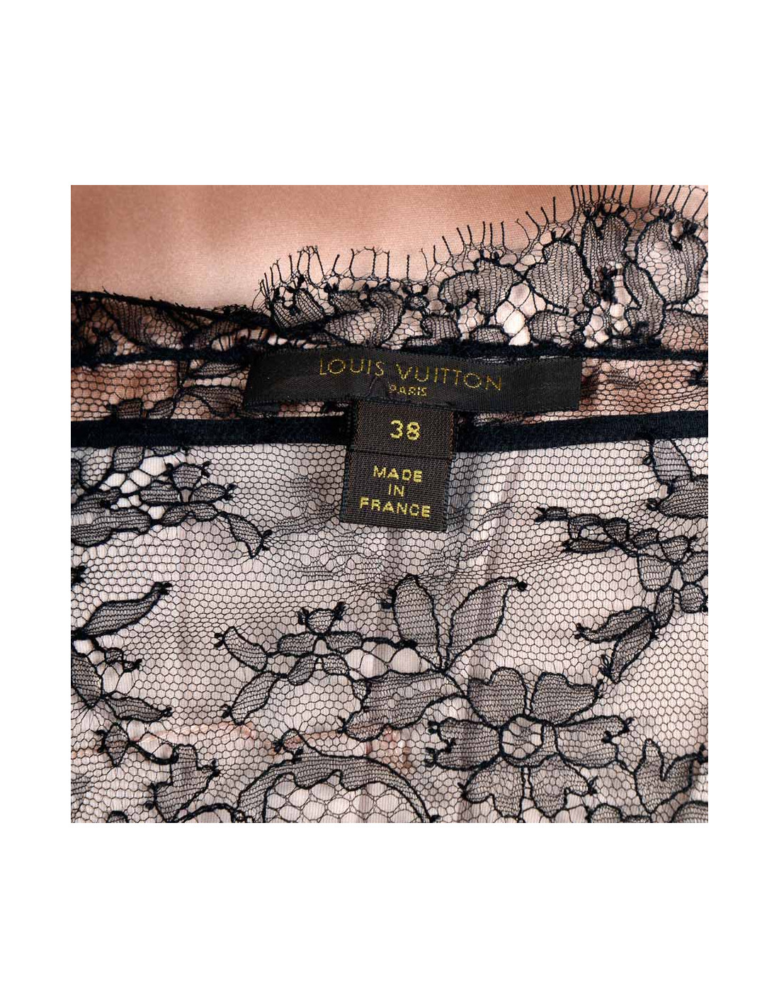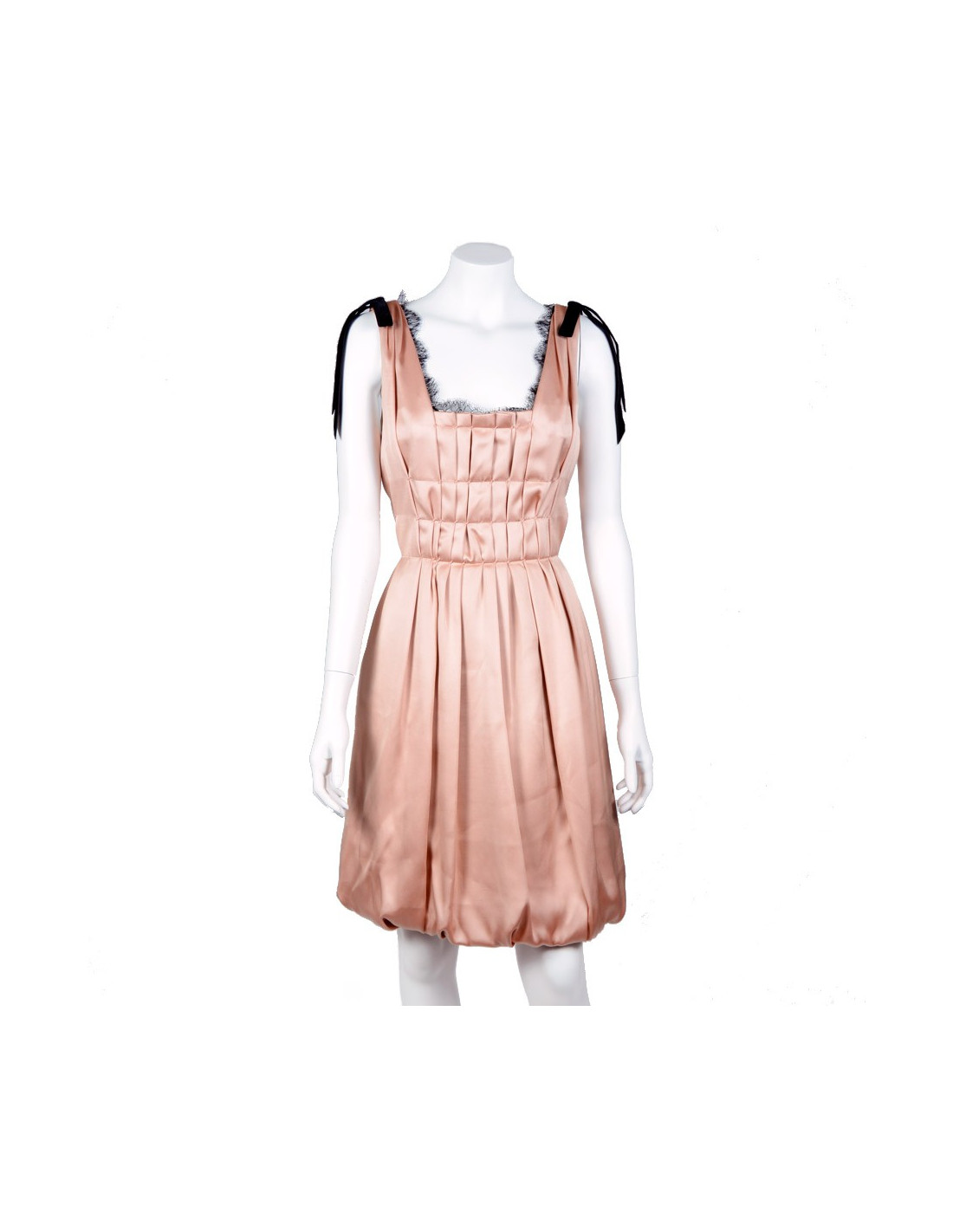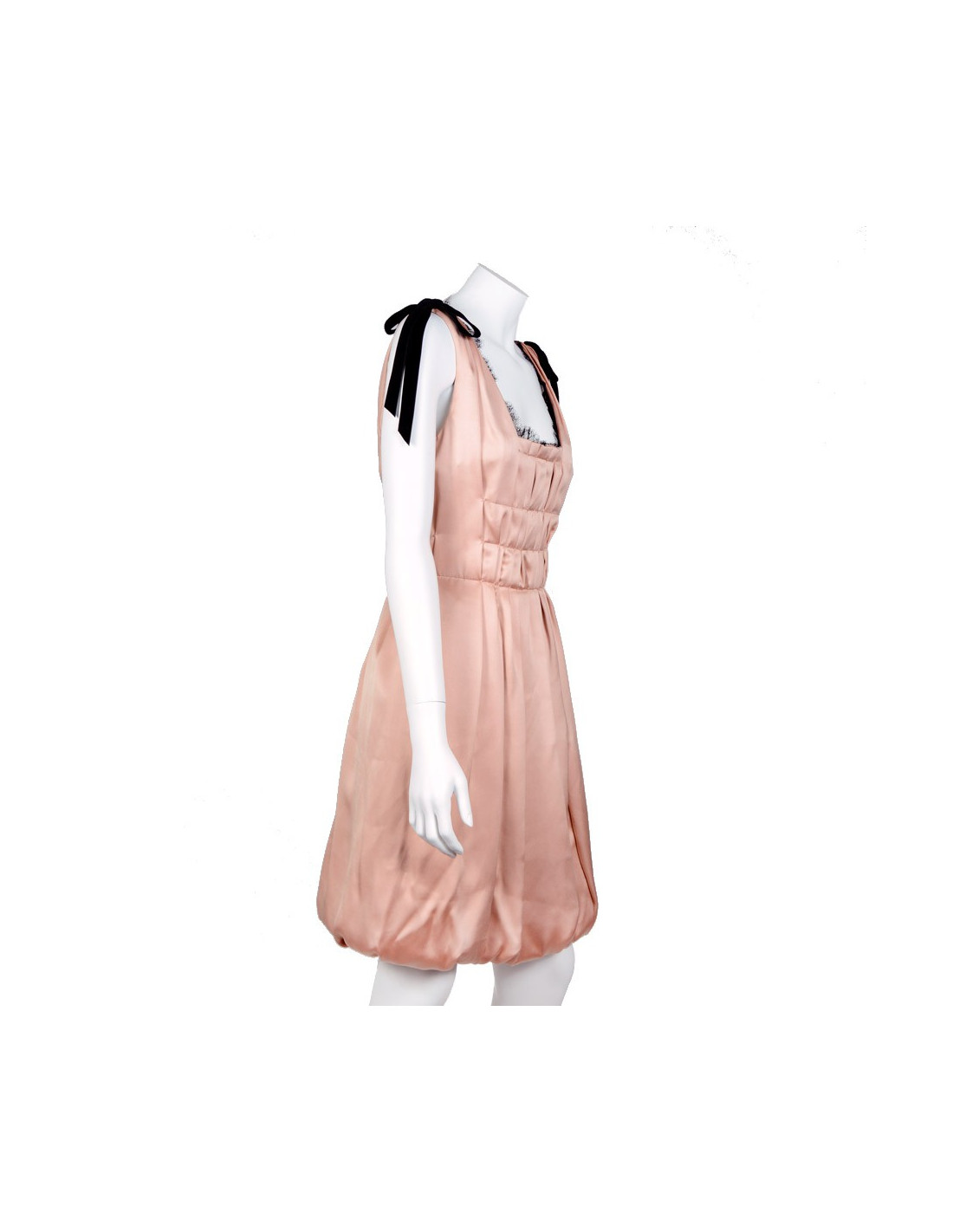 Evening dress Louis Vuitton in pink silk and Black Lace T38 (Made in France). Two pretty nodes enhance black velvet down the shoulder straps of silk. The square neckline is enhanced by Black Lace that emerges discreetly. It closes by a central rear zip. Size flat: Total length: 93 cm, waist: 36 cm Chest: 42 cm, width back under the armpits: 42 cm
