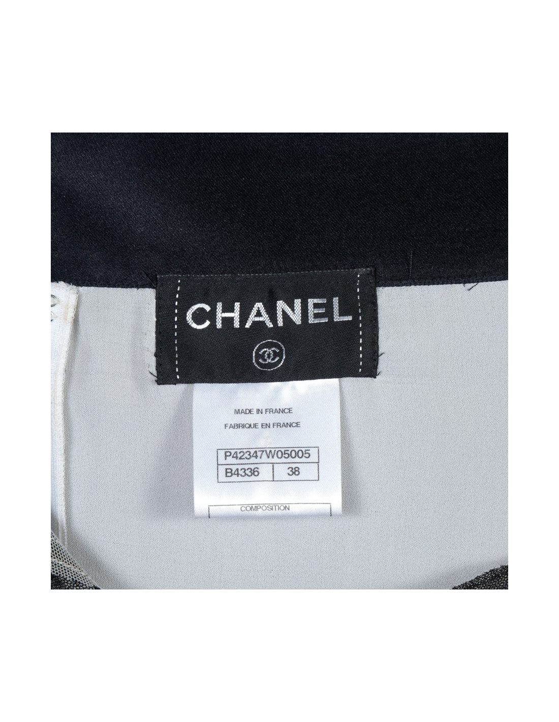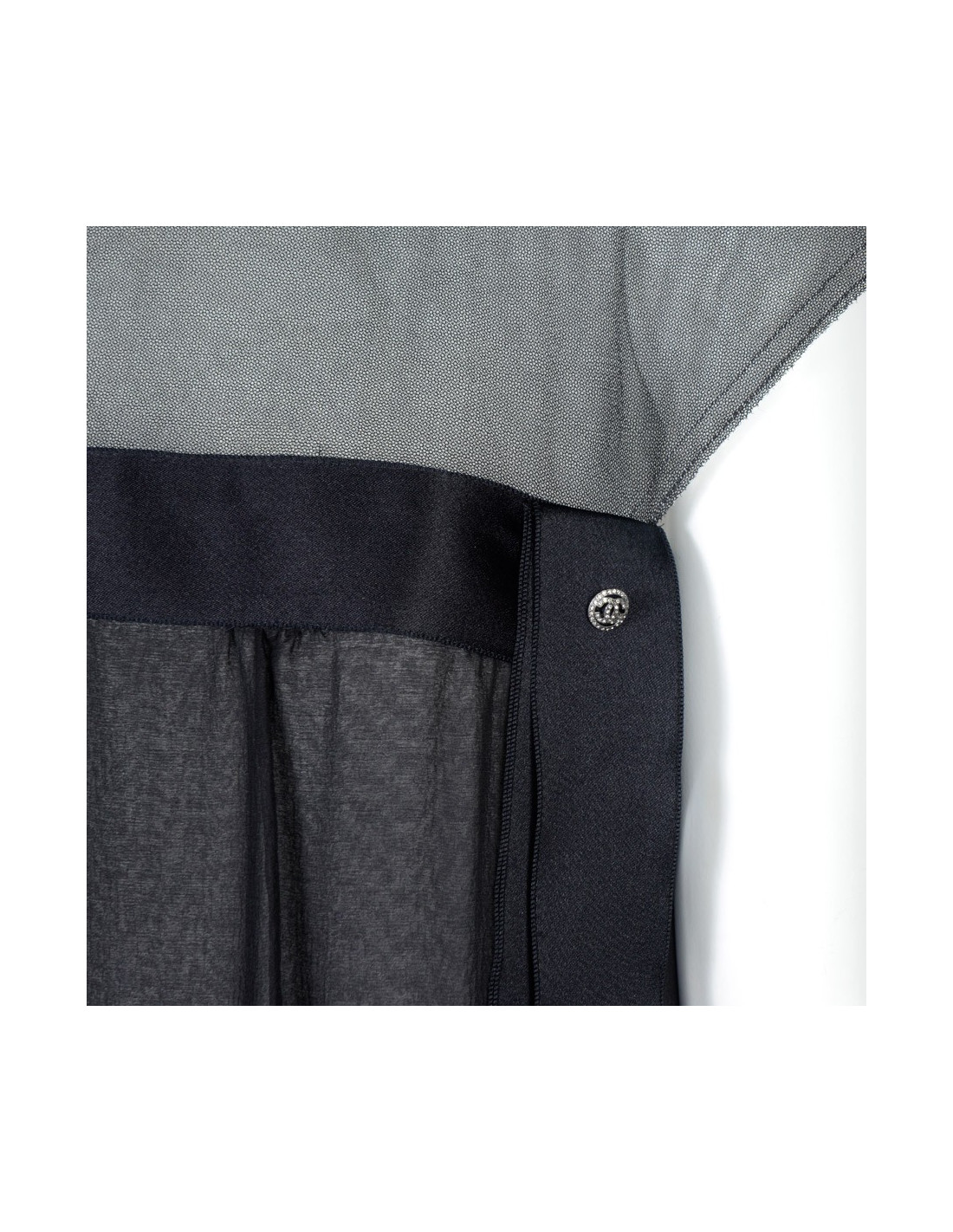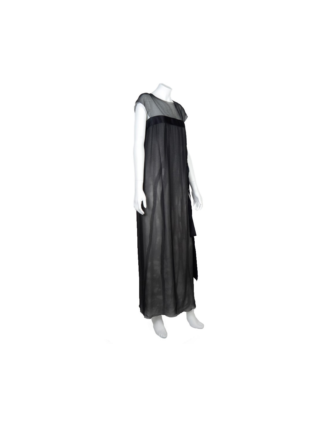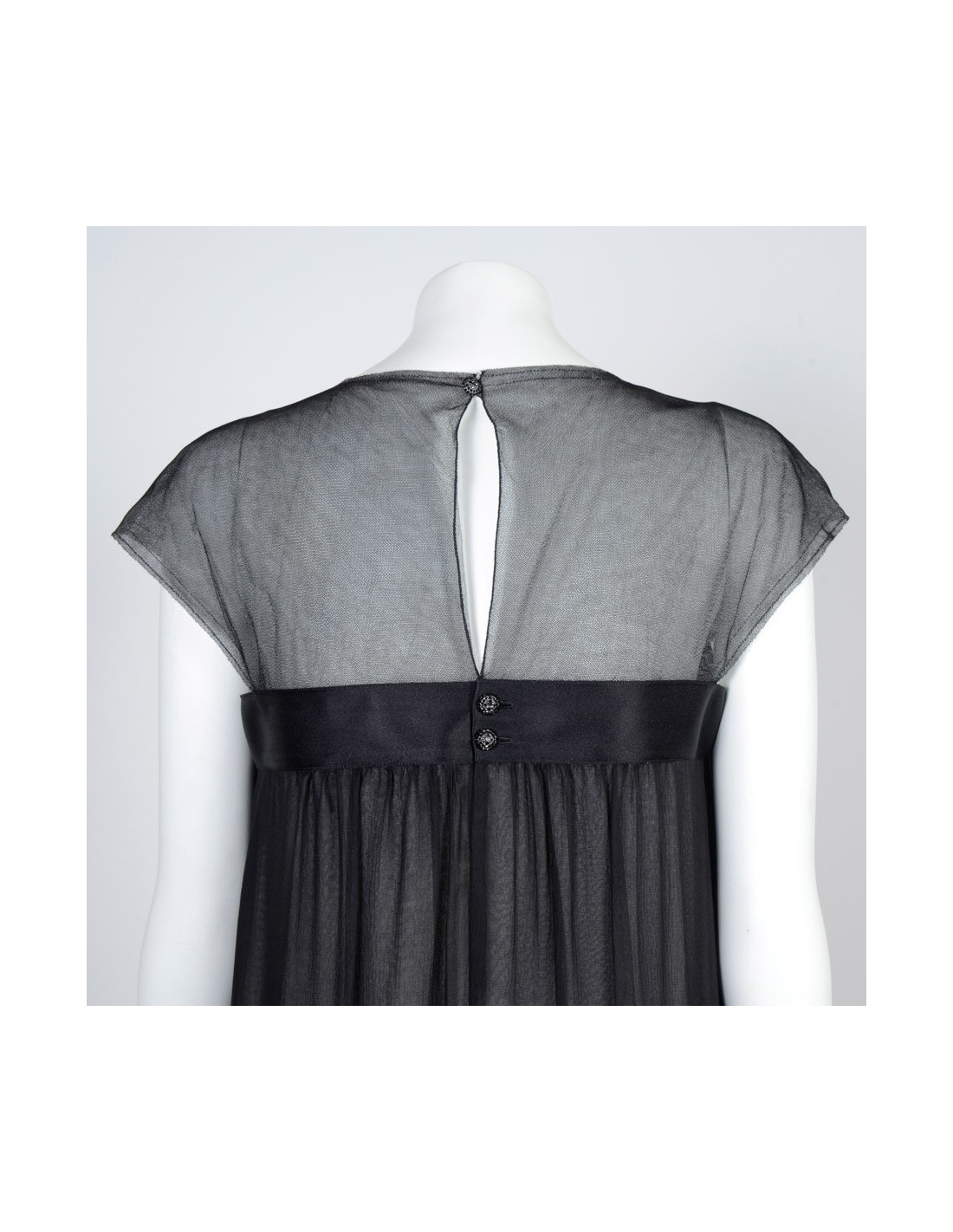 Beautiful evening dress from the House of Chanel in black silk. Size 38. Recent collection. Cut dress empire with a black silk ribbon that marks under the chest. The bust is black lace. Fluid and light, she'll know dressed up your evenings. It also has two liners in silk. The first white and the second in shades of gray in order to see these colors through the first black veil on top. See photos. In very good condition.