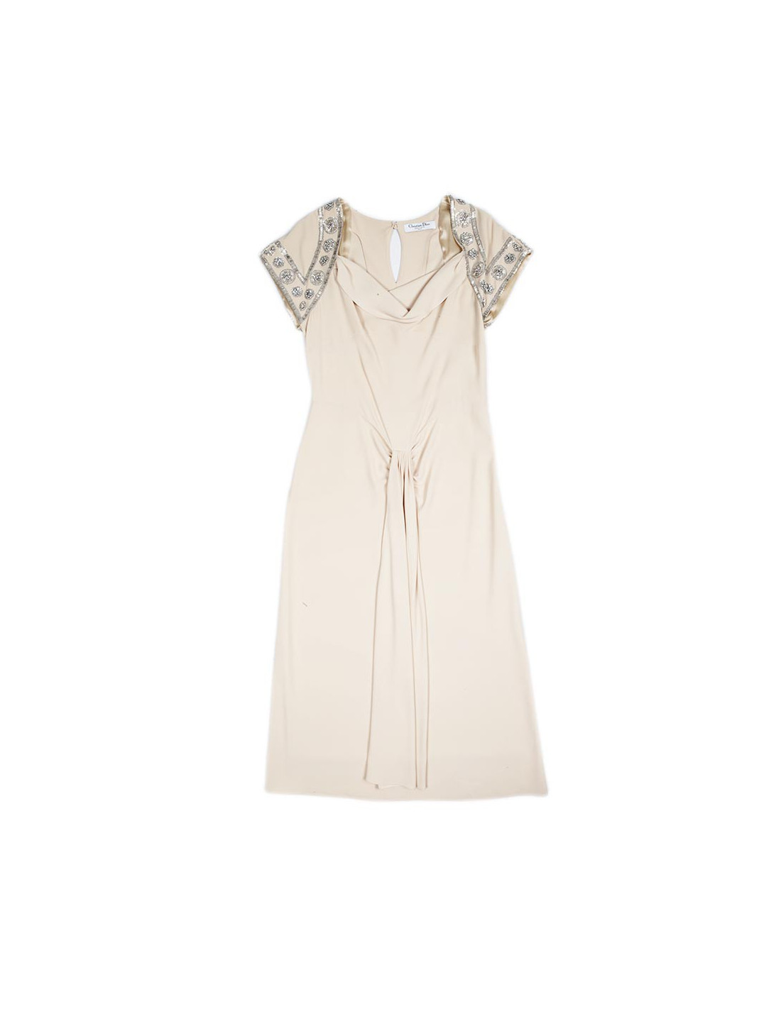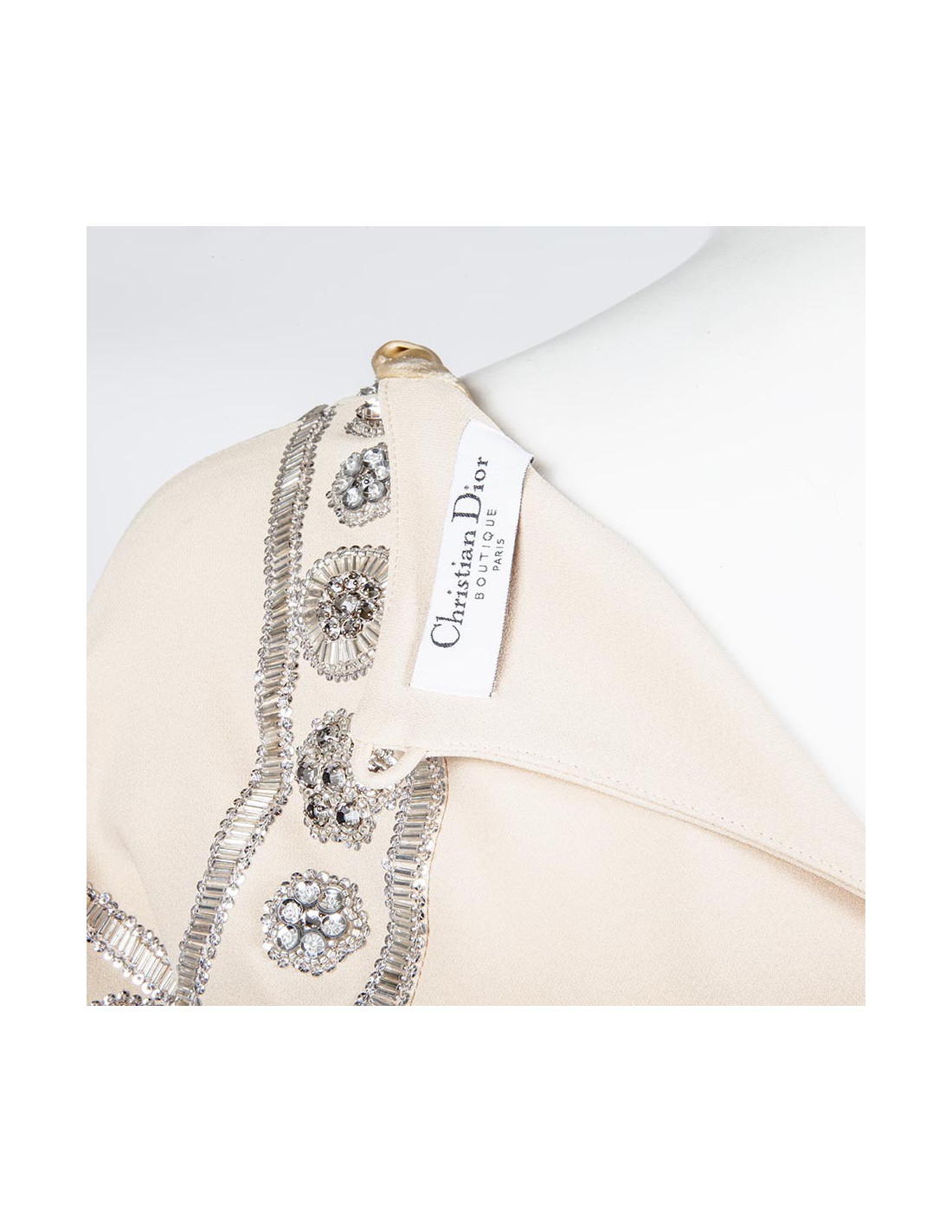 Christian Dior cocktail dress in beige silk crepe cut at an angle, embroidered with silver tubes and Swarovski crystals on the shoulders. Size 36FR