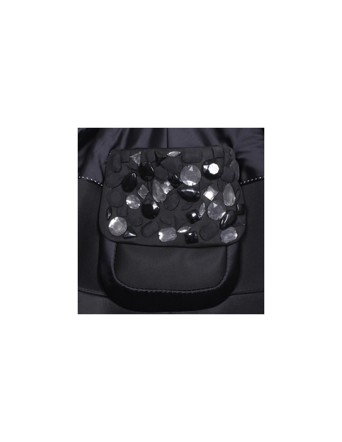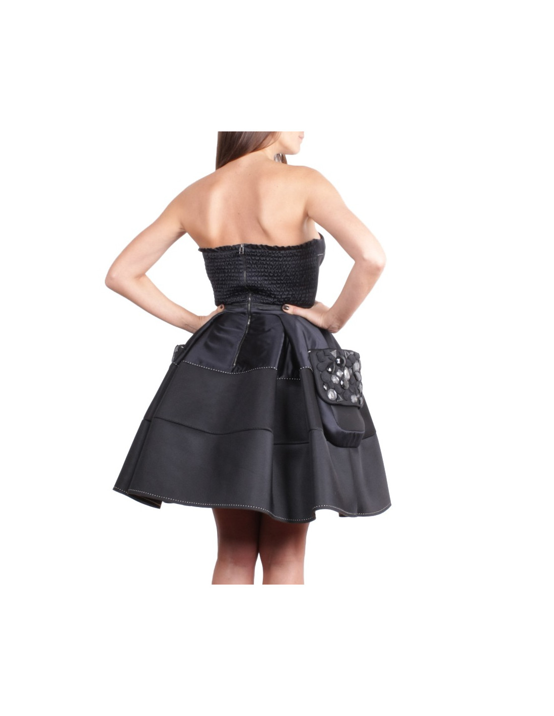 It's a strapless dress stitched white, skirt corole with large pockets on the sides encrusted with stones