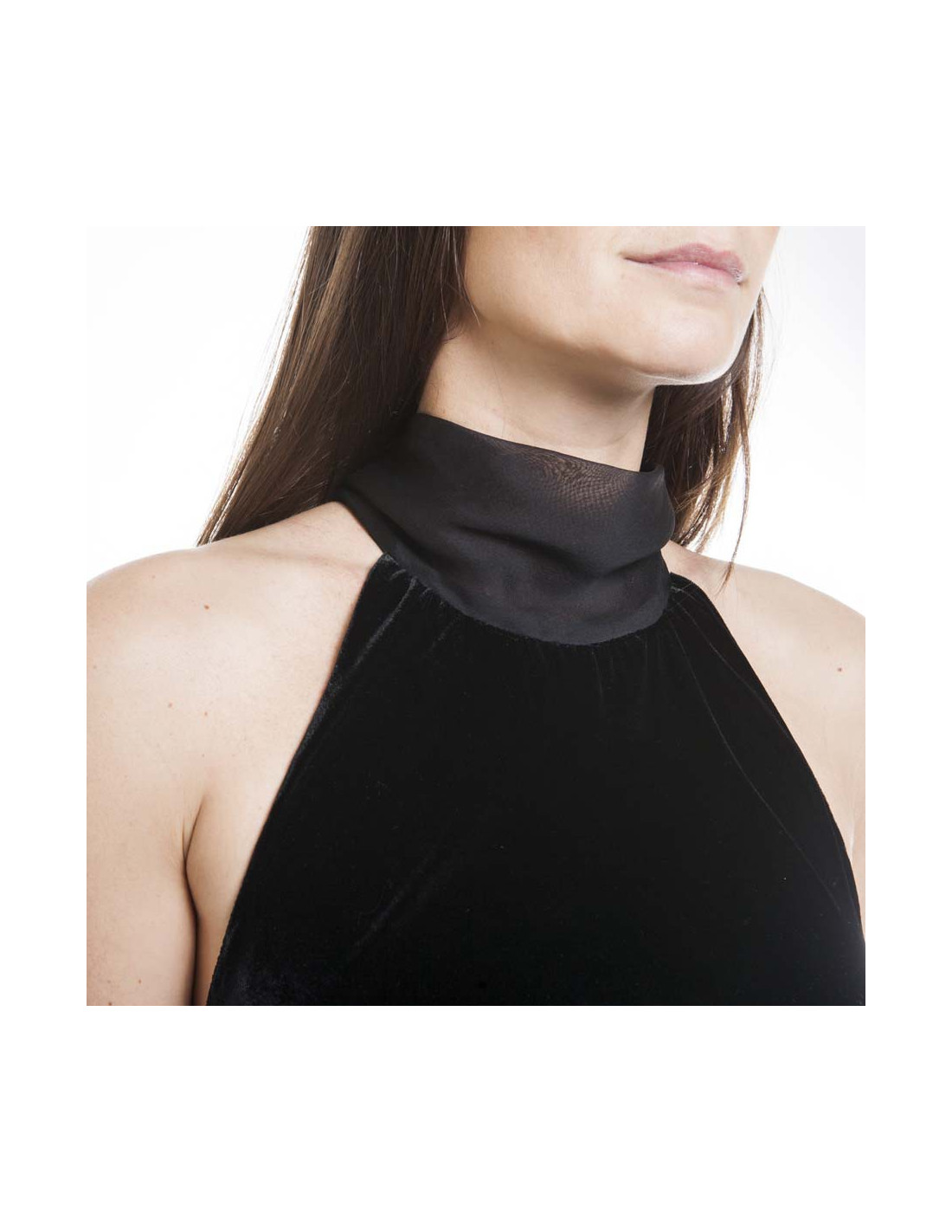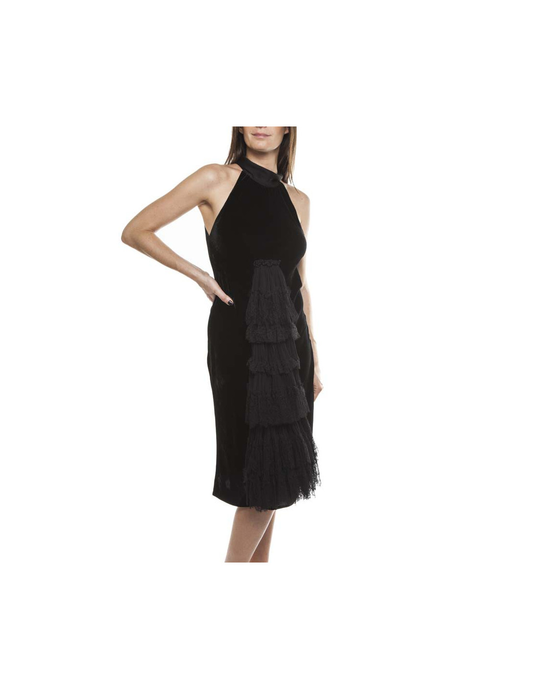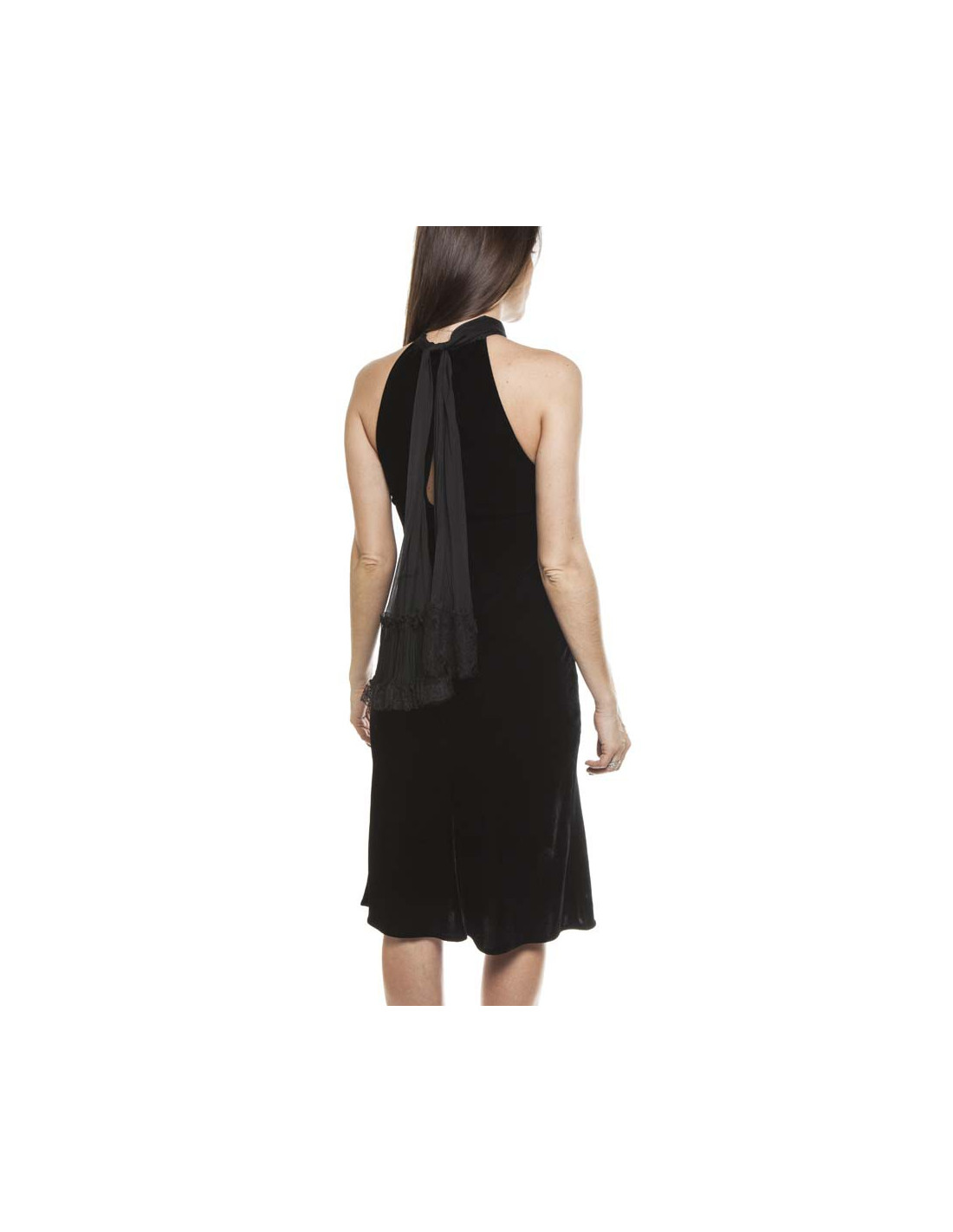 Exceptional cocktail/evening dress JEAN PAUL GAULTIER silk velvet black, American armhole with a long neck chiffon Chantilly lace and silk tie in the back.