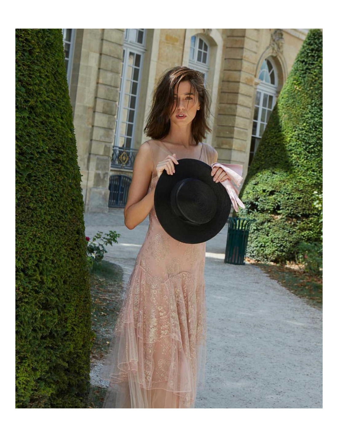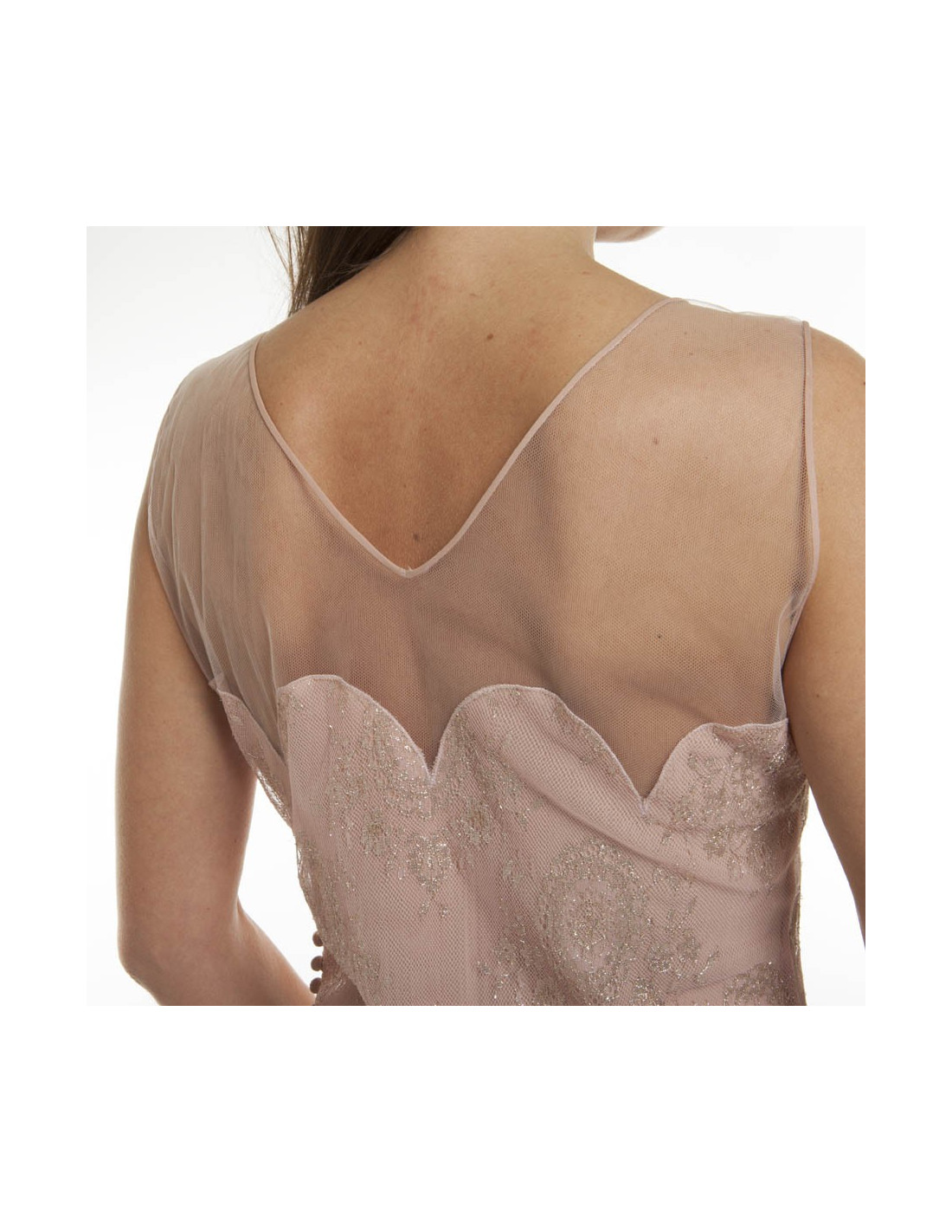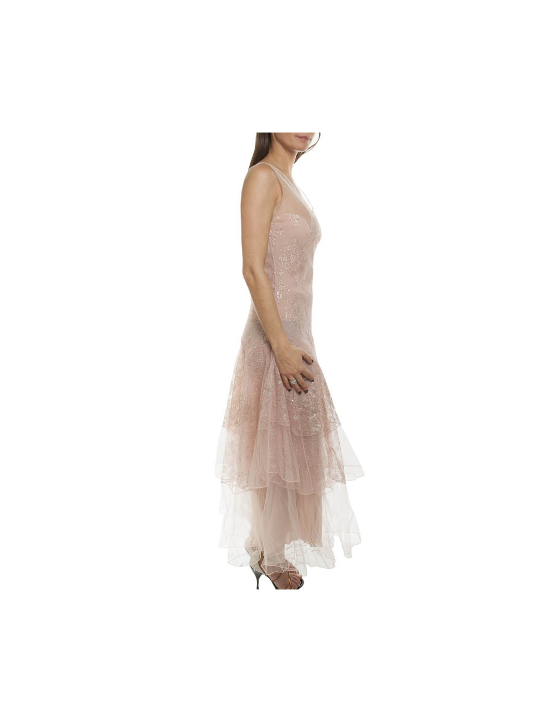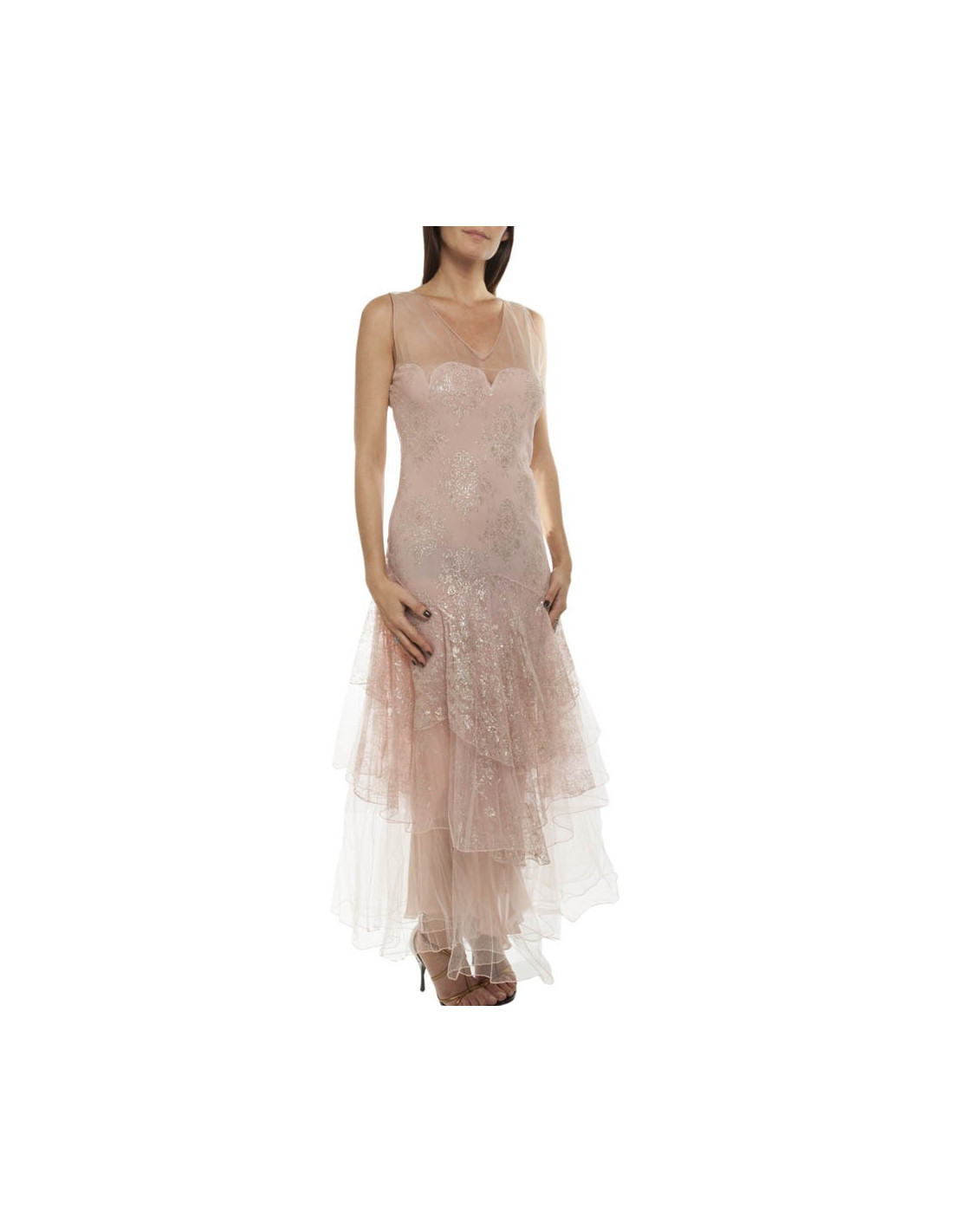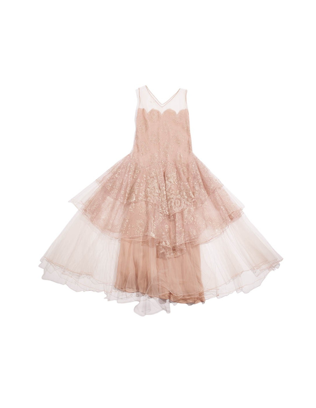 Gorgeous Christian Dior evening gown by John Galliano, in pale pink transparent tulle, inlaid with gold thread.