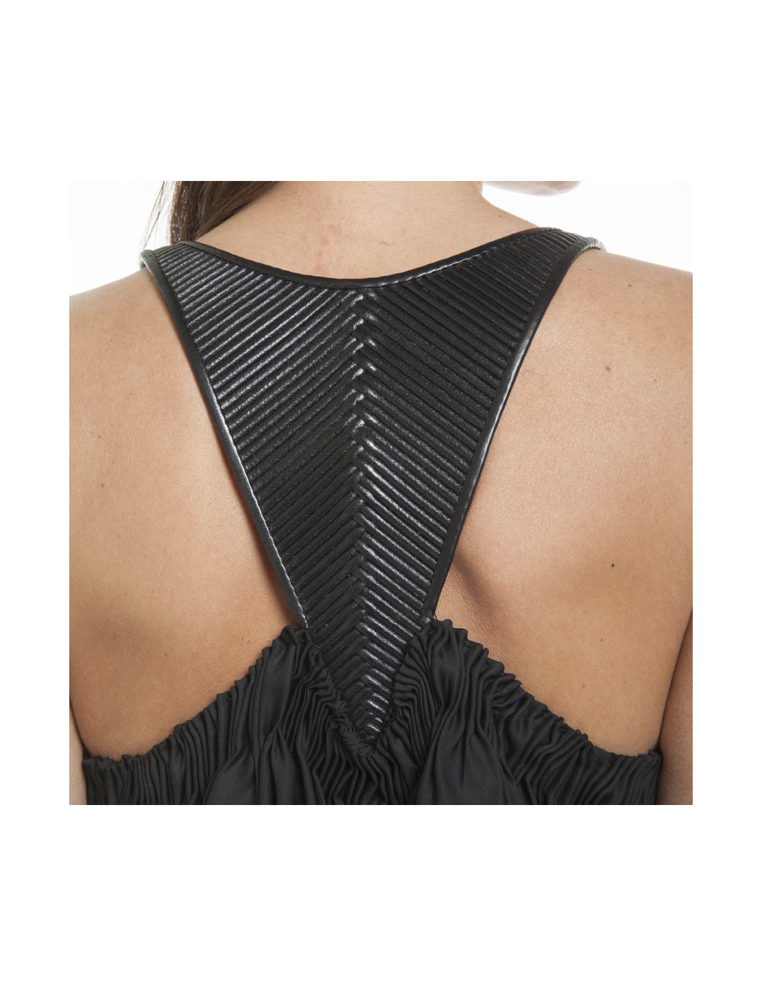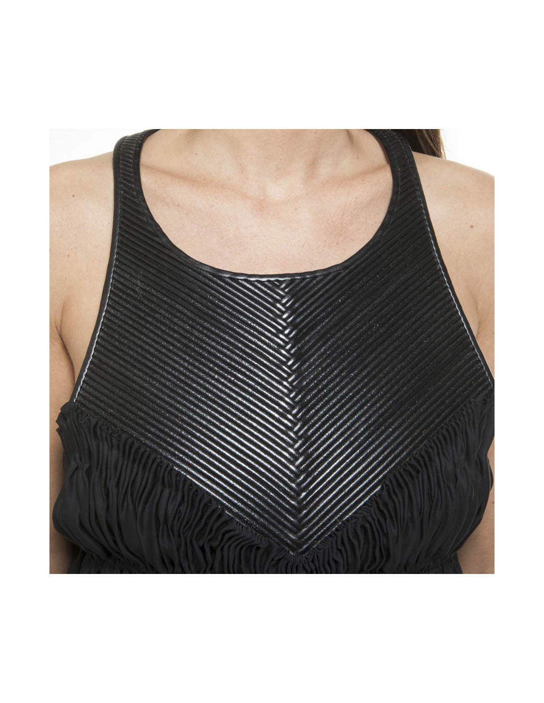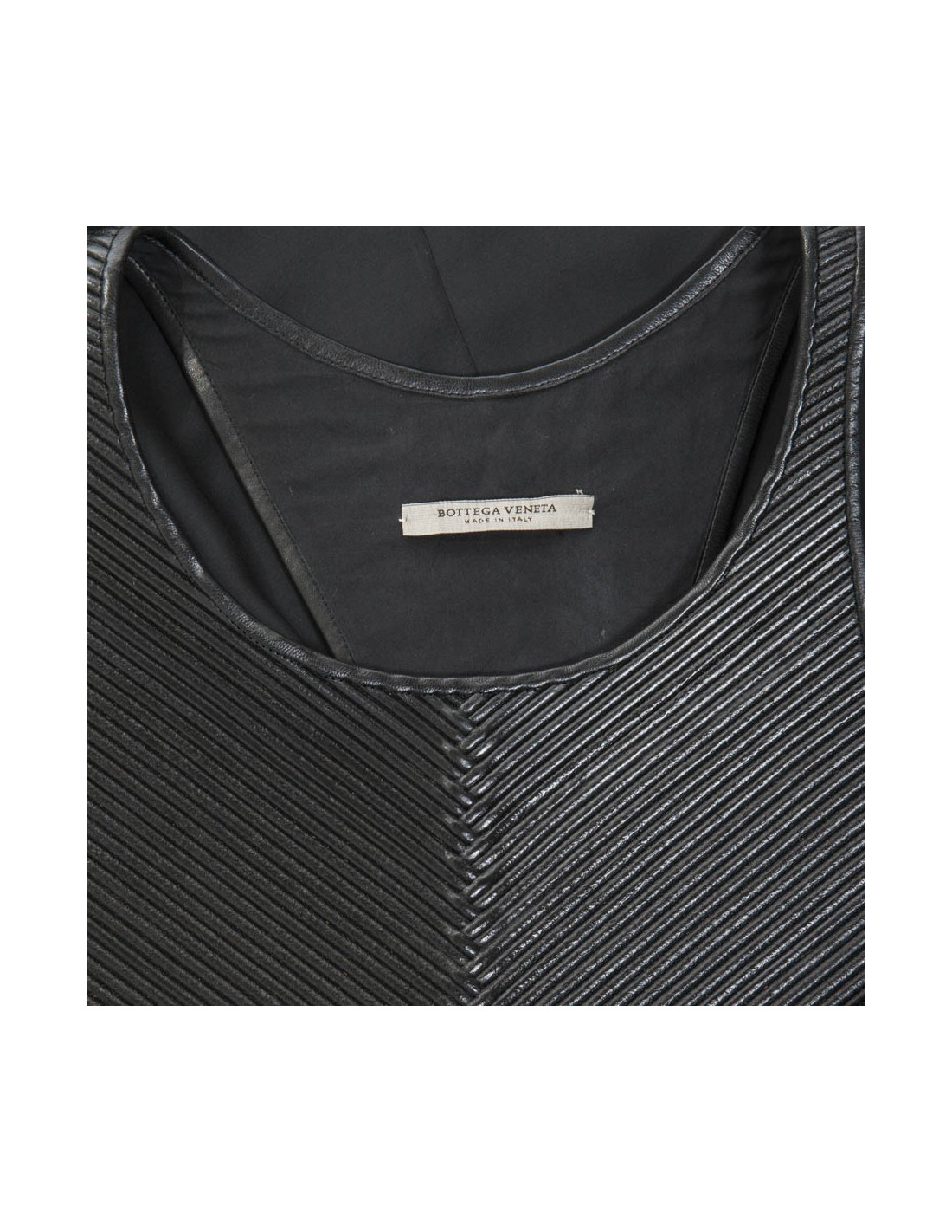 Exceptional dress Bottega Veneta, in black silk draped at the level of the chest under a corrugated black leather breastplate. It has 2 side pockets.