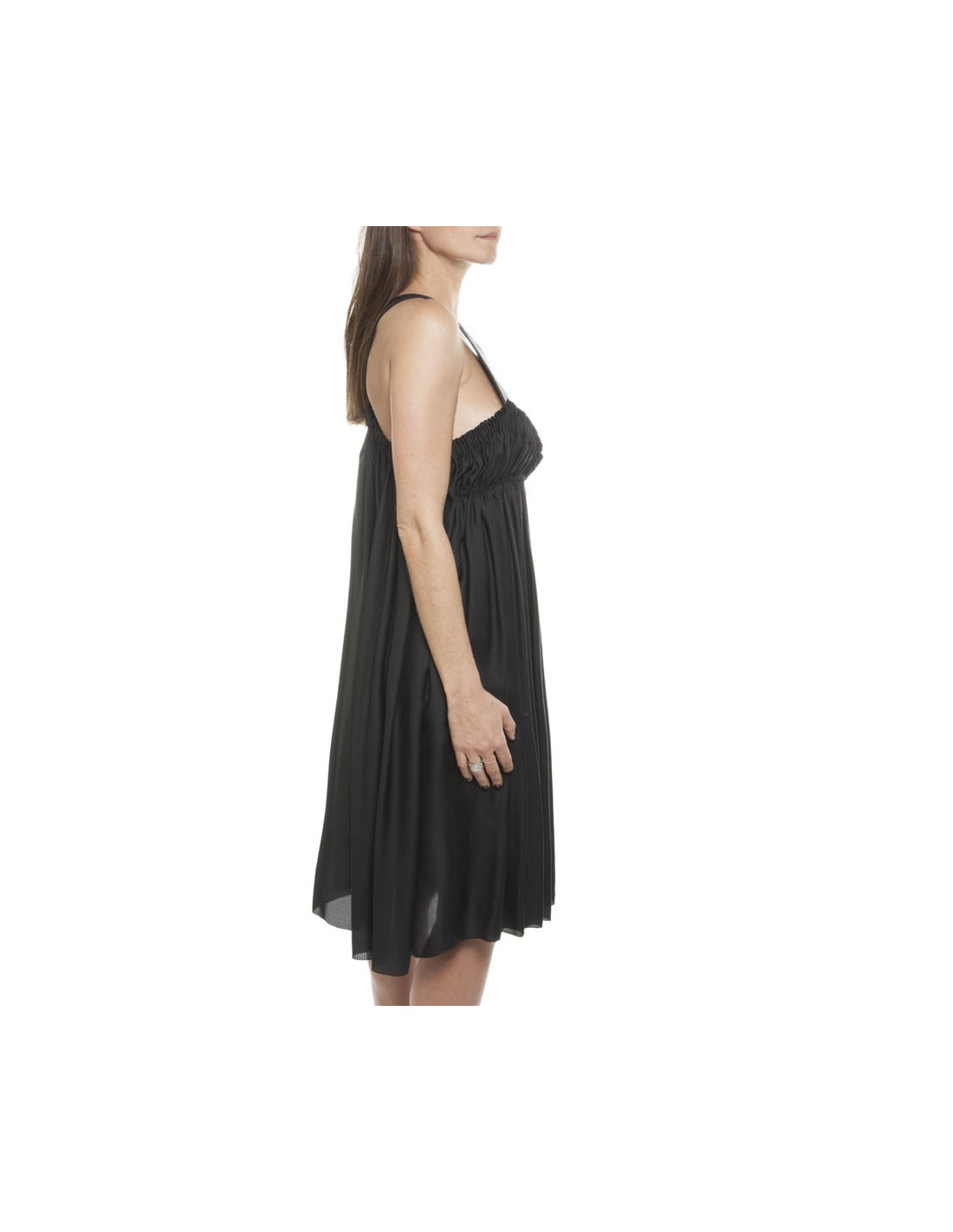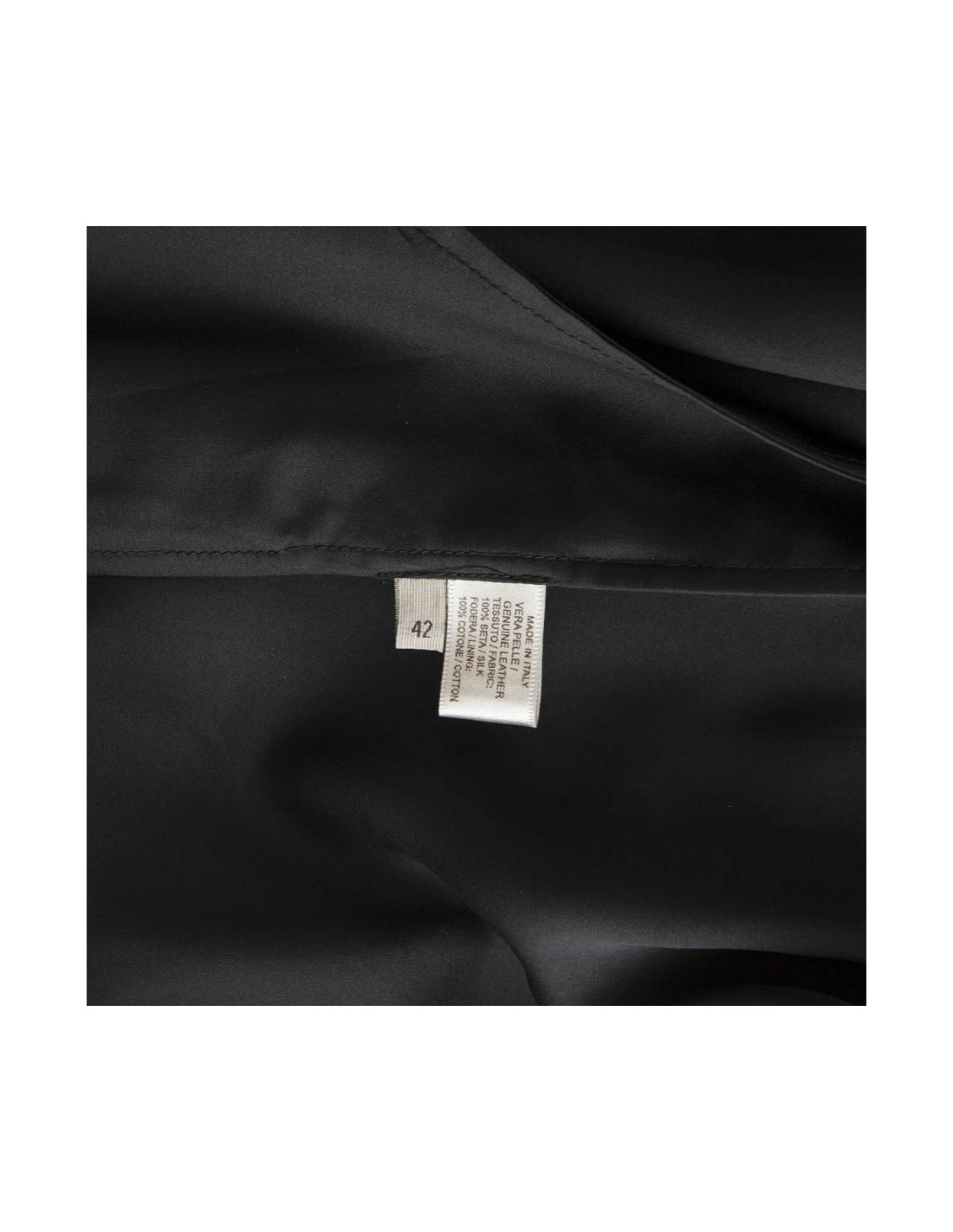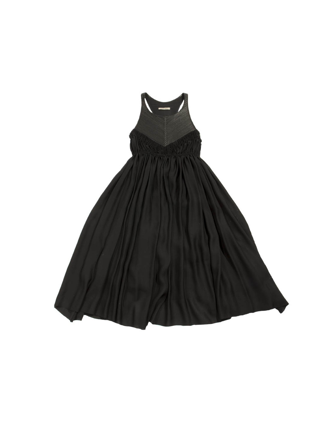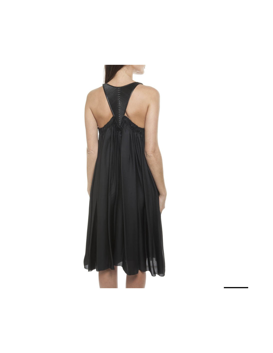 Exceptional dress Bottega Veneta, in black silk draped at the level of the chest under a corrugated black leather breastplate. It has 2 side pockets.