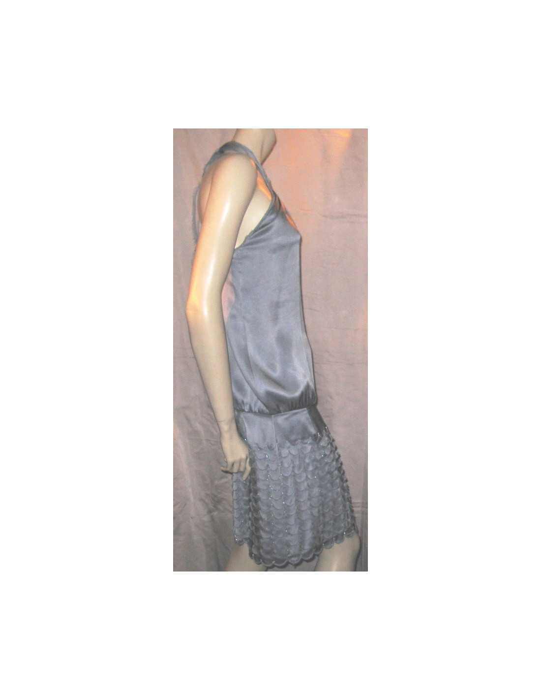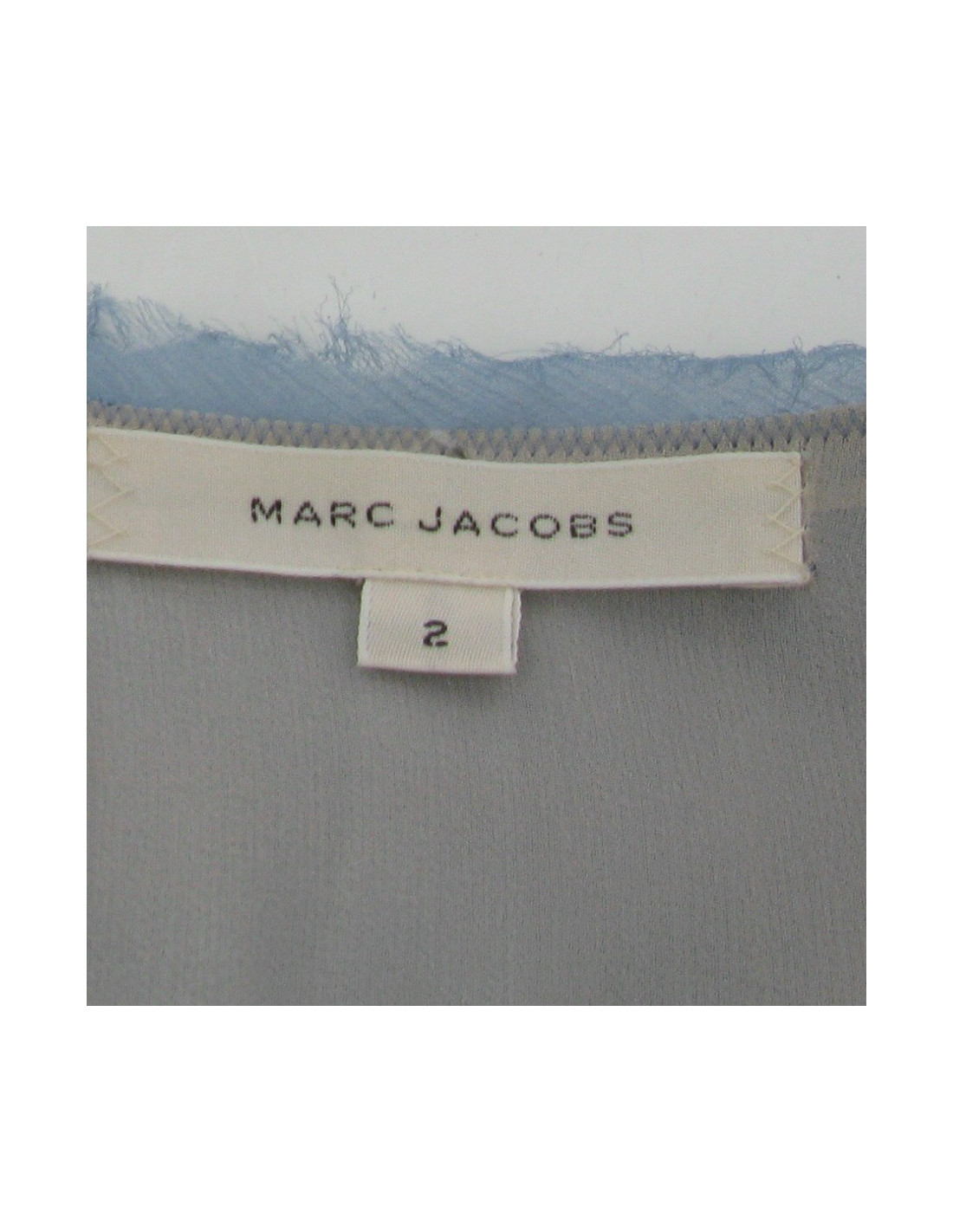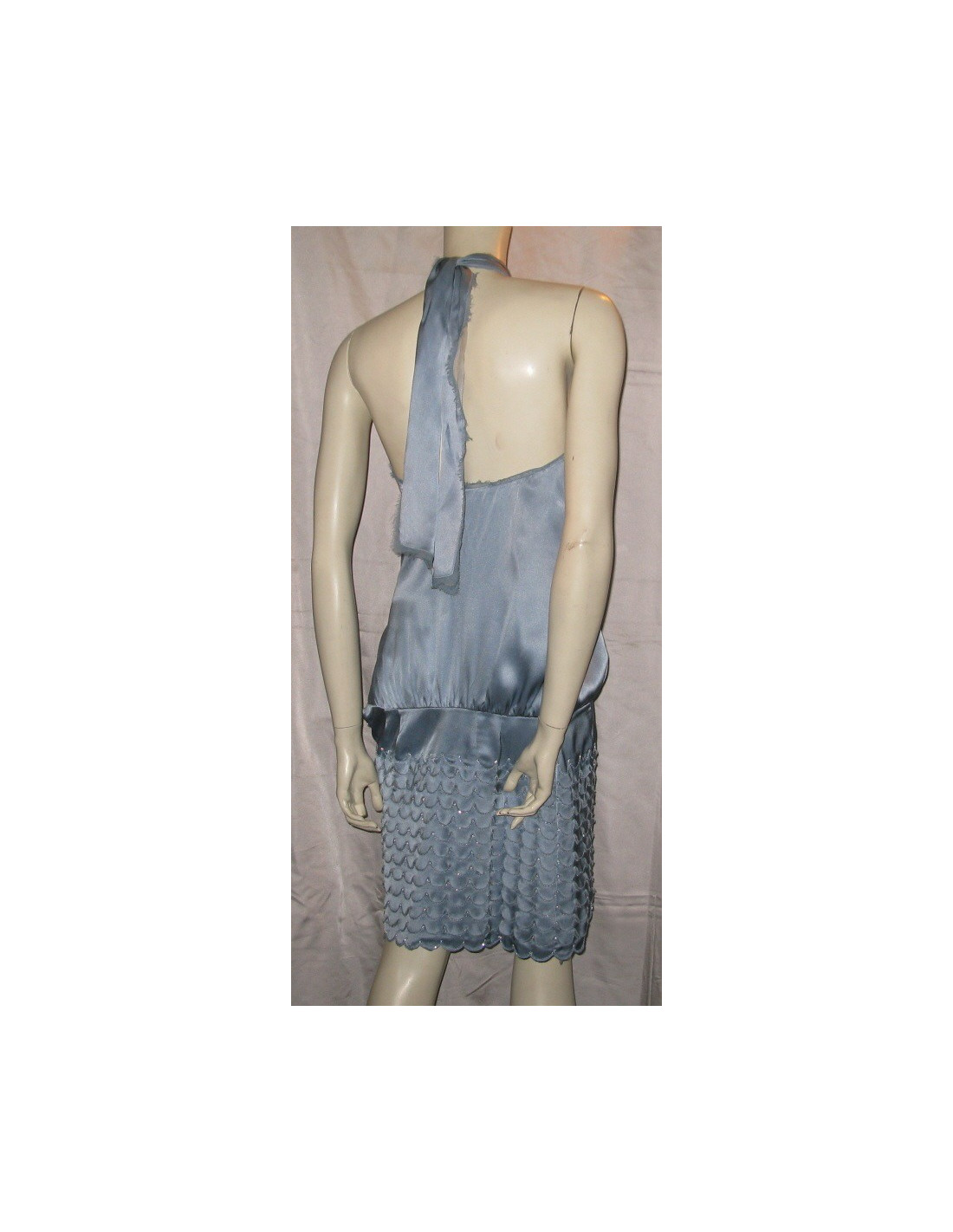 MARC JACOBS dress in blue silk T2 is a french T34. The bottom of the dress is embroidered with Rhinestones and pearls, silk is cut for a scale rendering.