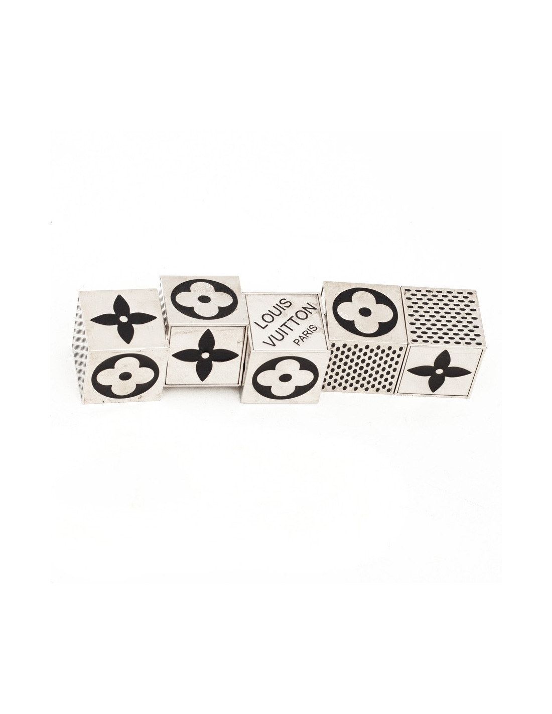 This LOUIS VUITTON Cube game is made up of five magnetic chromed steel cubes. The faces represent the monogram of the brand. There is only one way that cubes can be assembled correctly.