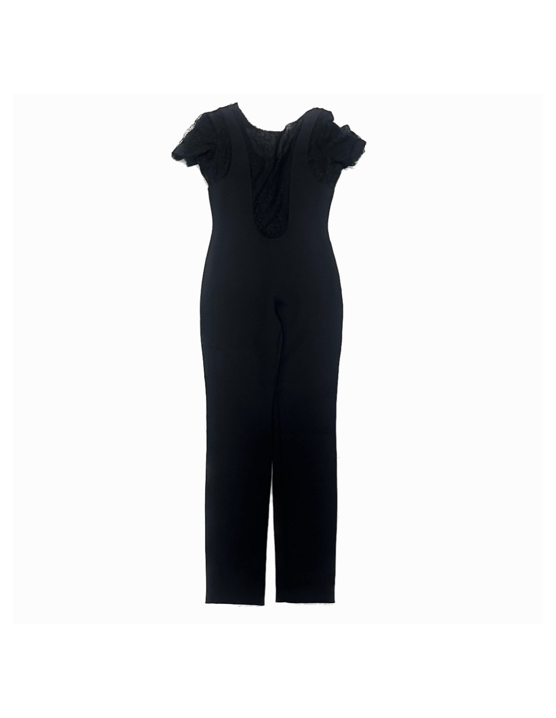 Details : close-fitting pantsuit, stretch fabric, black lace transparency, Chanel Paris buttons on back